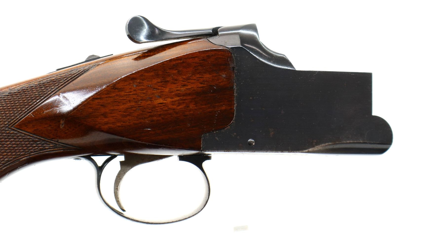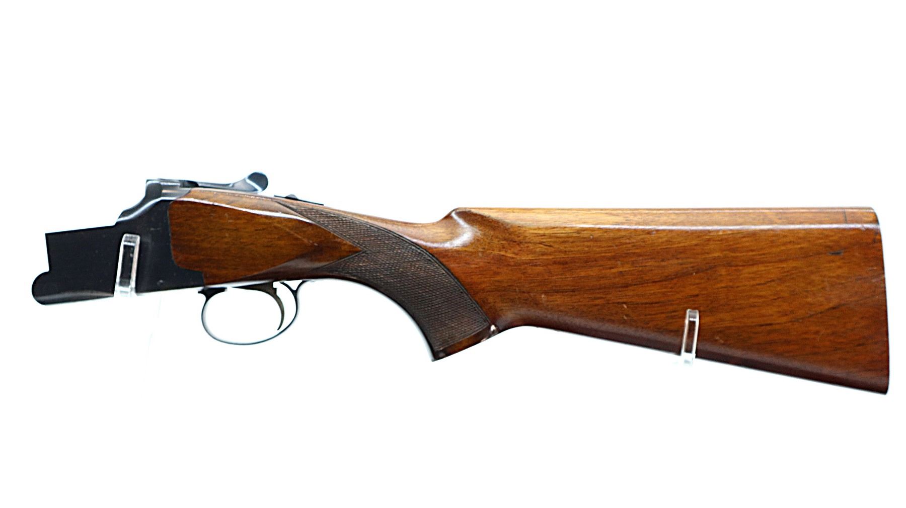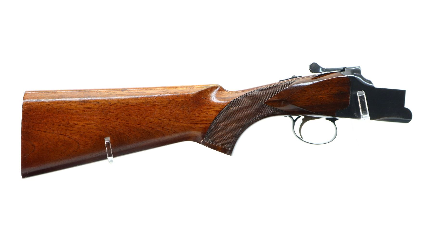 Main Description: Has a blued receiver with selective safety, firing pins, cocking lever, trigger and guard. One piece wood stock, checkered pistol grip, missing butt plate, screws, barrel and forearm assemblies.