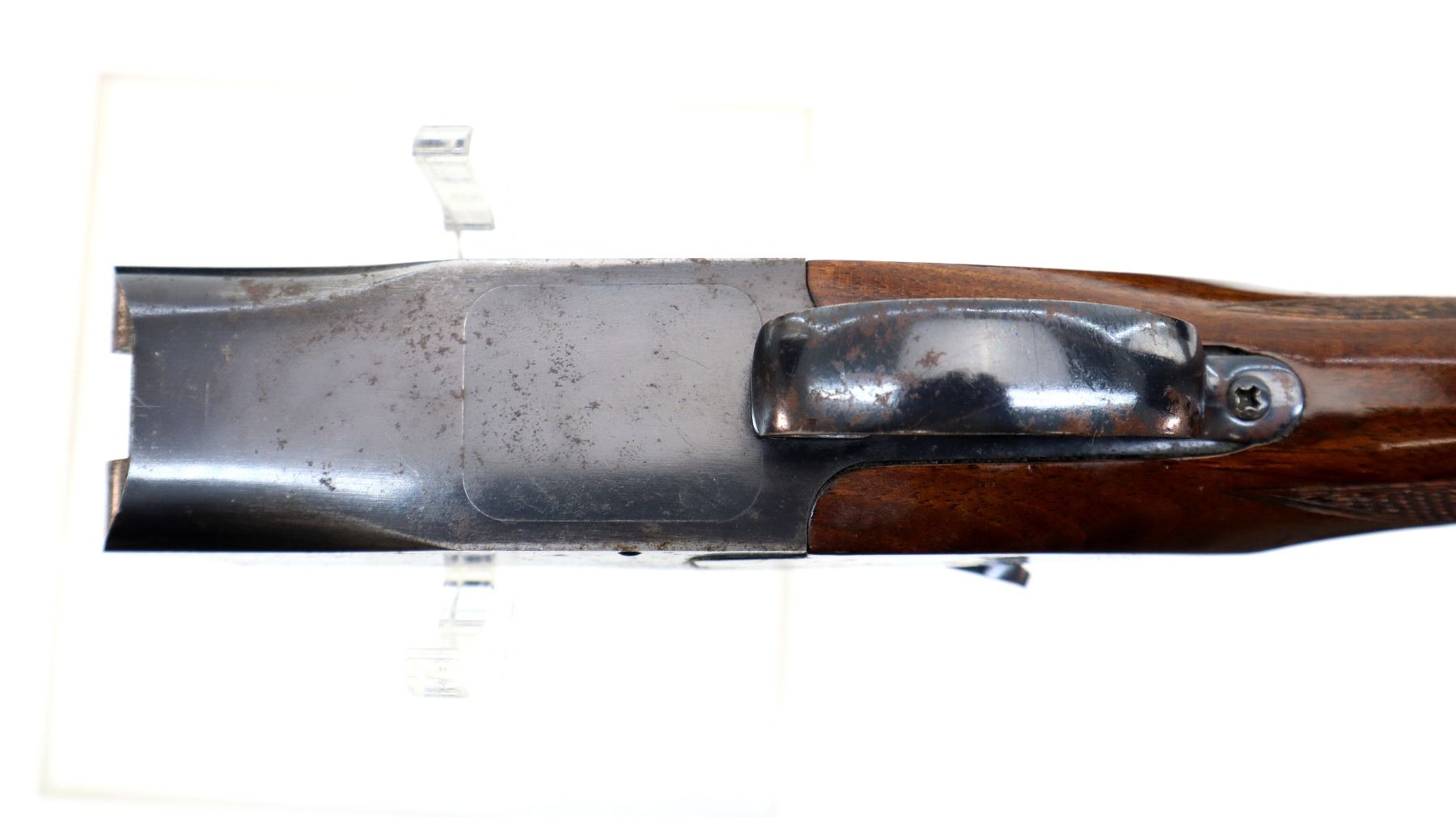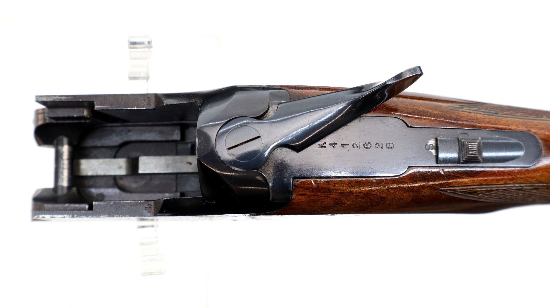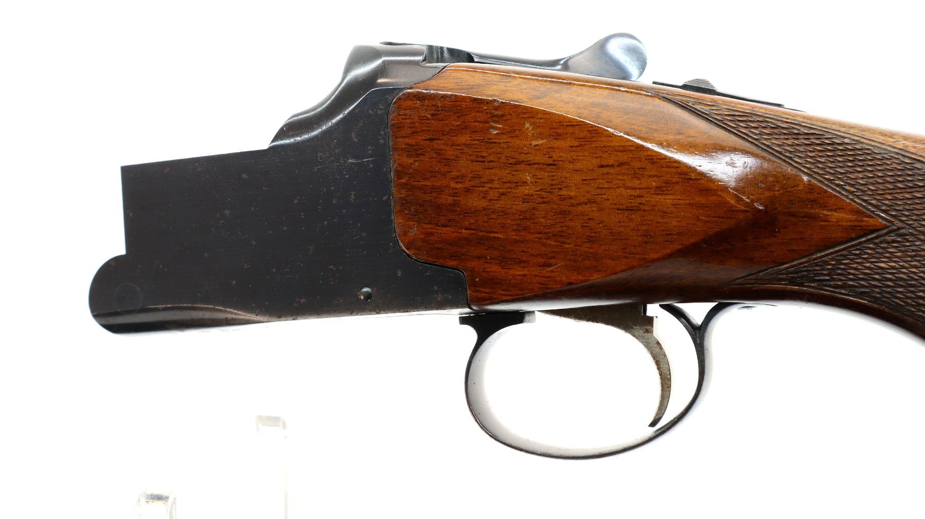 Main Description: Has a blued receiver with selective safety, firing pins, cocking lever, trigger and guard. One piece wood stock, checkered pistol grip, missing butt plate, screws, barrel and forearm assemblies.