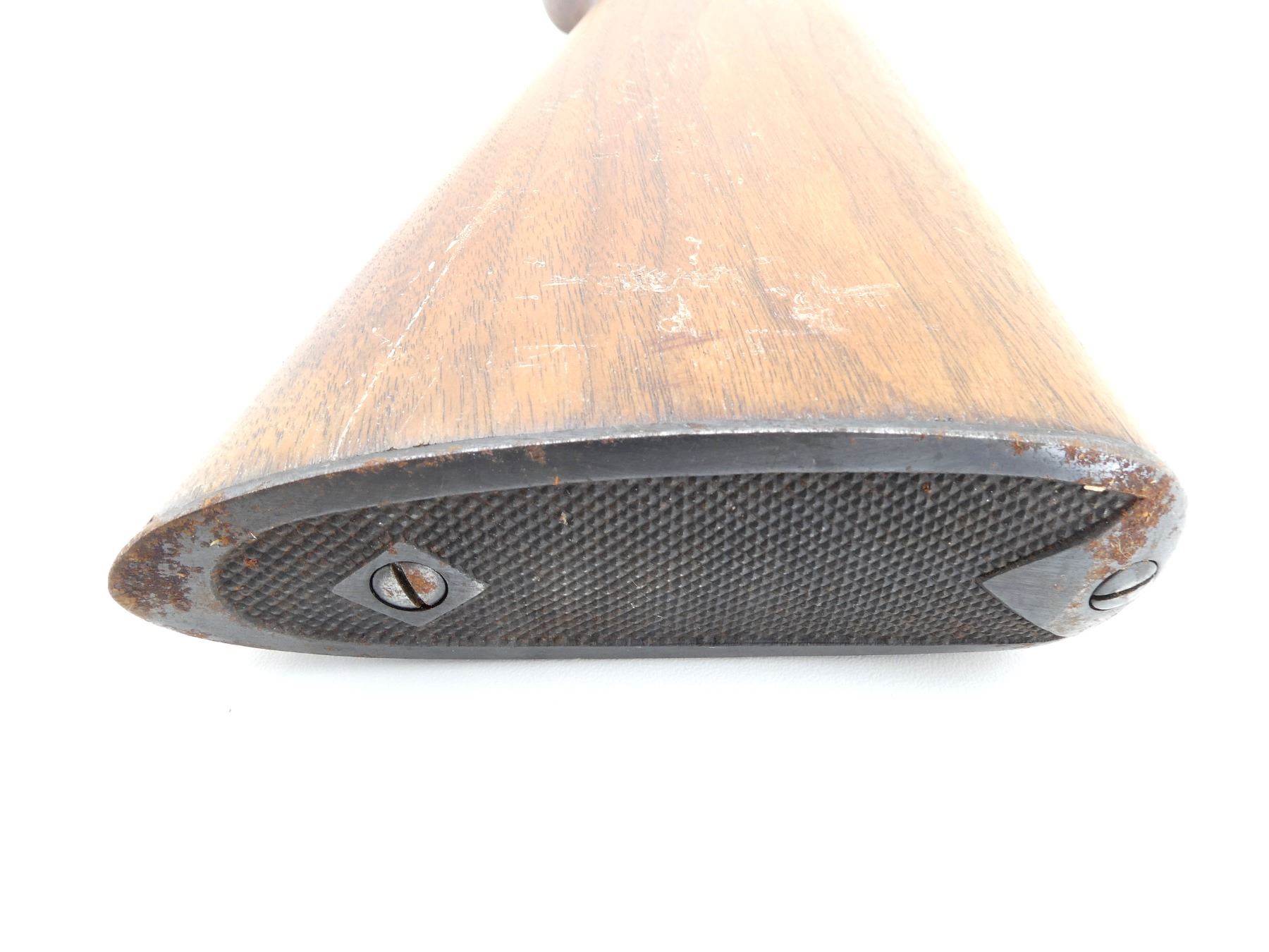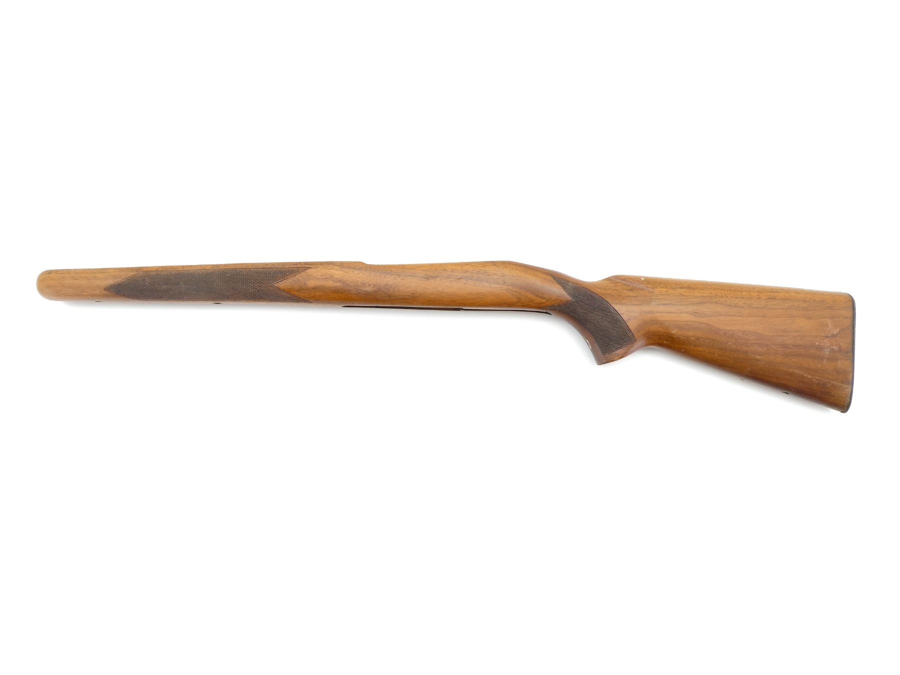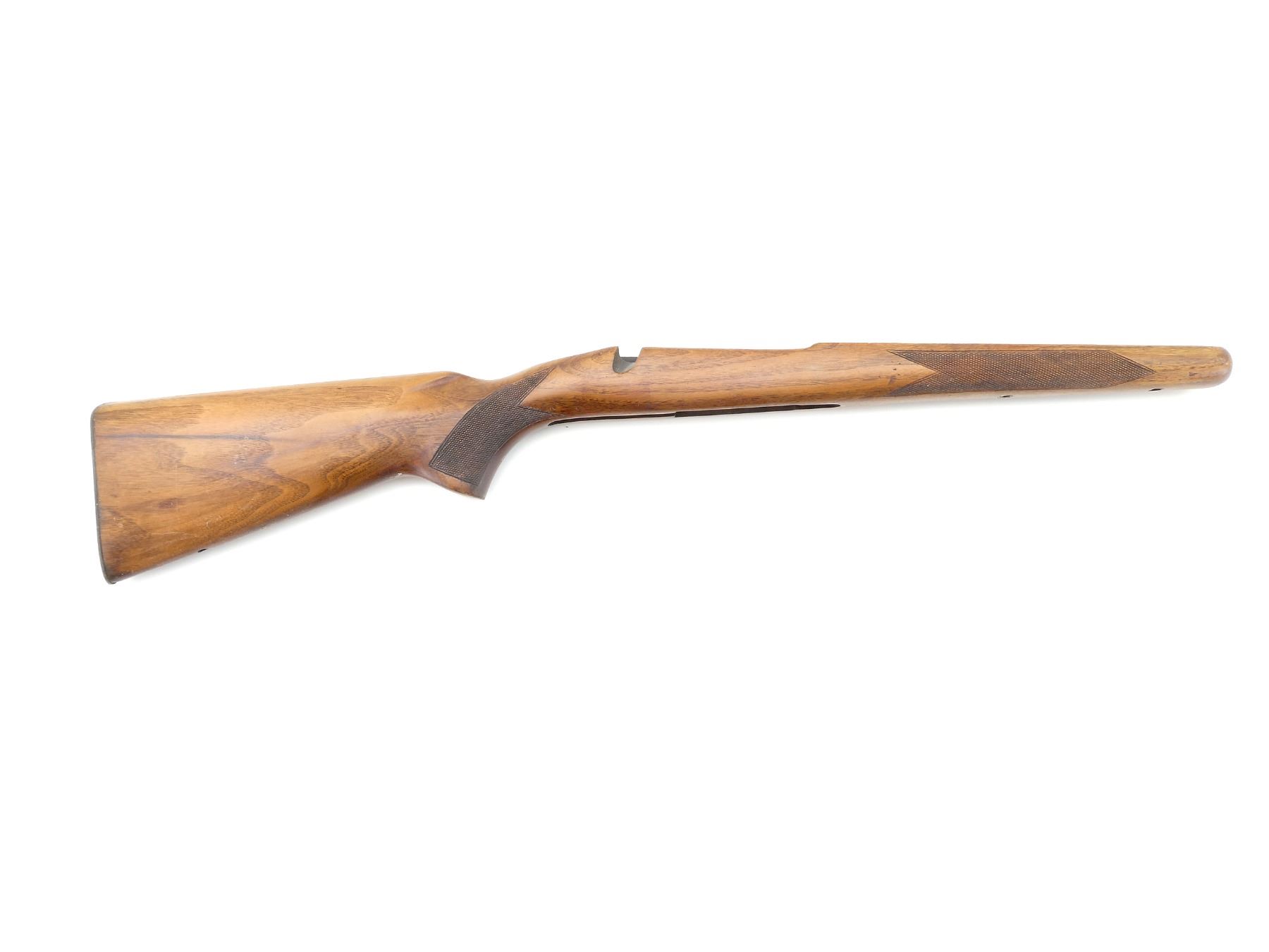 (1) WOODEN STOCK, CHECKERED, UNMARKED, OVERALL LENGTH APPROX. 32.25". MAY REQUIRE FITTING. SEE PHOTOS.