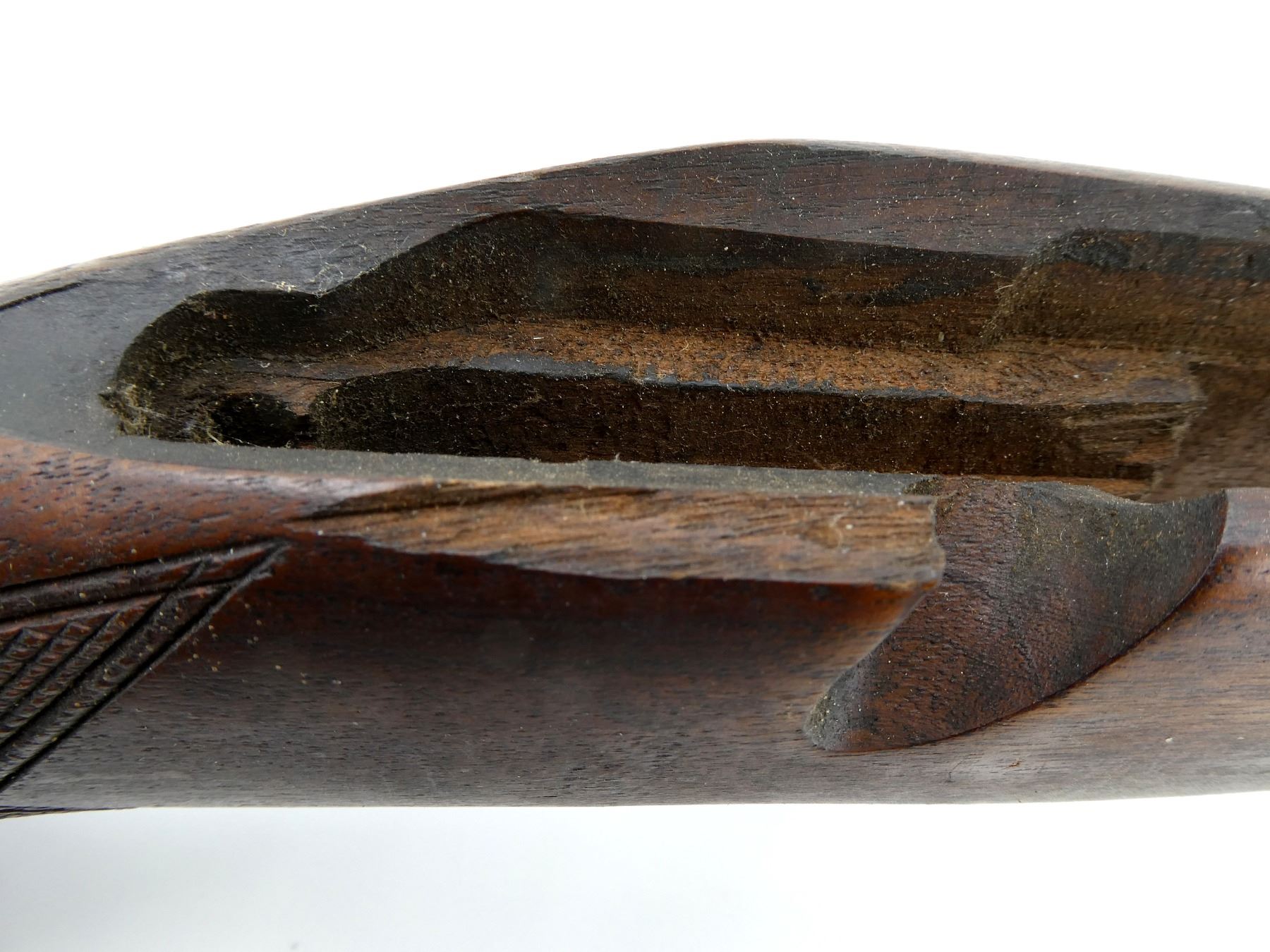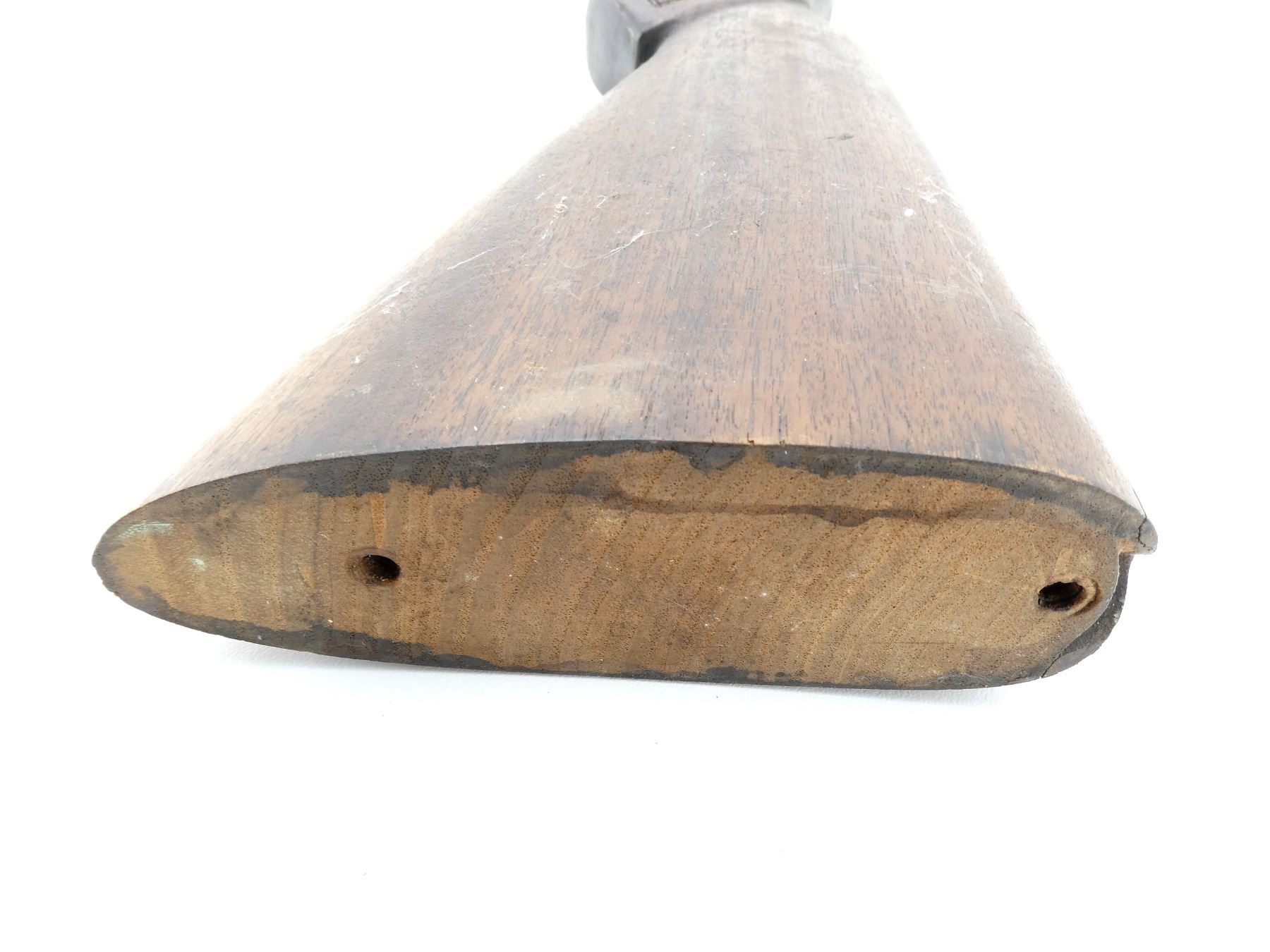 (1) WOODEN STOCK, CHECKERED, UNMARKED, WITH MISSING BUTT PLATE, OVERALL LENGTH APPROX. 32". MAY REQUIRE FITTING. SEE PHOTOS.