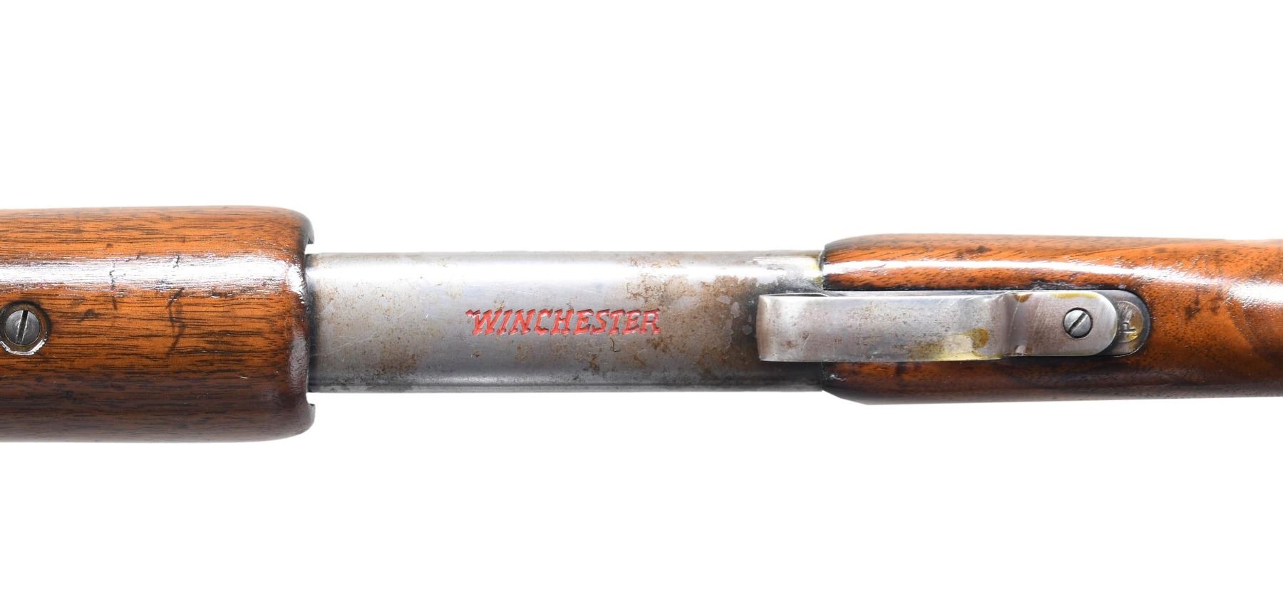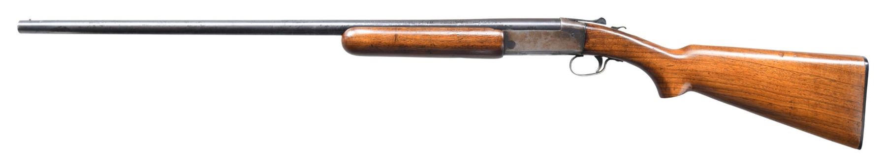 Cal. 20 Ga., 2 3/4". NSN. Bbl. 28" w/ steel bead & full choke. Top break action has ejector & external hammer. Walnut stock set w/ Win. buttplate. CONDITION: fair barrel blue with large portions of varnish applied showing. Action brown patina with areas of varnish. Sanded & refinished wood shows marks. Shiny bore with light fouling. (25-2566/MD). CURIO. $250-350.