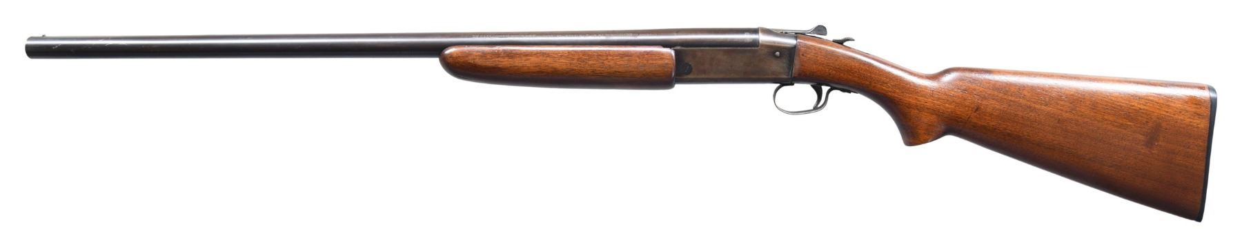SHOTGUN. Cal. 12 Ga., 2 3/4". NSN. Originally mfg. 1936-1948. Bbl. has been cut to 27 1/8" with steel bead; bore choke measures IC. Top break action with ejector & manual cock hammer. Bottom of frame has red paint filler "WINCHESTER". Right side of frame stamped "Y3280". Walnut stock set with Win. buttplate. CONDITION: fair blue mixed with brown patina showing scattered light marks & spots of corrosion; heavy cleaning scratches on sides of receiver. Very good original wood finish with scattered impressions. Shiny bore shows light fouling. (25-1905/MD). MODERN. $200-350.