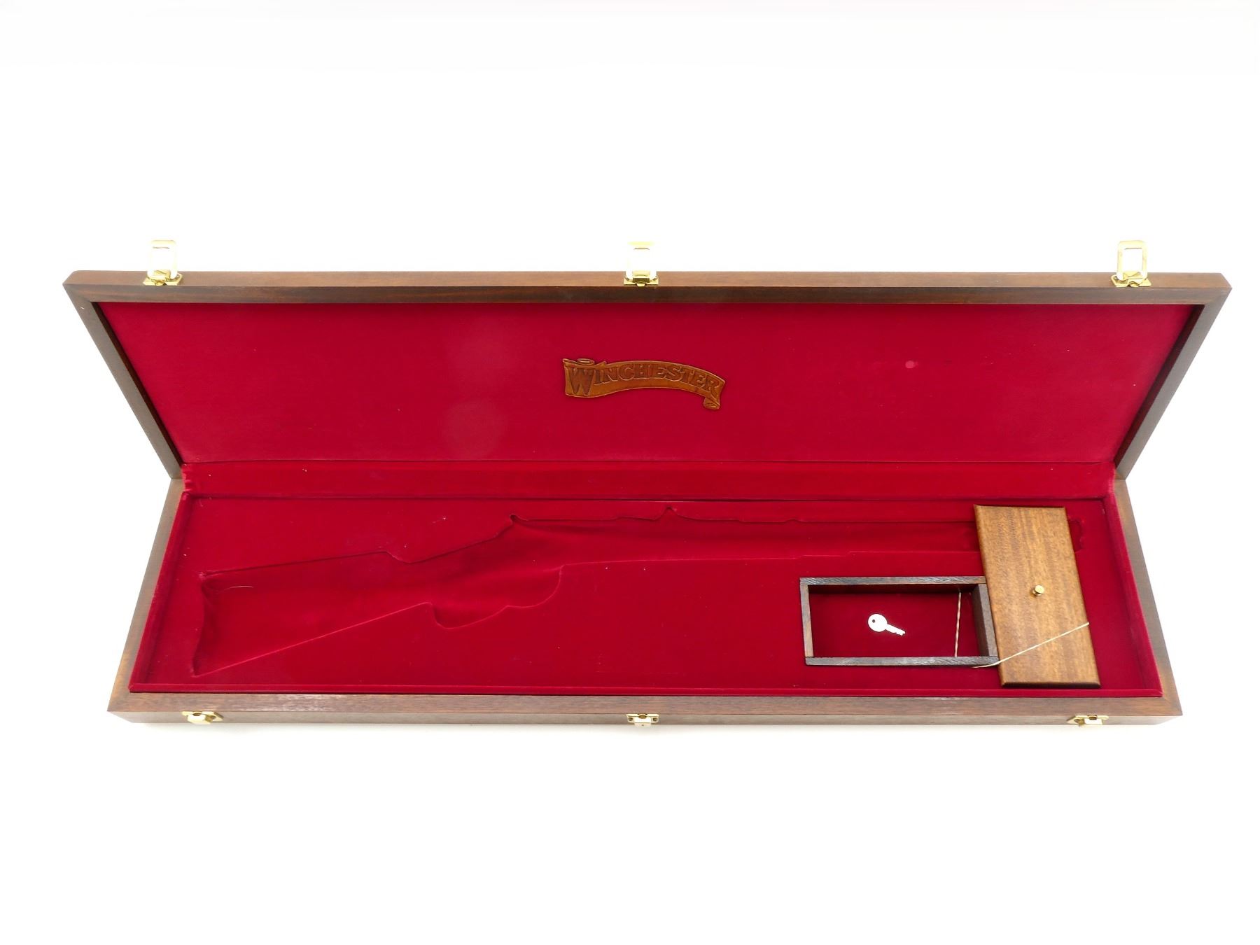 LOT INCLUDES; (1) WOODEN WINCHESTER GUN BOX, (3) LATCHES, (1) LOCKING WITH KEY, (1) WOODEN BOX INSIDE, CUT AWAY FOR LEVER GUN, APPROX. OVERALL LENGTH 40", SHOWS WEAR AND TEAR FROM USAGE, SEE PHOTOS.