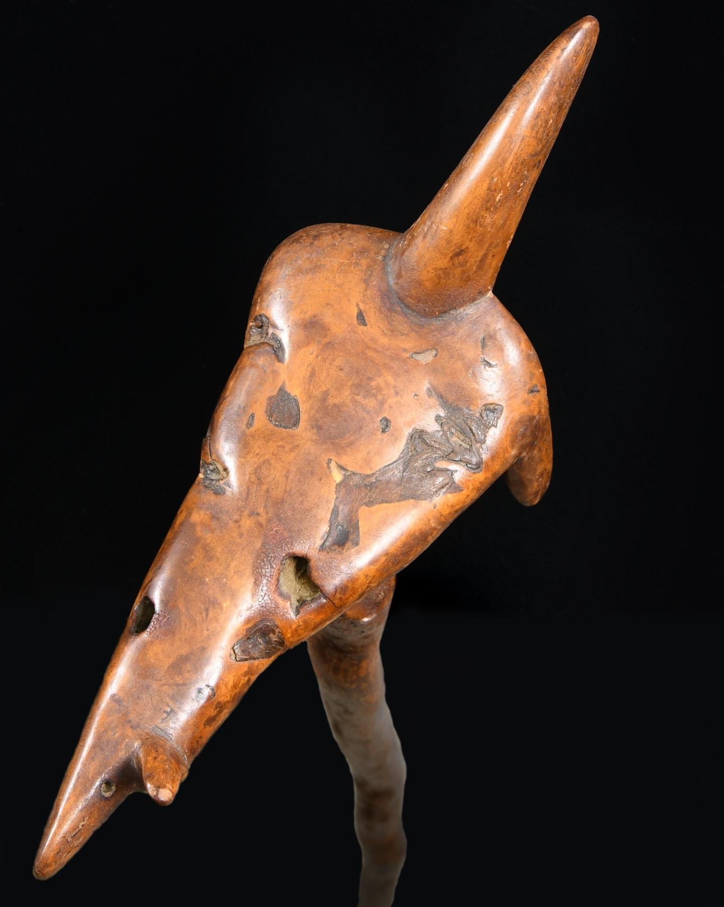 This hand carved folk art cane measures approximately 37" in length and 10" wide at the top. The handle depicts a fox or wolf effigy in a creative and interpretative manner. The cane possibly has an association with the Native American Wolf Clan. It is carved from a single piece of wood, likely encompassing a root with approximately 33 1/2" of vertical growth. CONDITION: the cane shows expected wear but no notable damage. The entire cane has a wonderful, untouched early patina. (02-24286/BF). $600-1,000.