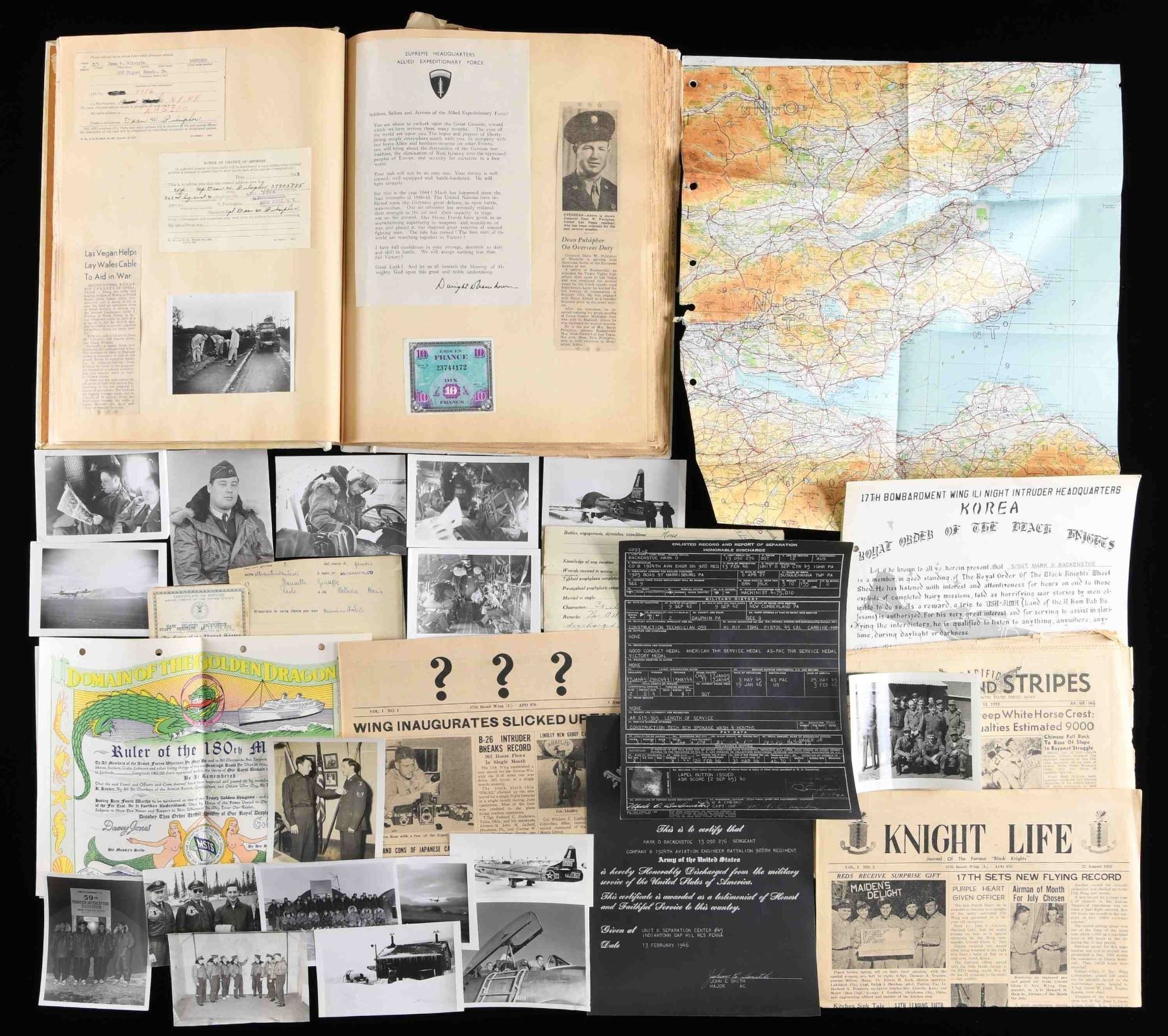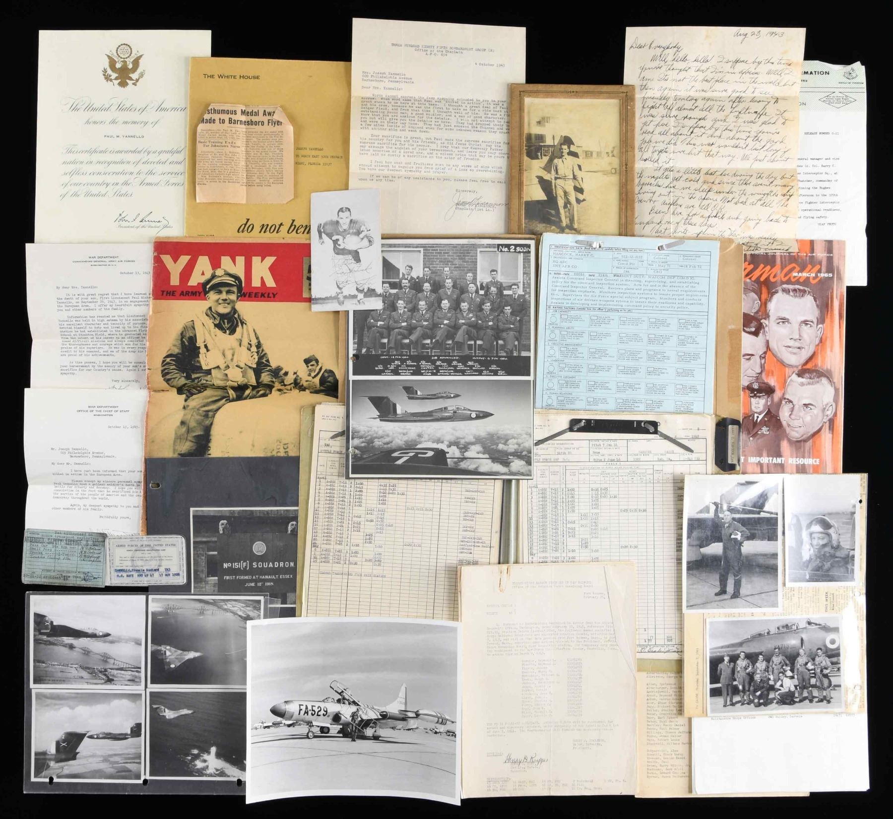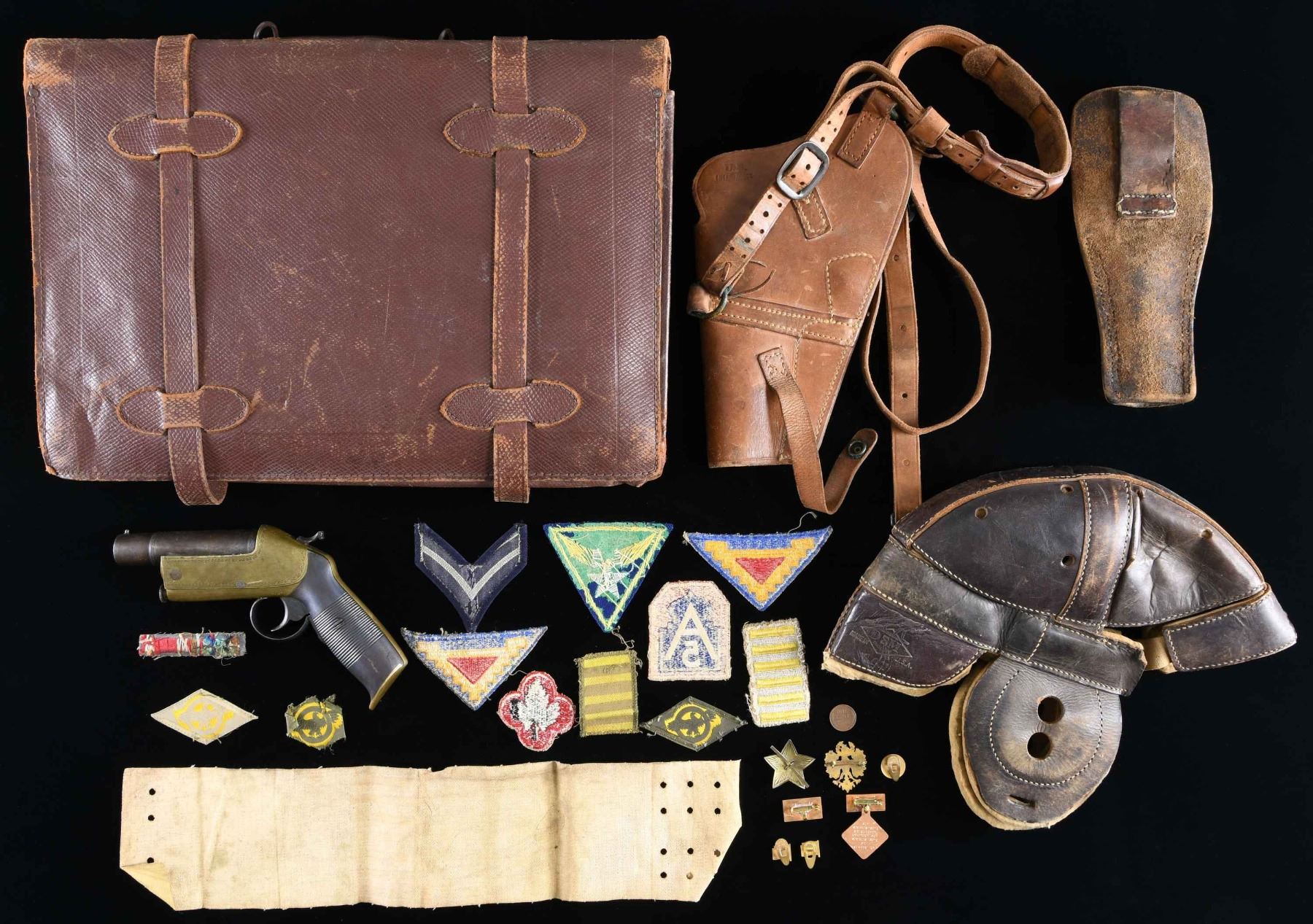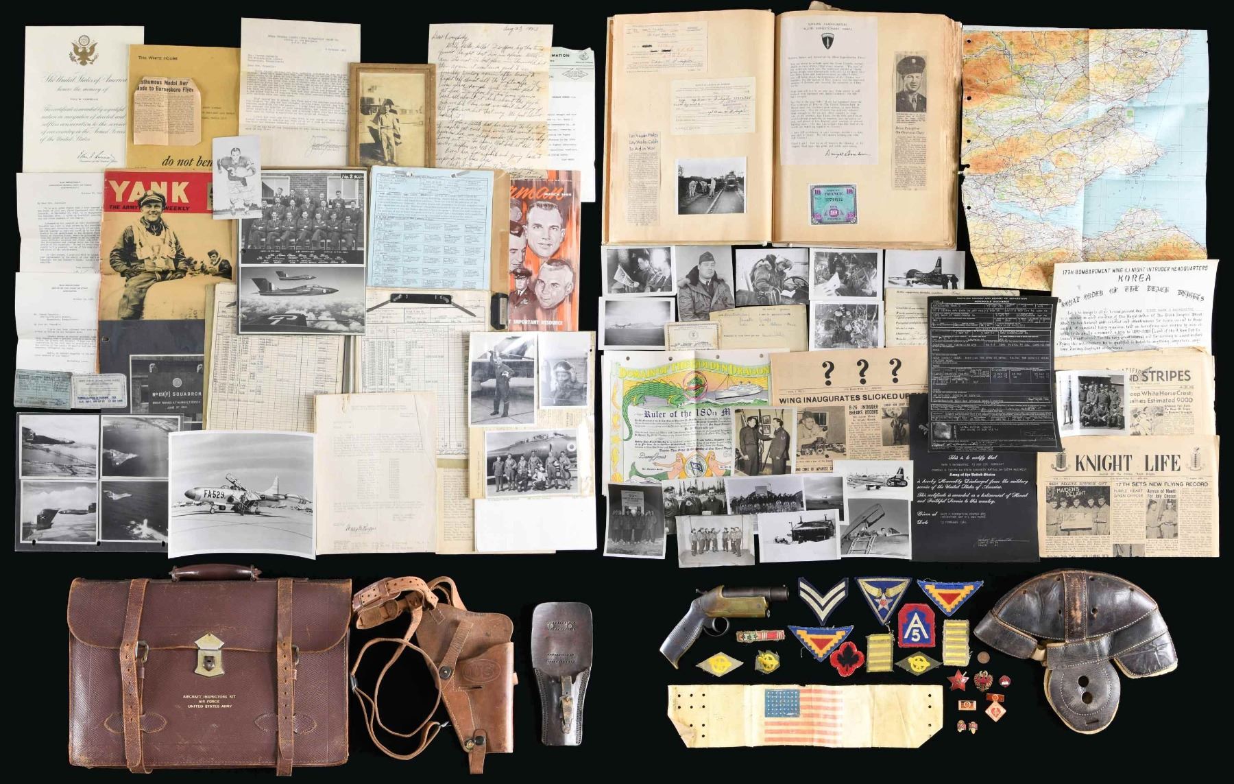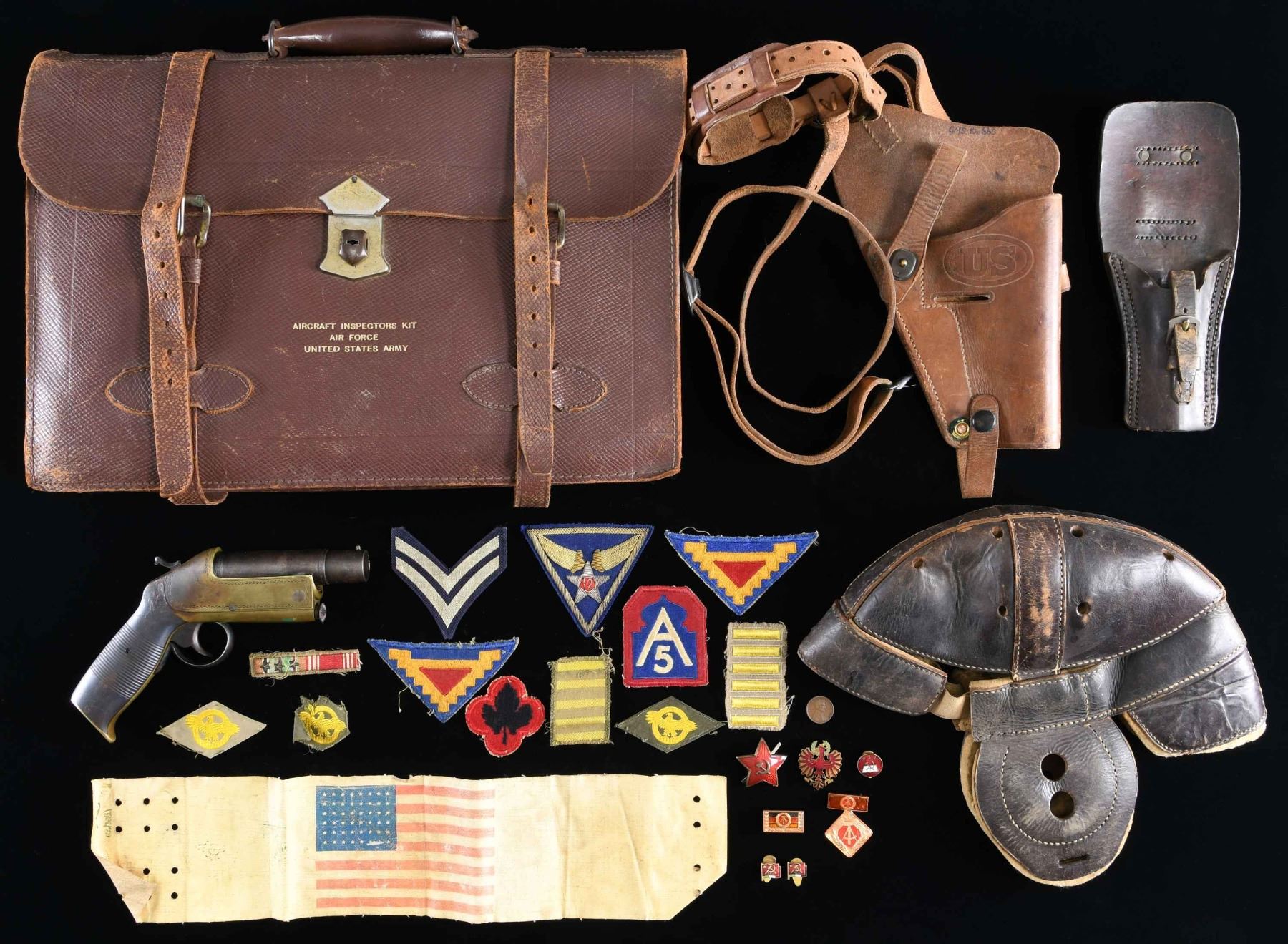 AND MILITARIA. Group consists of papers, letters & photos relating to 1st Lieutenant Paul M. Yannello, a B17 bomber pilot who died in a mid-air collision over the English channel. There are letters of bereavement which include Henry Stimson, Secretary of War, George Marshall, Chief of Staff & Henry "Hap" Arnold, Commanding General Army Air Forces. The letters are dated October 1943. There is additionally a certificate from the White House to Joseph Yannello recognizing the services of his late son & signed by President John F. Kennedy. / Papers, photos & memorabilia relating to Colonel Harry C. Hancock dating from 1939 to the late Cold War era. Colonel Hancock apparently served w/ the RAF as part of NATO in the 1960s. The papers include a log w/ WWII dates detailing his flight time in a wide variety of aircraft. / Scrapbook of Sergeant Dean W. Pulsipher detailing his service in the Signal Corp during WWII. The scrapbook contains a wonderful variety of photos, postcards & includes a Victory edition of Yank magazine. / Papers & photos relating to Staff Sergeant Mark D. Backenstoe who served w/ the 17th Bombardment Wing "Night Intruders" in Korea. / Additional items in the lot include a white cloth armband w/ the American flag used by airborne forces in the invasion of North Africa. This is a very scarce item. / Brown leather fleece lined tanker's helmet from WWII. Marked at rear w/ a "D&M" triangular logo topped by a bird dog. The size is marked "16H". Helmet is in worn condition w/ scuffing. Stitching is generally tight. / Brown leather M7 shoulder holster for the 1911 Colt. Marked on back "U.S. ENGER-KRESS". Holster is in a worn, but serviceable condition. / Unmarked engraved brass framed 12 ga. flare gun. 4" smooth bore barrel. Blued steel grips. Flare gun has well worn appearance w/ patina. Pistol is difficult to cock, but appears fully functional. Lightly oxidized bore. / Repaired early European bayonet frog, likely GRAS. / There is a quantity of US & foreign patches, insignias & pins including three pins relating to the Italian communist party "P.S.I." & "P.C.I.". / The group also contains a brown leather carrying case marked "AIRCRAFT INSPECTORS KIT / AIR FORCE / UNITED STATES ARMY". Case is in only fair condition w/ separation issues. (02-23838/RW). NON-GUN. $900-1,300.
