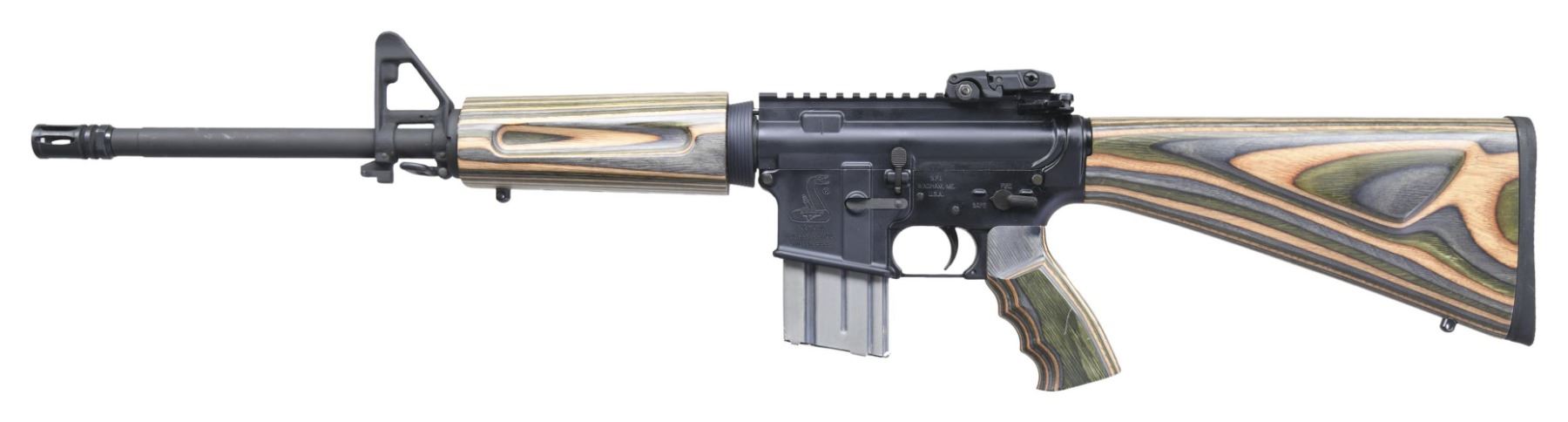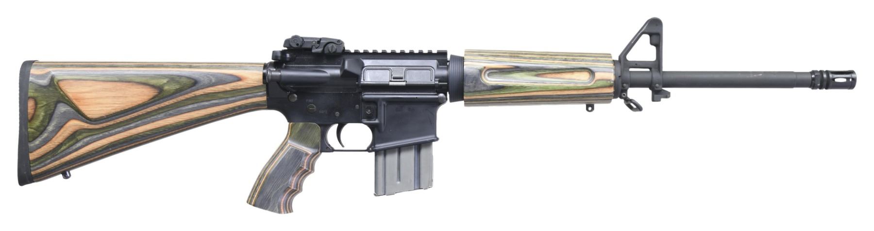 CARBINE. Cal. 5.56 MM NATO. S# L447960. Bbl. 16" H-BAR marked "B MP" with treaded A-2 flash hider plus standard front sight / bayonet lug. Mfg. early 2000's with "B.F.I." indicating under Cerebus control (also owned Remington). Laminated wood stock set with sporting rifle configured buttstock having black rubber pad and swivel bases. MBUS pop up rear sight on its A3 flat top upper with Picatinny mount. MAGS: 1 Adventure Line 20 rd. CONDITION: slight rub mark on right side of front sight; all other aspects near excellent including bore. (25-2327/NW). MODERN. $500-750.