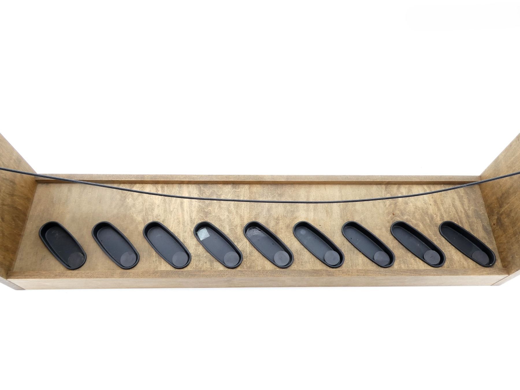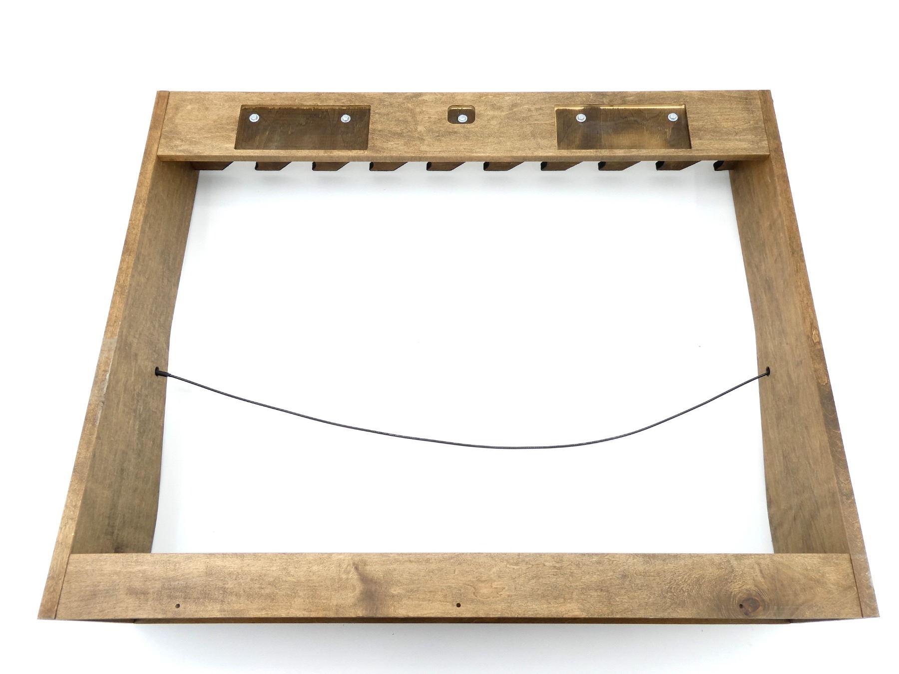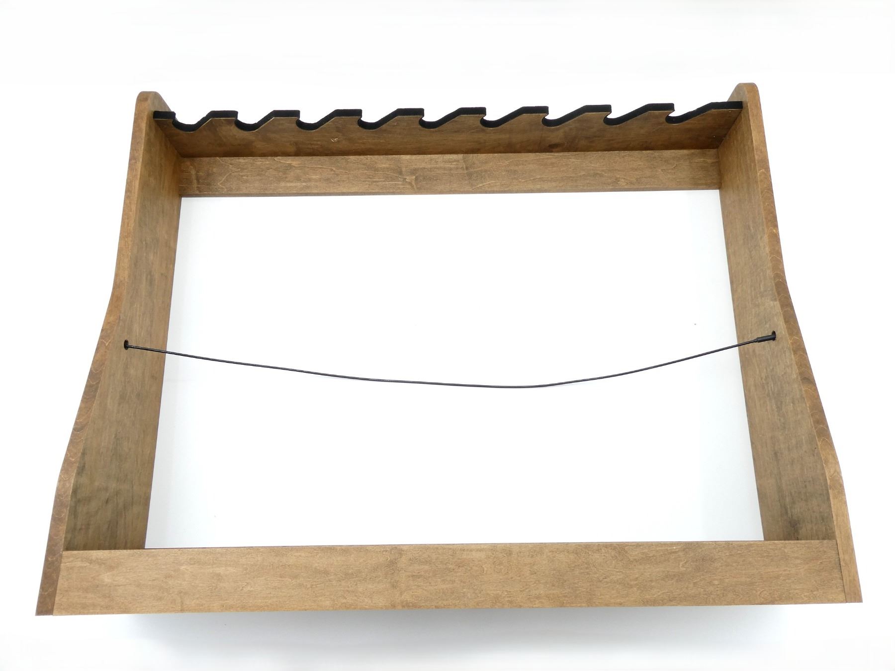 (1) 9-RIFLE WALL GUN RACK, WOOD & POLYMER CONSTRUCTION, APPROX. 47.5" X 11" X 38.25". SEE PHOTOS. *MAY REQUIRE ADDITIONAL SHIPPING CHARGES*