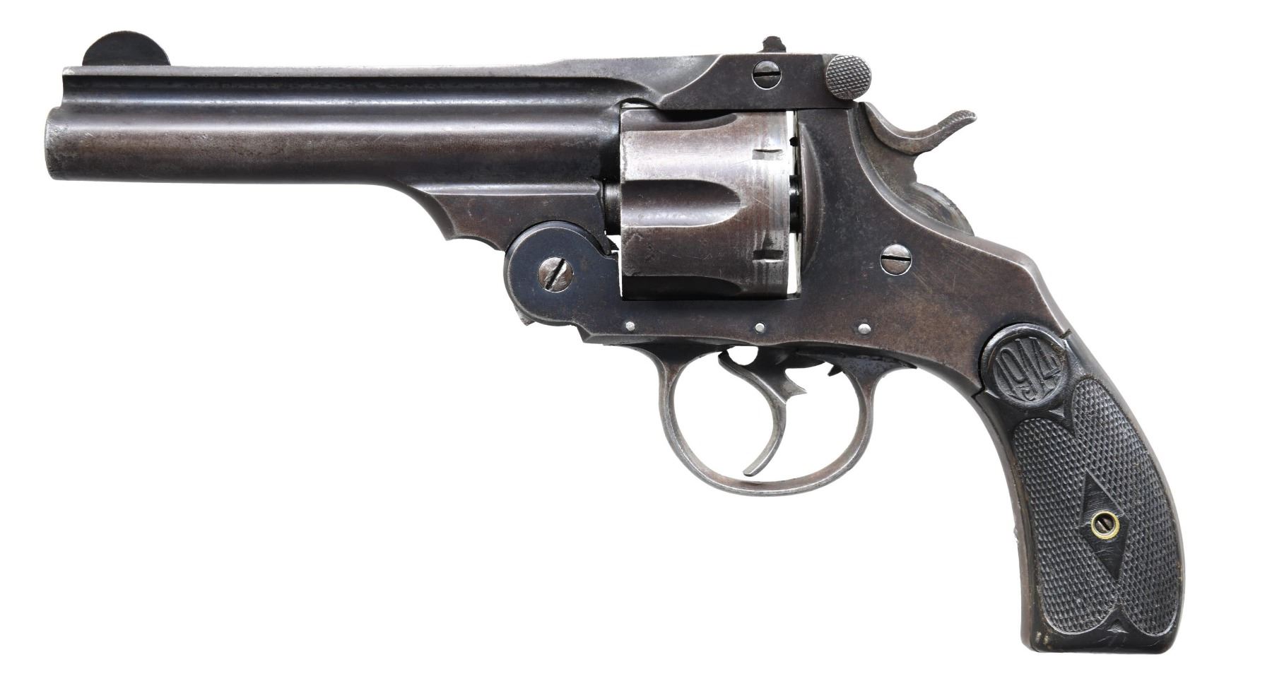 Cal. 455 Webley. S# 636. Bbl. 5". Round blade front sight. U-notch rear sight. Spanish revolver made for British use during WW1 based on an S&W design. Top of bbl. appears to be marked "MEDALLADE ORDO EXPOSICION". Blued finish. Checkered black grips with 1914 monograms. Bottom of grip frame has plugged lanyard hole. CONDITION: grips show a couple chips, scattered dings, handling marks, scratches & worn checkering. Metal retains 30% blue with overall fading to gray, scattered oxidation, edge wear, pitting, dings & several tool marks on trigger guard. Bbl. to frame fit & timing are loose & extractor may need attention. Poor bore with scattered patches of pitting & oxidation. (25-2560/MJC). CURIO. $200-300.