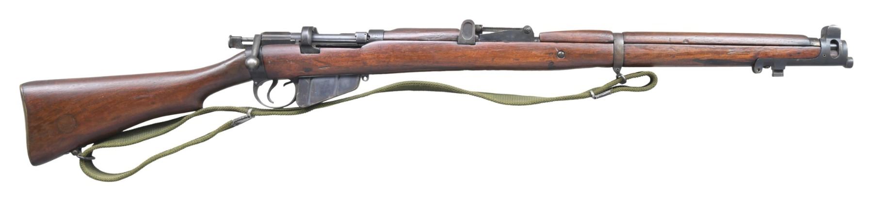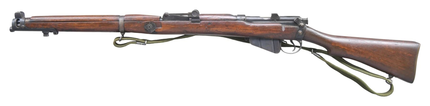 Cal. 303 Brit. S# M10827. Bbl. 25 1/5" dated 1927 with British sale proofs. Blade front sight with protective ears. Tangent rear sight graduated to 2000yds. Front volley sight plate & rear volley sight cutout present but actual volley sights are missing. All visible matching numbers with rear sight being arsenal force matched. Left side of socket has "ENGLAND" import marking, varied British military proofs "33" date for 1933. Right side of socket has LSA markings with 1915 date. Left side of receiver has crown "BNP" proof. Arsenal rework blue finish. Hardwood stock with bottom mounted sling swivels & later green canvas sling. Handguard has arsenal removed area around rear sight assembly. MAGS: 1-10 rd. CONDITION: refinished stock set has filled in disc slot with added finish, a couple armorer batch repairs on butt, a couple light chips, scattered dings & handling marks. Front handguard is a bit loose. Metal is turning gray with a few areas of pitting, strong traces of arsenal rework blue, some edge wear, handling marks & light oxidation, Action functions properly when hand cycled. Good bright bore with some light frosting but strong rifling. (25-3833/MJC). CURIO. $300-400.