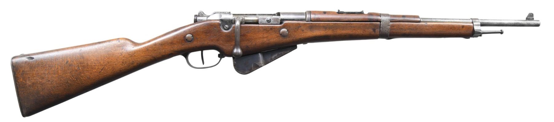 CARBINE. Cal. 8MM Lebel. S# AB 92023. Non-matching numbers throughout. Bbl. 17 3/4". Ladder rear sight graduated to 2,000 meters. Blade front sight. Receiver marked on left side "Ets. Continsouza". MLE-M-16. There is also an "OF" which indicated a finish that was similar to Parkerizing. Hardwood stock set utilizing the later nosecap w/o cleaning rod. Magazine has 5 rd. extension. CONDITION: stock set has worn arsenal rework finish with several deep scratches containing wood filler on left over magazine well. Metal is worn turning grey with evidence of cleaning. Dark worn bore. (25-2180/RW). CURIO. $200-400.