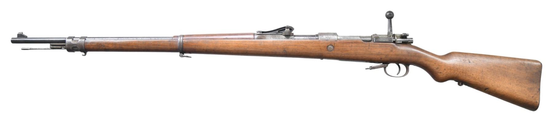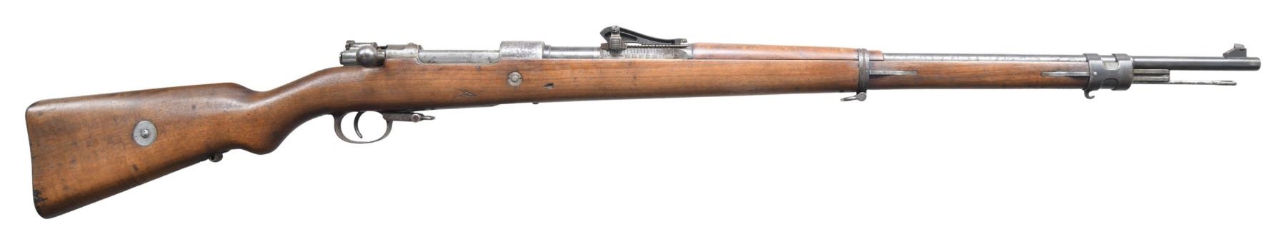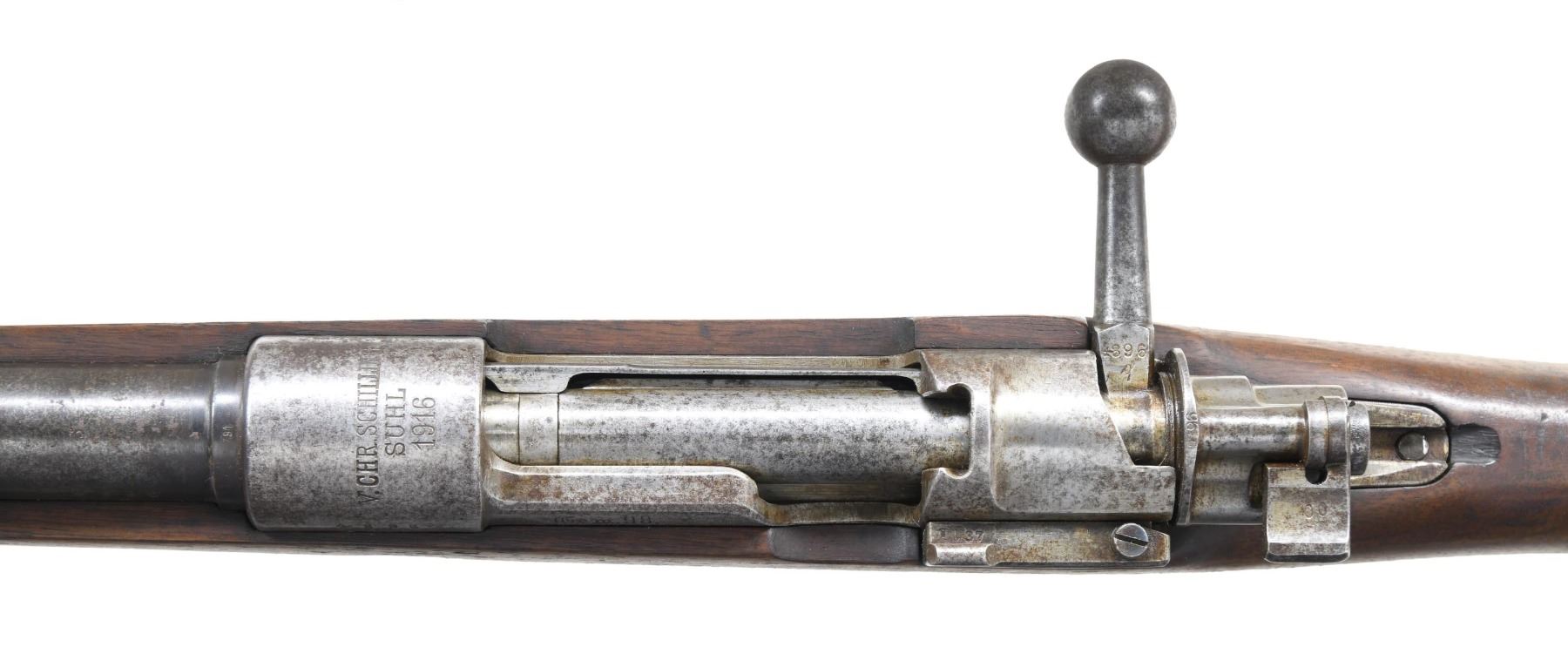 Cal. 8mm Mauser. S# 4896q. Bbl. 29". Blade front sight. Lange visier rear sight graduated to 2000m. Matching numbers on receiver, bbl., floorplate, follower, trigger guard & front sight. All other visible numbers are mismatched & mostly of Imperial German mfr. Receiver top has VC Schilling markings with 1916 date. Firing pin clipped as-is typical for WW1 German rifles. No discernable depot stamp on buttplate. Bolt, buttplate, cleaning rod & receiver all "In-the-white". Balance of other parts are blued. Walnut stock set with faint Imperial acceptance stamps & bottom mounted sling hardware. CONDITION: sanded stock shows a couple small gouges, scattered dings & handling marks. In-the-white parts are dulling to gray with oxidation throughout & heavier oxidation on buttplate. Blued parts retain 30% finish with fading to gray most notable on bottom metal, edge wear & scattered oxidation. Action functions properly when hand cycled. Good bright bore with strong rifling but a couple spots of pitting. (25-2209/MJC). CURIO. $400-600.