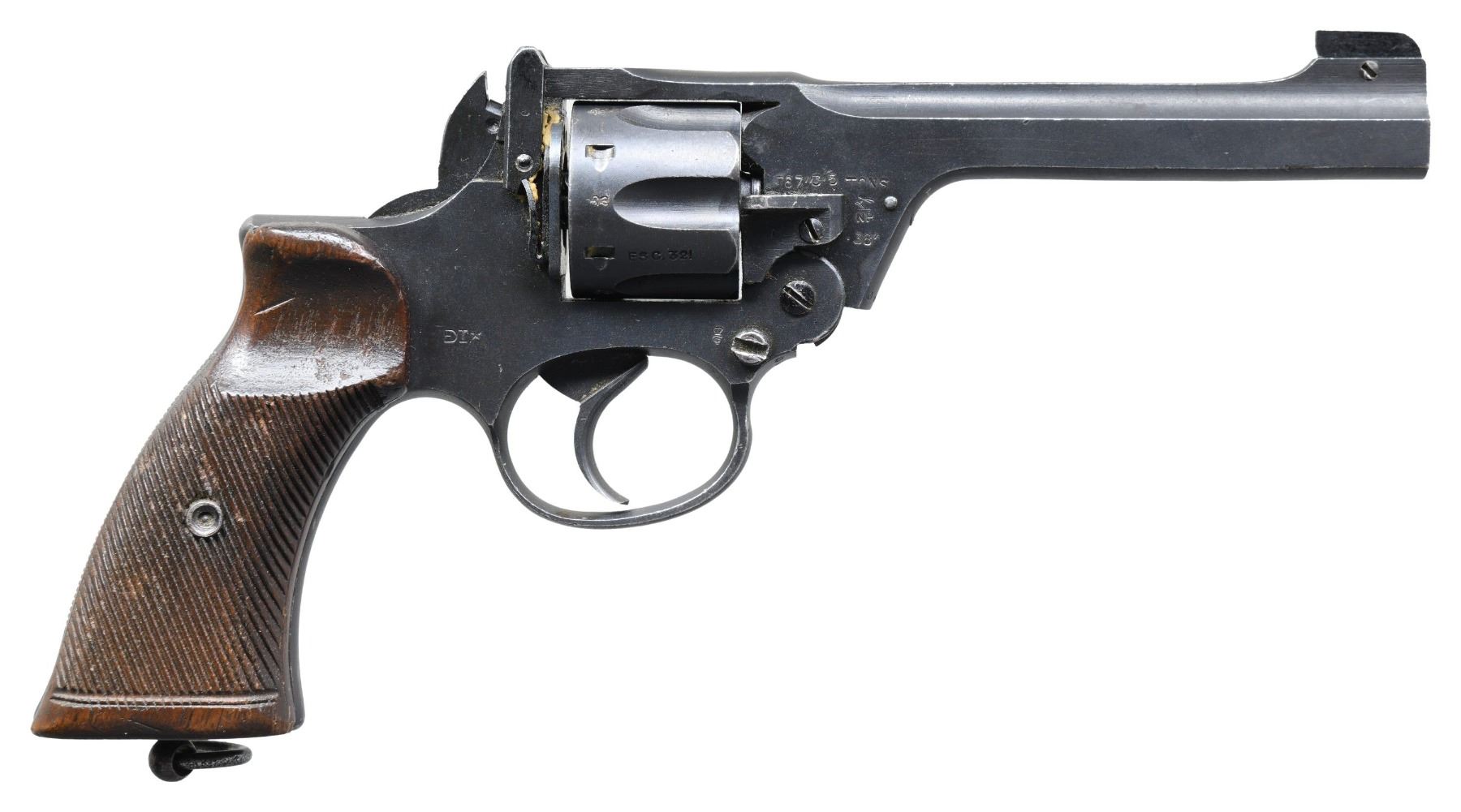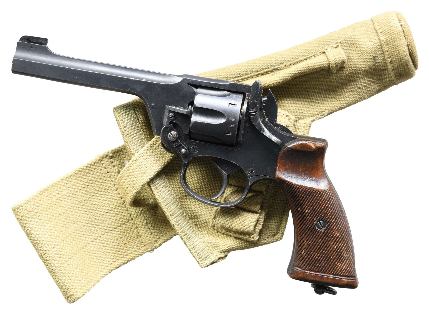 Cal. 38 S&W. S# O5721. Bbl. 5" that appears to be dated 1941. Blade front sight. Square notch rear sight. Matching numbers on frame, bbl. & cyl. Right side of the frame is marked "DI*". Right side of bbl. has British sale proofs. Arsenal rework blue finish. Grooved hardwood grips. Lanyard ring present. UNATTACHED ACCESSORIES: 1955 dated M.W.&S canvas holster. CONDITION: grips show a few small chips, scattered dings & handling marks. Metal retains 90% arsenal rework blue with scattered fading, edge wear & some light oxidation. Action functions properly when hand cycled. Good bore with some light frosting. (25-3726/MJC). CURIO. $300-400.