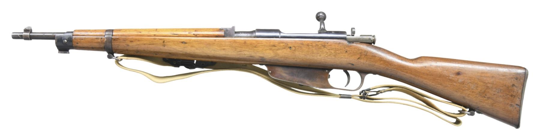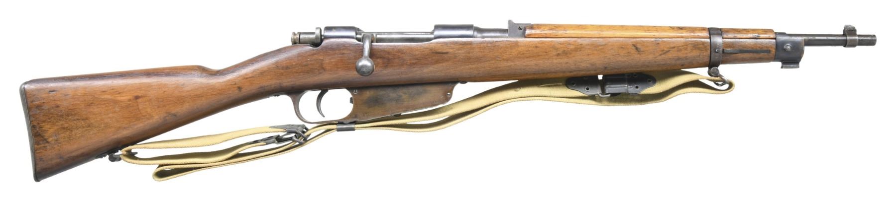 Cal. 6.5 Carcano. S# D3374. Bbl. 17 3/4". Blade front sight. Fixed rear v-notch rear sight. Matching numbers on bbl. shank & left side of butt. WW2 made Troop Special carbine. Bbl. shank has Brescia arsenal markings 1942 date in both standard & Roman numerals. Blued finish. Hardwood stock set with bottom mounted sling swivels & tan canvas Kerr No-Buckl sling. Handguard is lighter in color than stock. No cleaning rod present. CONDITION: refinished stock has added varnish with a crack on front of handguard, scattered flaking finish, dings, scratches & handling marks. Metal is mostly gray with strong traces of arsenal blue, some oxidation, edge wear & handling marks. Action functions properly when hand cycled. Good bore with strong rifling. (25-3847/MJC). CURIO. $150-300.