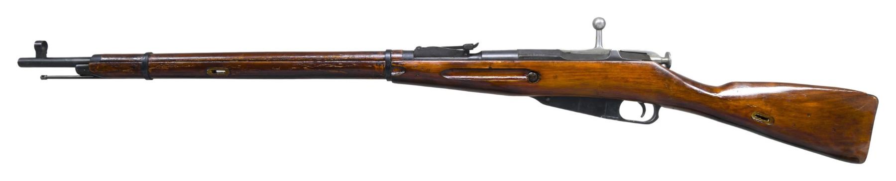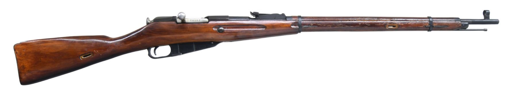 Cal. 7.62x54R. S# 9130-4536. Bbl. 29". Post front sight with hood. Tangent rear sight graduated to 2000m. Dragoon rifle converted to 91/30 config. All matching numbers as arsenal refurbished. Bbl. shank has Izhevsk markings with 1930 date. Left side of receiver has Aztec import markings with importer added serial number. Arsenal rework blue finish. Asian hardwood stock set with pressed in sling slots. Cleaning rod present. CONDITION: stock set has arsenal rework shellac with armorer splice at toe, scattered flaking & handling marks. Metal retains 93% arsenal rework blue with some edge wear, blued over pitting, handling marks & light oxidation. Action functions properly when hand cycled. Bore is mostly bright but shows scattered frosting. (25-3899/MJC). CURIO. $200-400.