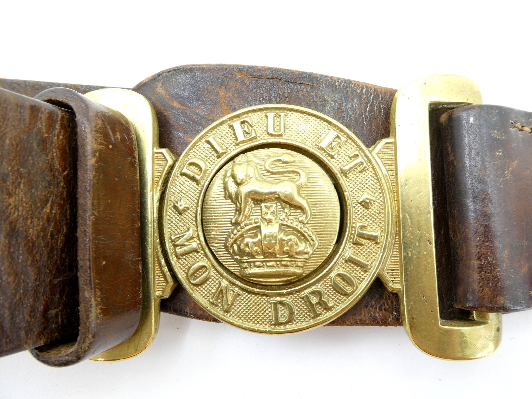 (1) BROWN LEATHER BELT WITH BRASS BELT BUCKLE, LEATHER IS SOFT, BUCKLE MARKED: "DIEU ET MON DROIT" WITH LION OVER KING'S CROWN IN CENTER, NO VISIBLE MARKINGS / MAKER'S MARKS ON BRASS OR LEATHER, OVERALL LENGTH APPROX. 41", ADJUSTABLE. SEE PHOTOS.