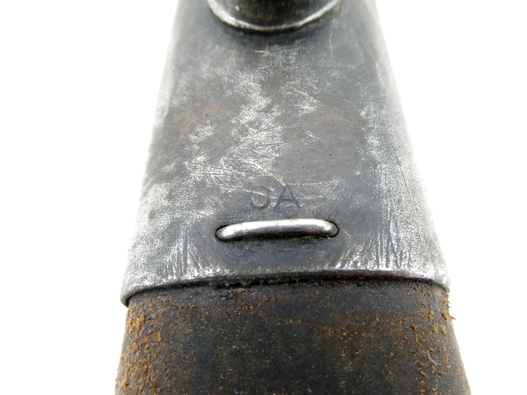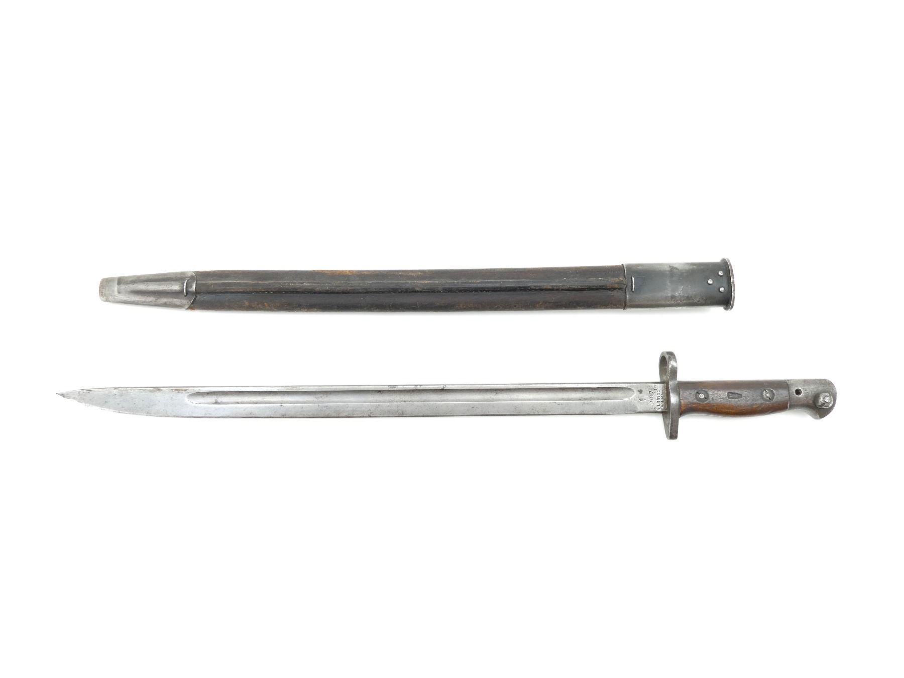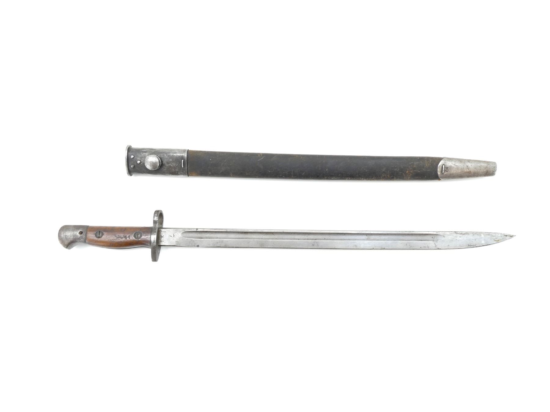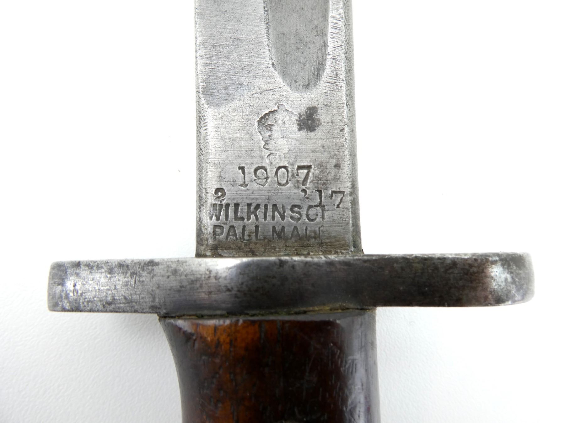 (1) FITS LEE ENFIELD NO.1 MKIII RIFLES, RICASSO MARKED: CROWN OVER "G.R" OVER "1907" OVER "2 '17" OVER "WILKINSON" OVER "PALL MALL", OTHER-SIDE MARKED: "X" (BEND TEST), BROAD ARROW & VARIOUS PROOF MARKS, NO QUILLON, 2-PIECE WOODEN GRIP, FAINT PROOF MARK ON GRIP, OTHER-SIDE HAS FAINT HAND-ETCHED MARKING, FAINT "4" ON METAL IN-BETWEEN GRIPS, METAL POMMEL, NO VISIBLE MARKINGS, WWII AUSTRALIAN LEATHER & STEEL SCABBARD, LEATHER MARKED: "MANGROVITE 43", STEEL ENDS MARKED: "OA", BLADE APPROX. 17.25" & OVERALL LENGTH APPROX. 22". SEE PHOTOS.