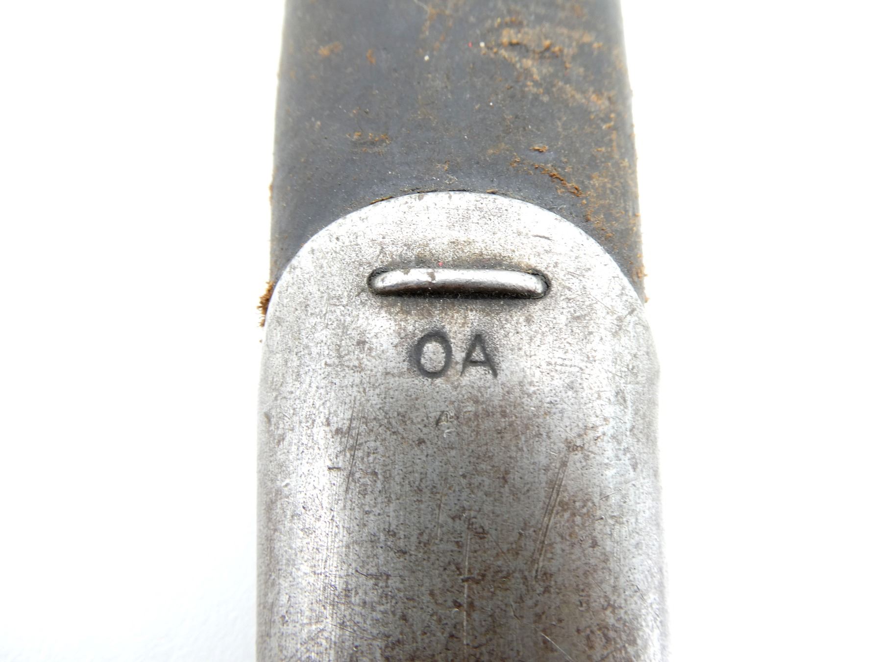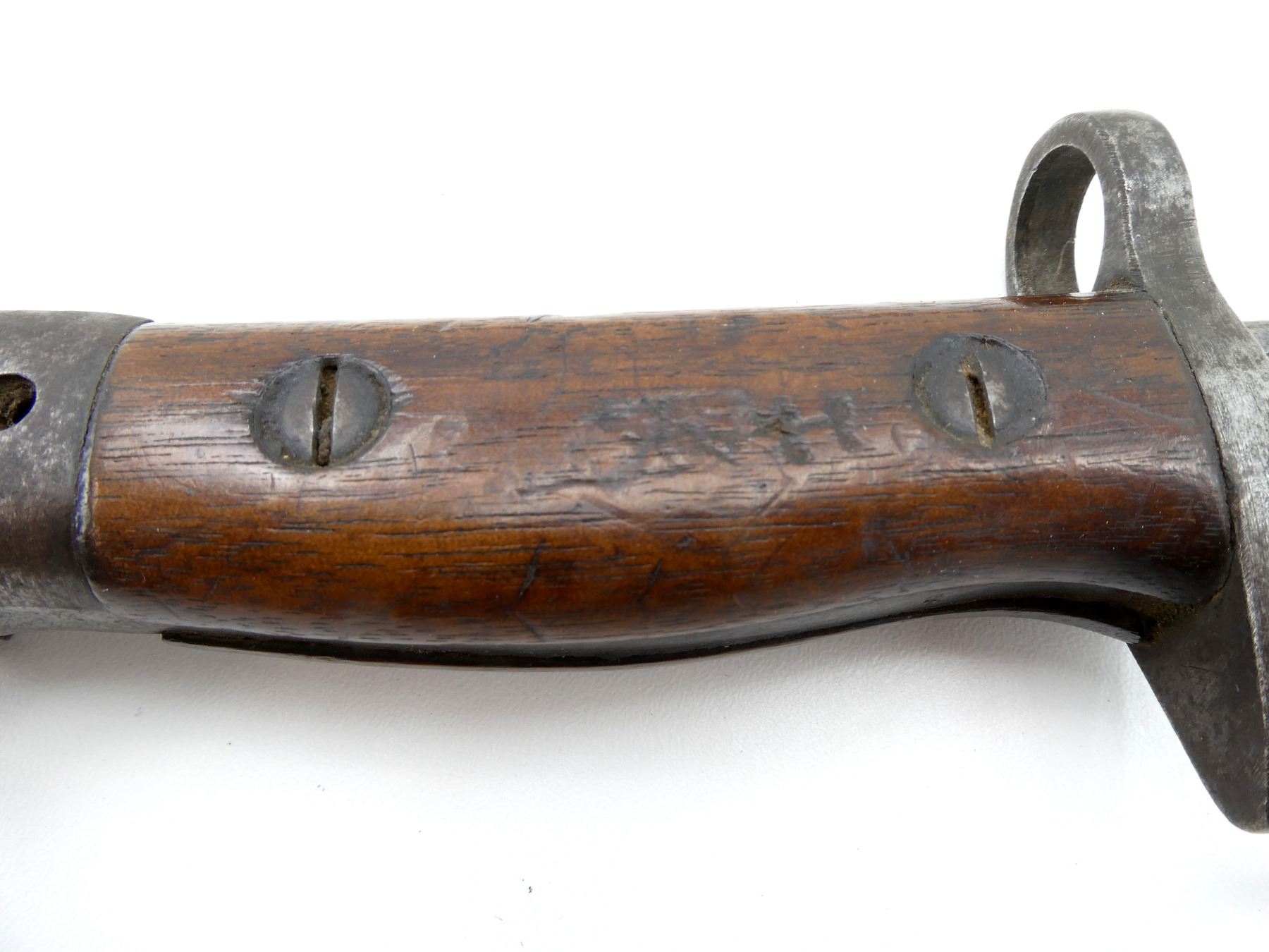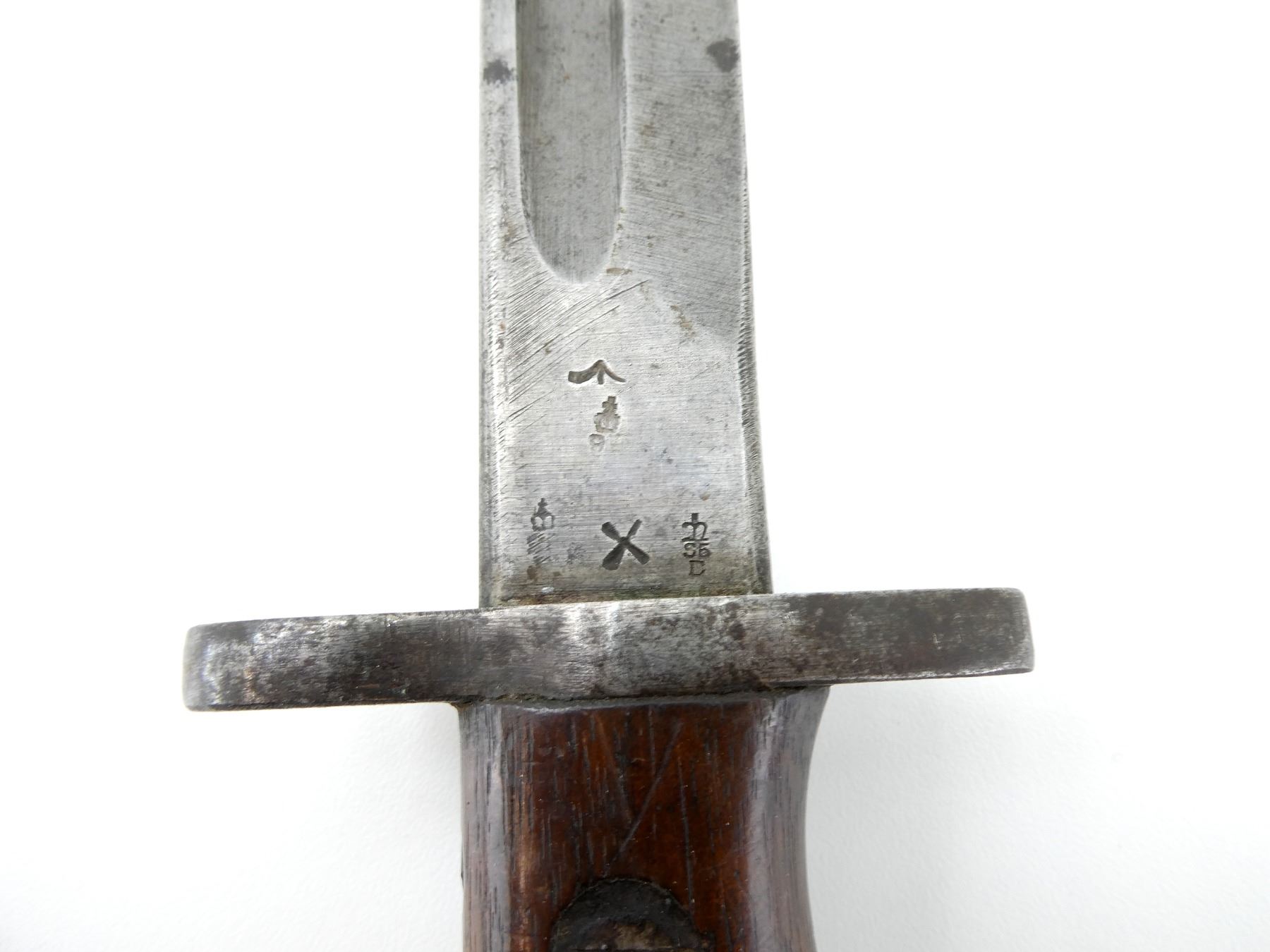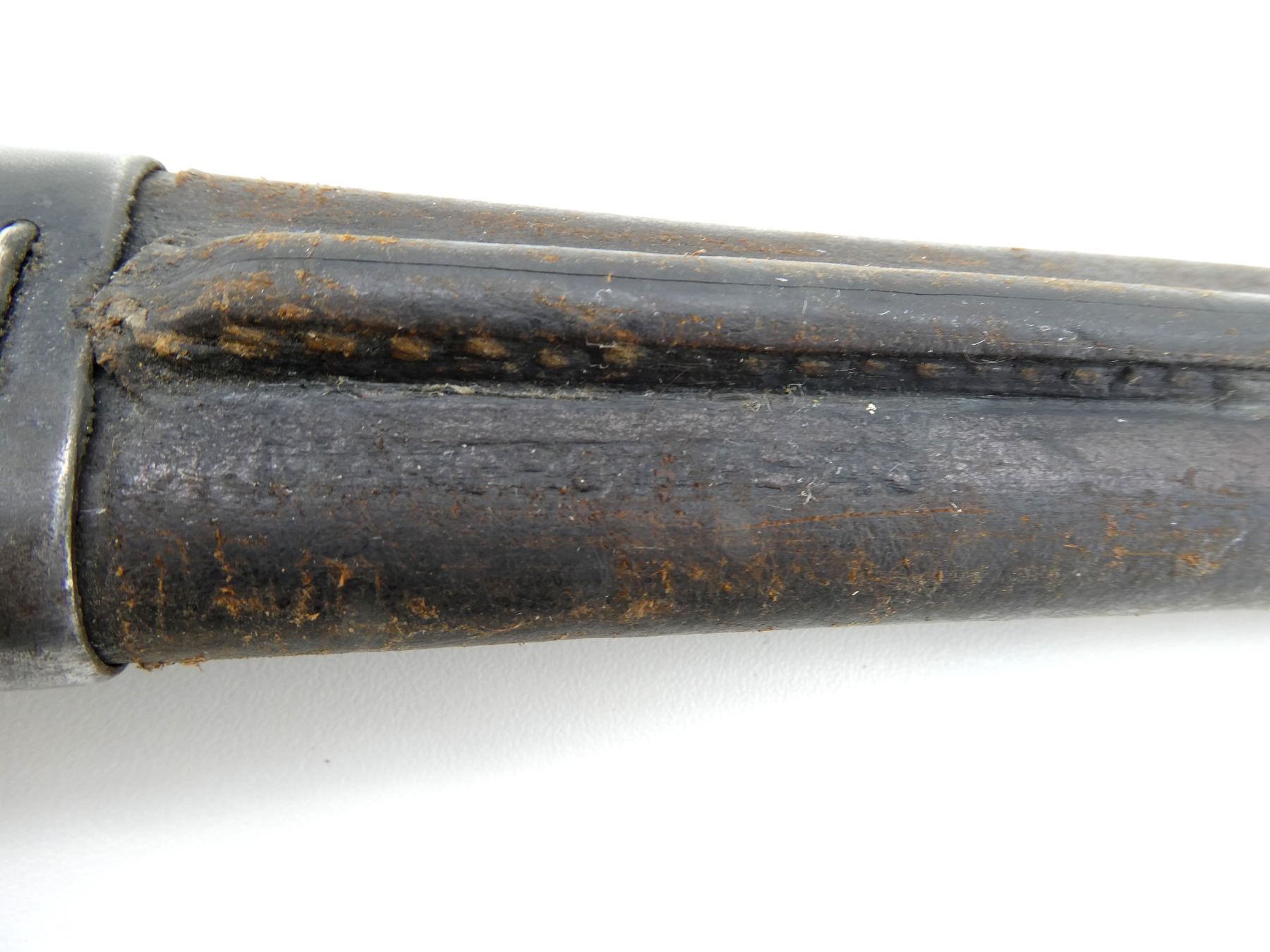 (1) FITS LEE ENFIELD NO.1 MKIII RIFLES, RICASSO MARKED: CROWN OVER "G.R" OVER "1907" OVER "2 '17" OVER "WILKINSON" OVER "PALL MALL", OTHER-SIDE MARKED: "X" (BEND TEST), BROAD ARROW & VARIOUS PROOF MARKS, NO QUILLON, 2-PIECE WOODEN GRIP, FAINT PROOF MARK ON GRIP, OTHER-SIDE HAS FAINT HAND-ETCHED MARKING, FAINT "4" ON METAL IN-BETWEEN GRIPS, METAL POMMEL, NO VISIBLE MARKINGS, WWII AUSTRALIAN LEATHER & STEEL SCABBARD, LEATHER MARKED: "MANGROVITE 43", STEEL ENDS MARKED: "OA", BLADE APPROX. 17.25" & OVERALL LENGTH APPROX. 22". SEE PHOTOS.