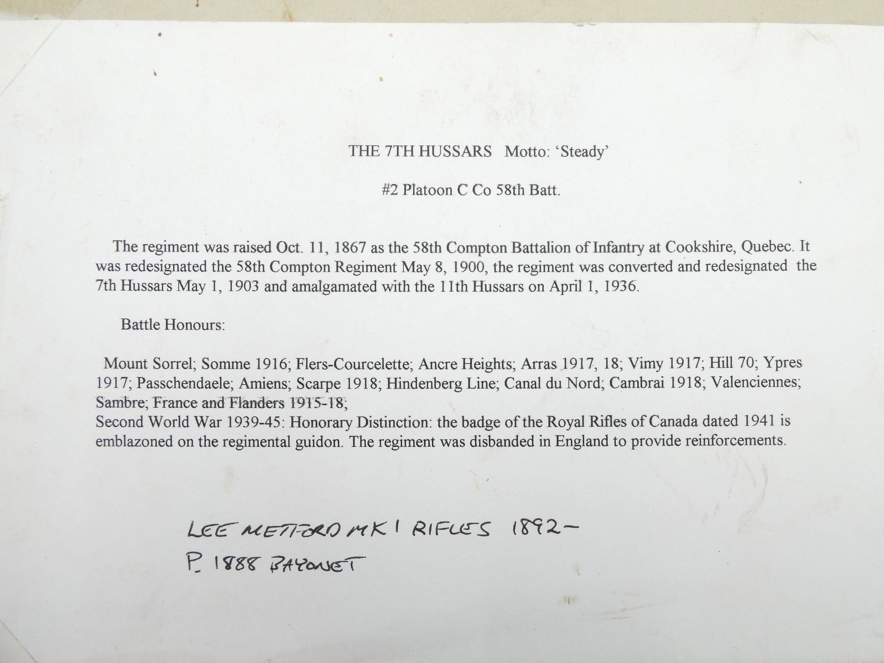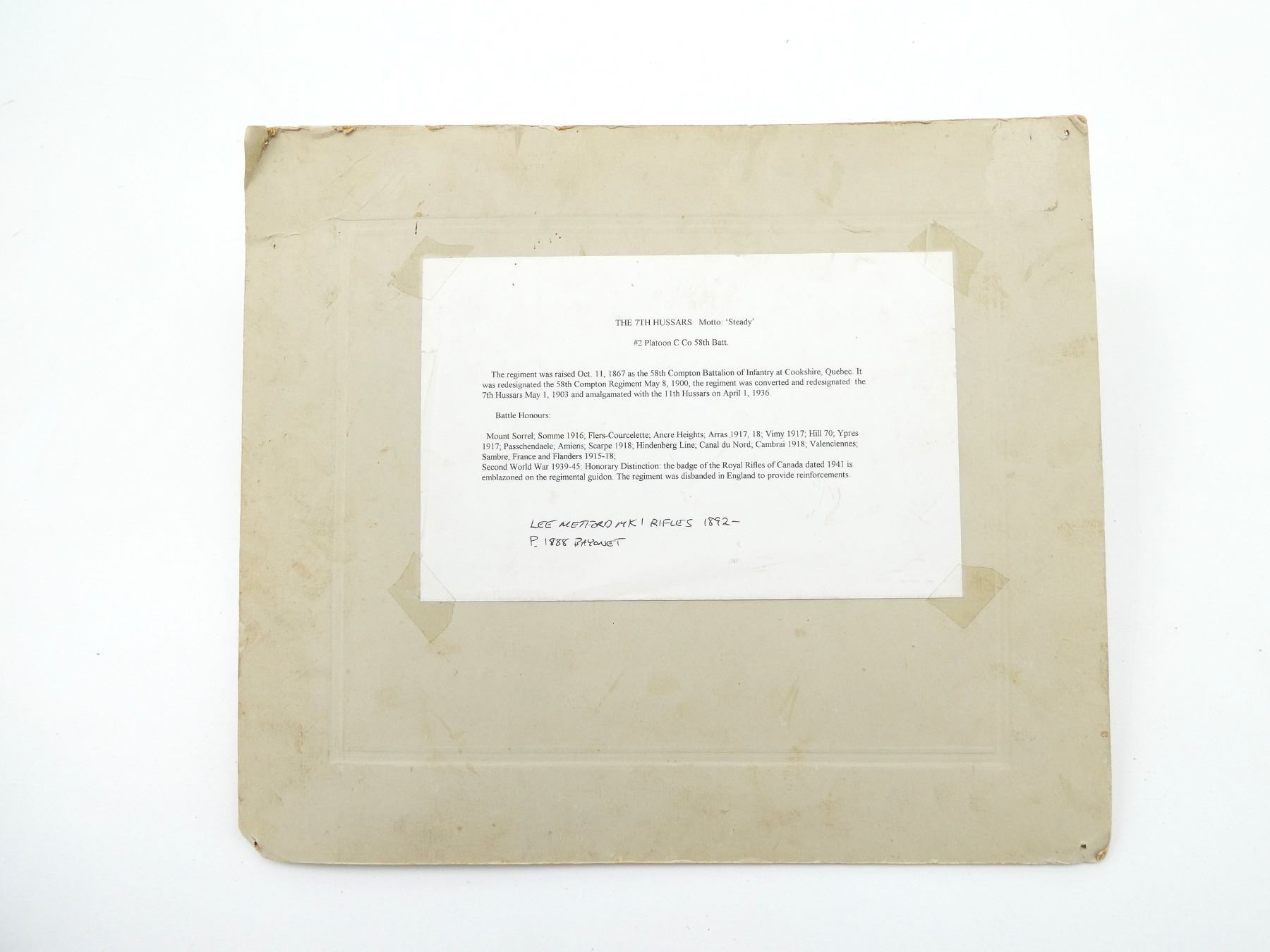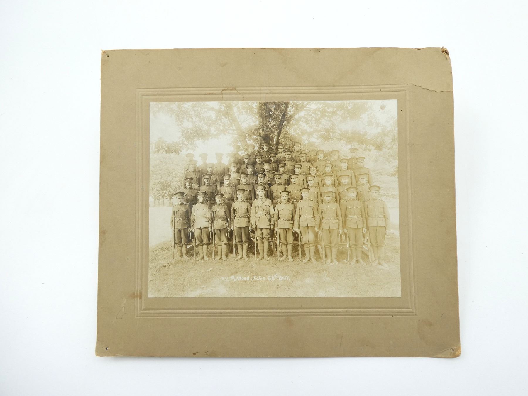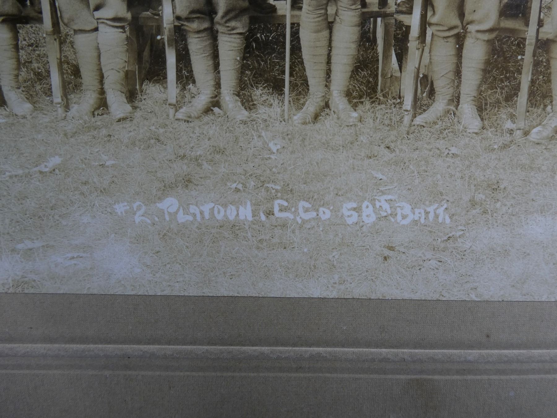 (1) BLACK / WHITE PHOTO TITLED: "#2. PLATOON, C CO 58TH BATT.", PRINTED HISTORY OF THE REGIMENT ON BACK OF CARDBOARD PHOTO BACKING, WITH CARDBOARD BACKING APPROX. 13 5/8" X 11.75". SEE PHOTOS.