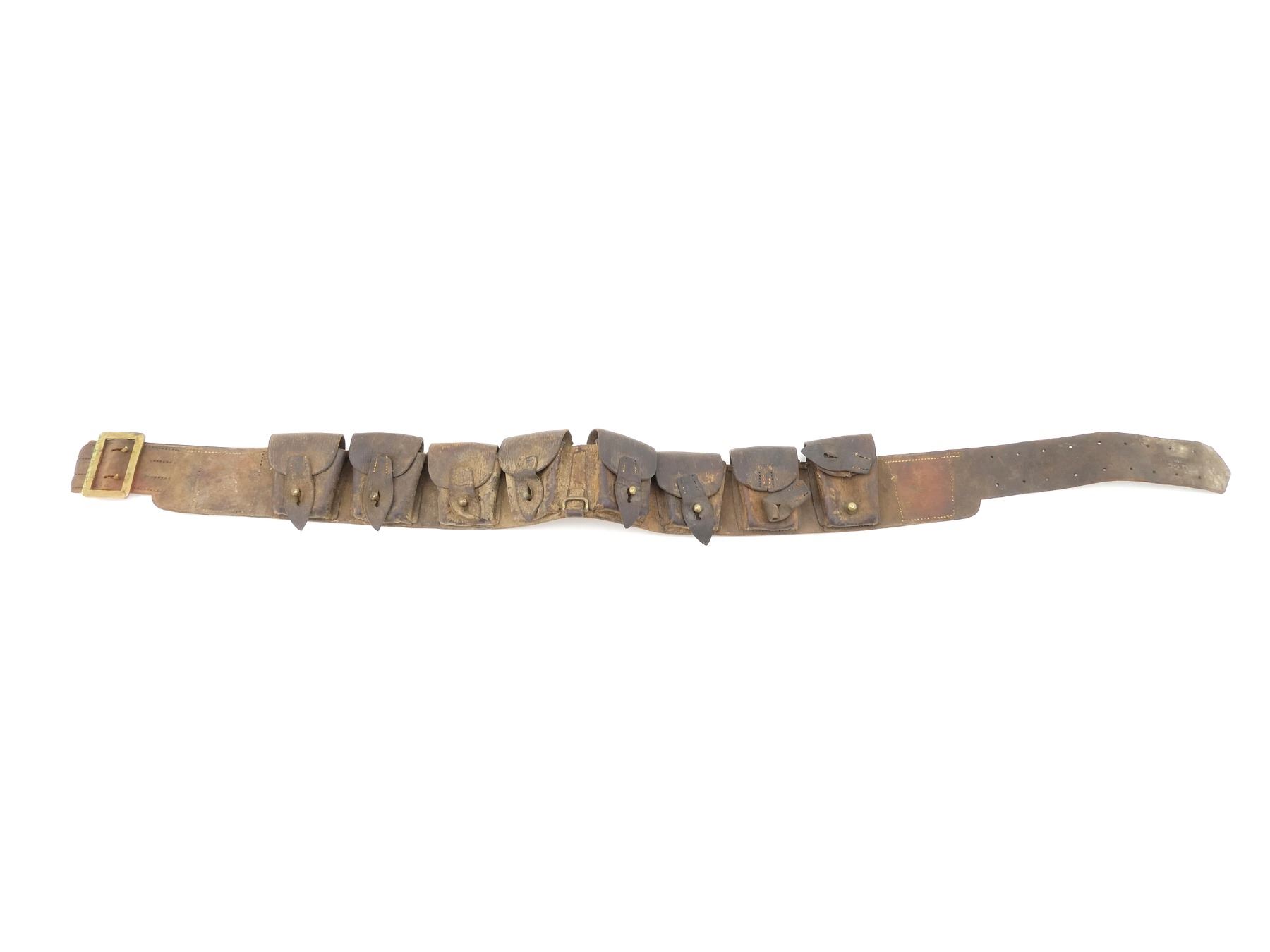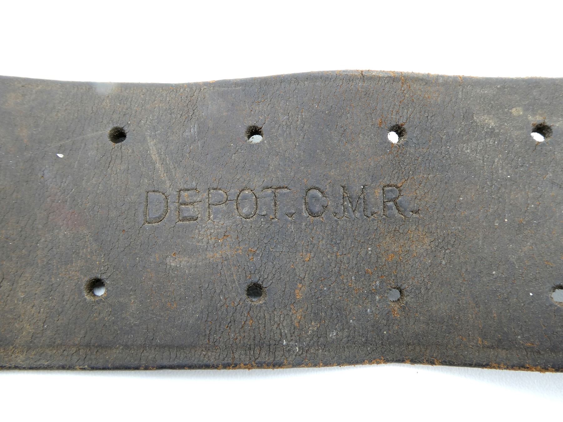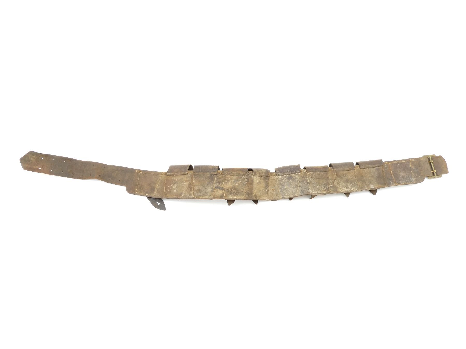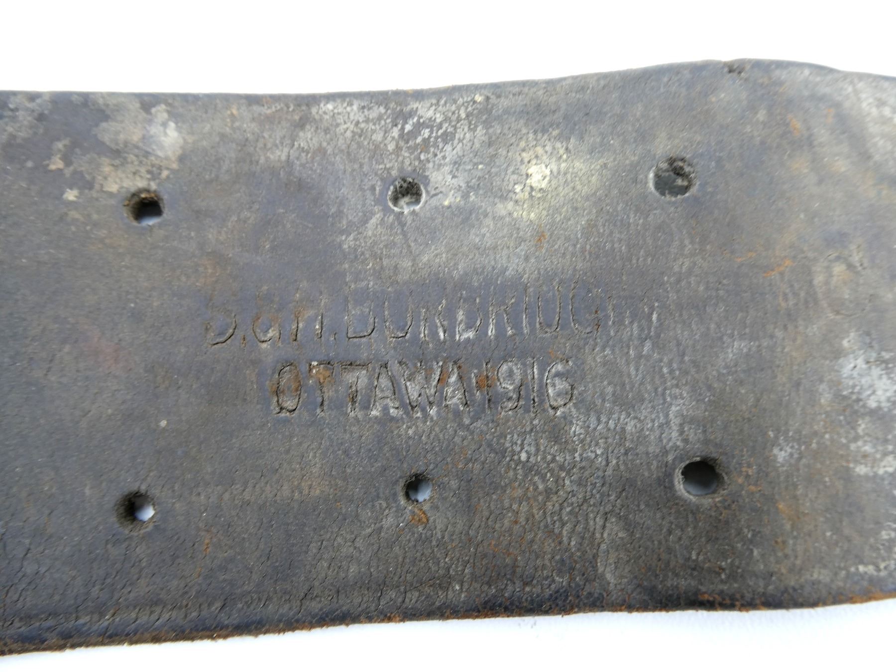 (1) BROWN LEATHER 10-POCKET AMMO BELT, TWO POCKETS HAVE BEEN REMOVED, FOR .303 BRITISH AMMO, LEATHER MARKED: "DEPOT.C.M.R.", "S.&H. BORBRIDGE, OTTAWA 1916" WITH C-BROAD ARROW, BRASS FITTINGS, LEATHER IS SOFT, SHOWS AGE / WEAR / TEAR & OVERALL LENGTH APPROX. 49.75". SEE PHOTOS.
