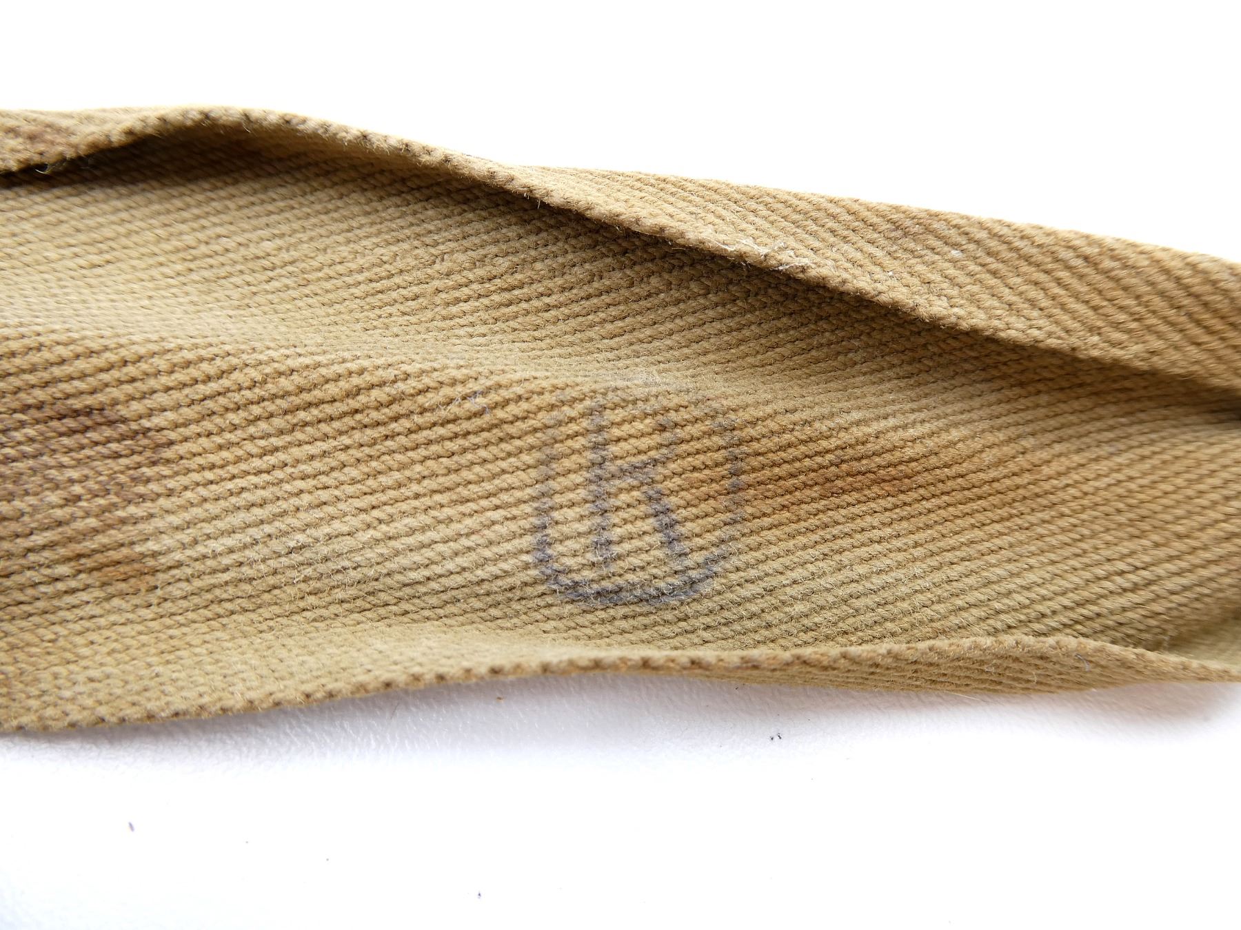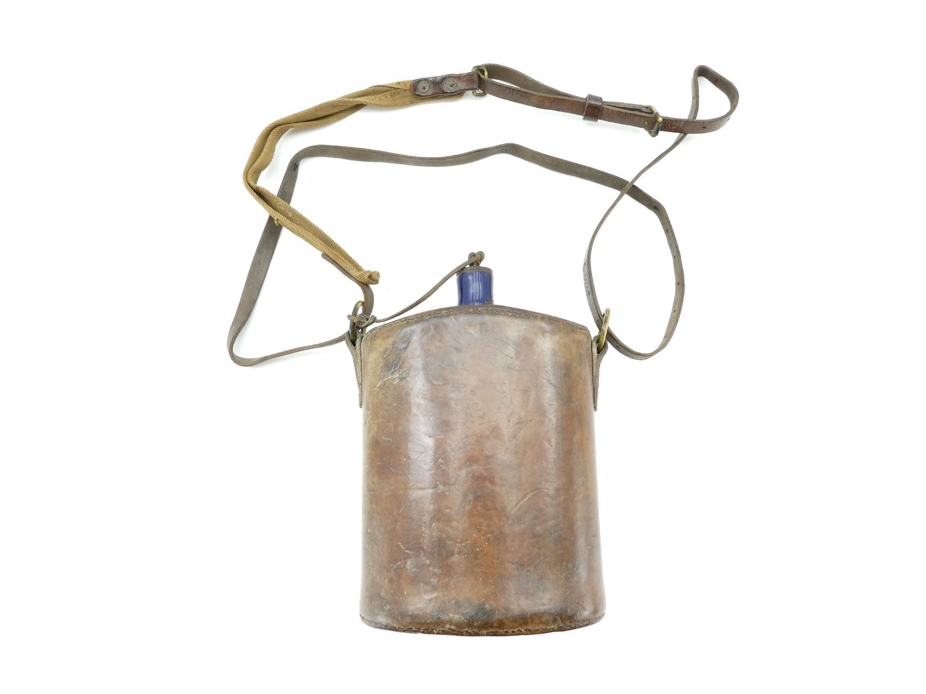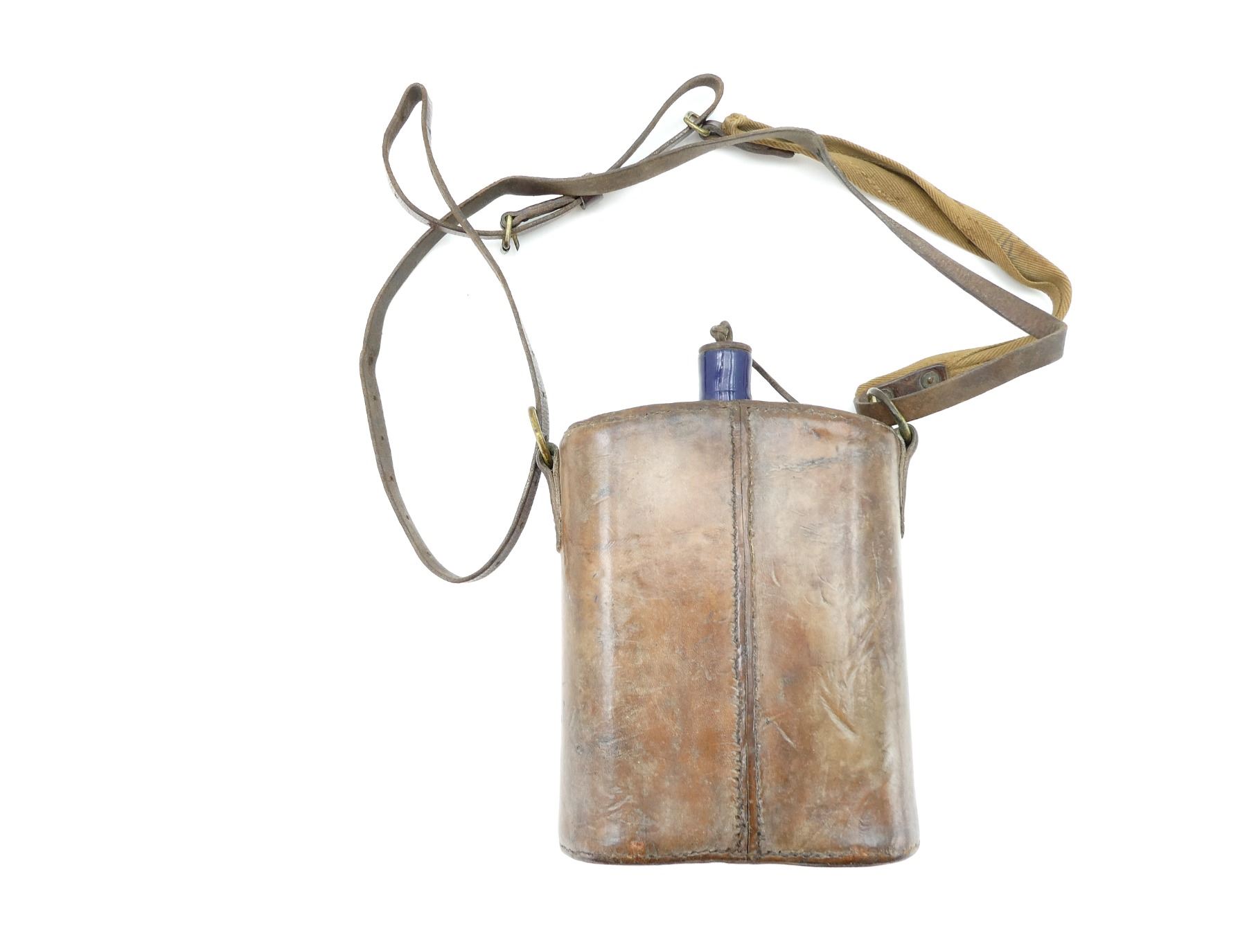 (1) LEATHER WRAPPED BLUE ENAMELED STEEL CANTEEN WITH CORK / METAL STOPPER, NO VISIBLE MARKINGS ON LEATHER WRAP, LEATHER / CANVAS SHOULDER STRAP, CANVAS PIECE INK STAMPED: "R" INSIDE A "D(?)", NO OTHER VISIBLE MARKINGS, BRASS FITTINGS. SEE PHOTOS.