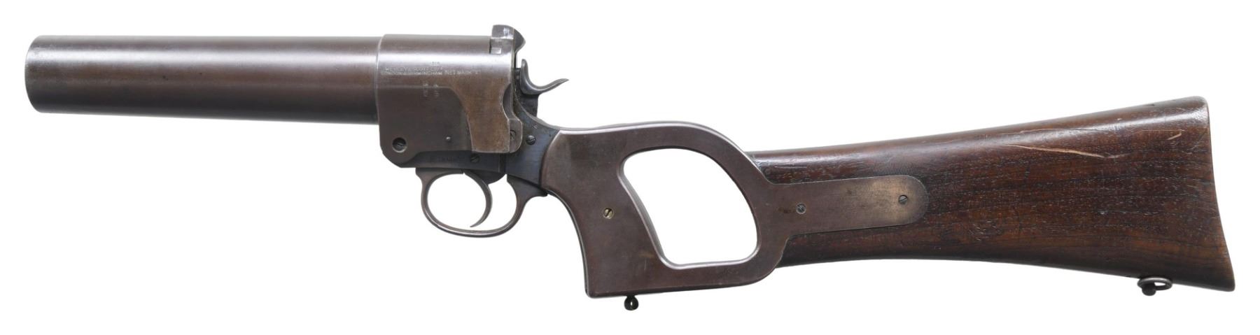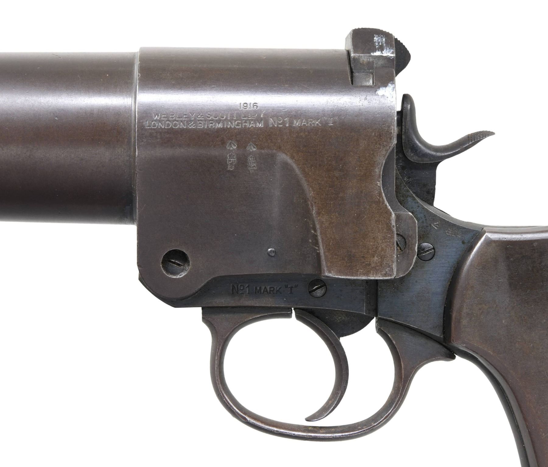 Cal. 37mm. S# 15128. All visible numbers match. Bbl. 10" smooth bore. These single shot break-open flare guns were developed during WWI & were used by the Royal Flying Corp. They were later sold in the US & used by Police departments. Bbl. is marked on the left side "1916 / WEBLEY & SCOTT LTD. / LONDON & BIRMINGHAM NO.1 MARK 1". Two view marks w/ broad arrows. Frame is marked over trigger guard on left side "NO.1 MARK 1". Bbl., frame & buttstock all have the opposed arrows indicating sold out of service. Buttstock is marked on the right side "WEBLEY & SCOTT LTD. LONDON & BIRMINGHAM". Checkered brass grip on right side. Left side has steel frame attachment for buttstock. CONDITION: metal has traces of blue turning overall gray & patina. Buttstock has moderate wear, scratches & handling marks. Brass grip on right side turning a pleasing patina. (02-24535/RW). NON-GUN. $300-400.