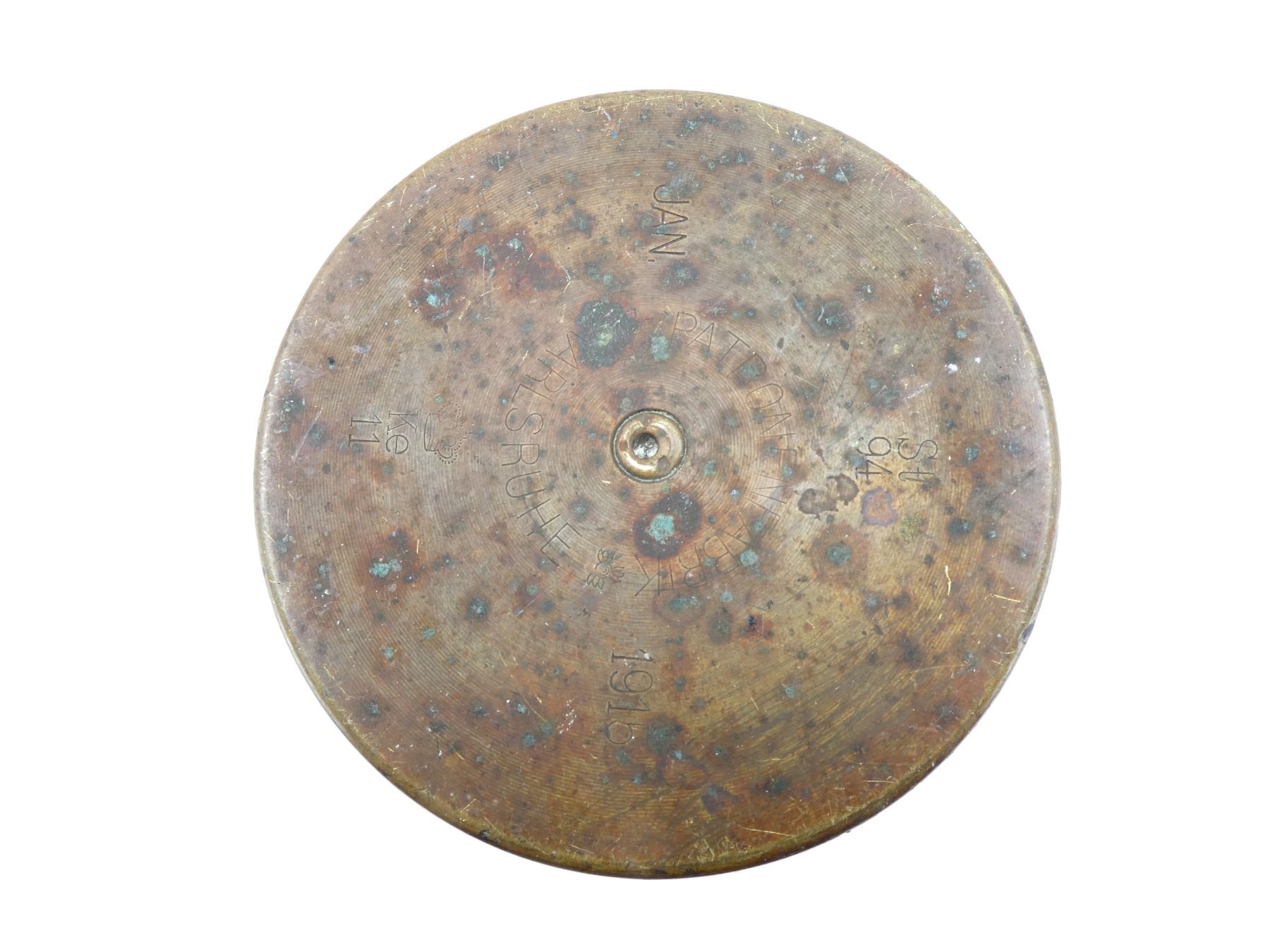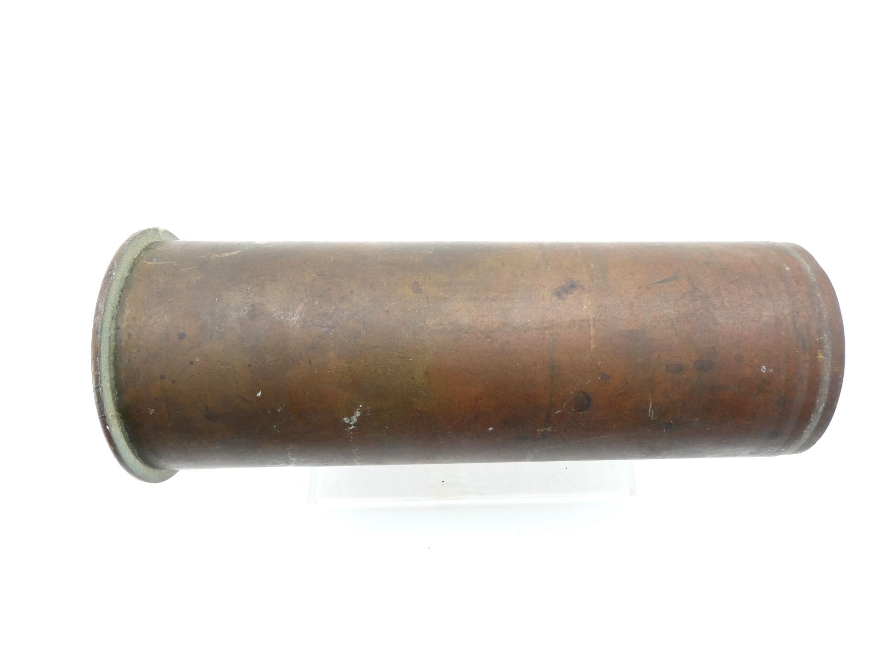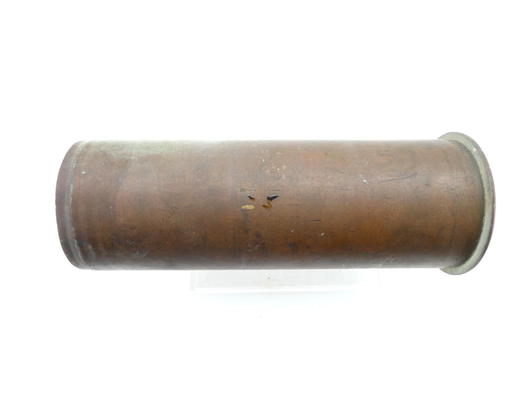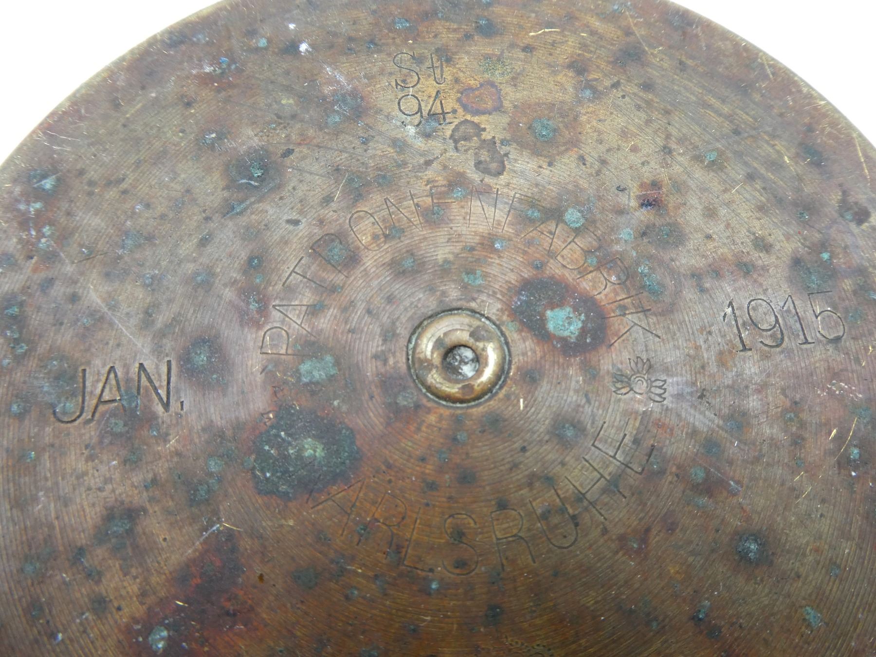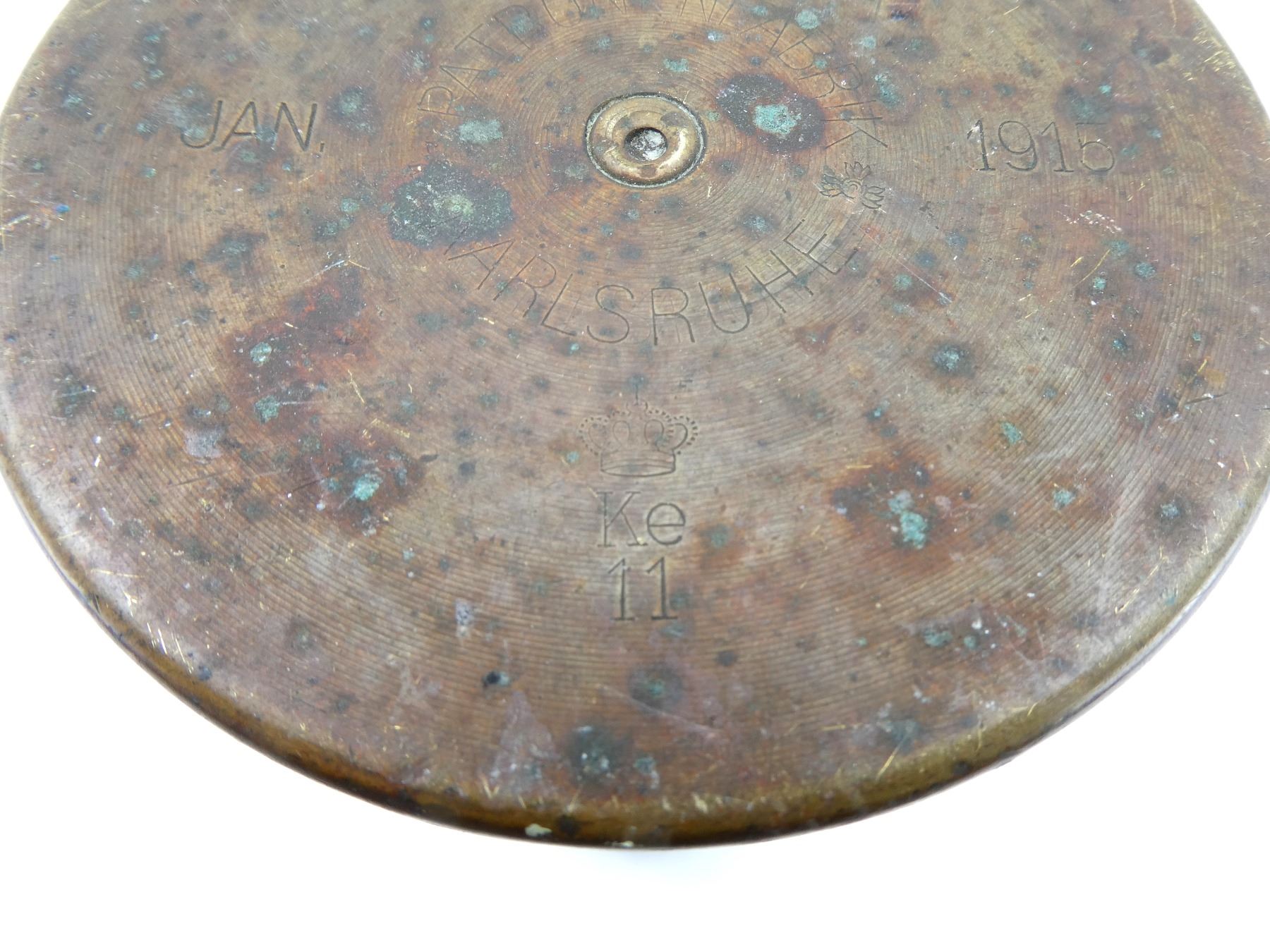 (1) BRASS SHELL CASING, FIRED PRIMER, BASE MARKED: "ST, 94, JAN., 1915, PATRONENFABRIK, KARLSRUHE", IMPERIAL CROWN OVER "KE" OVER "11", APPROX. 3 5/8" DIA. & OVERALL LENGTH APPROX. 9". SEE PHOTOS.
