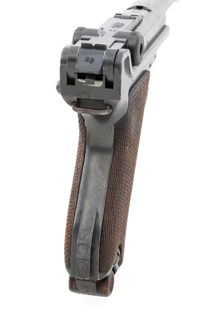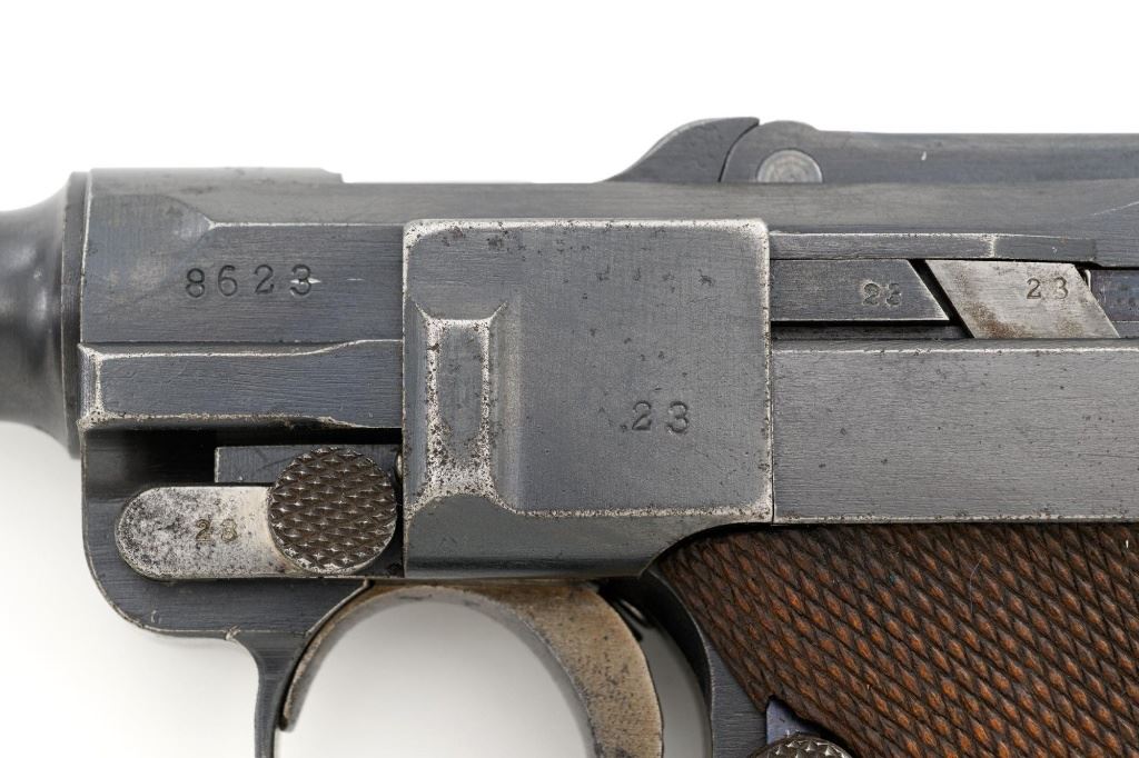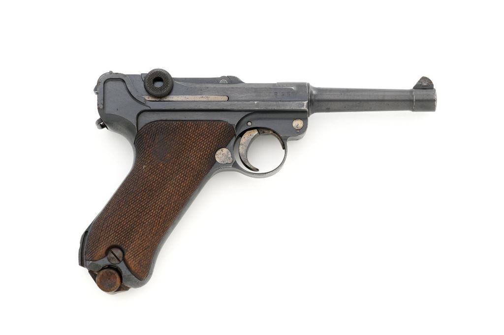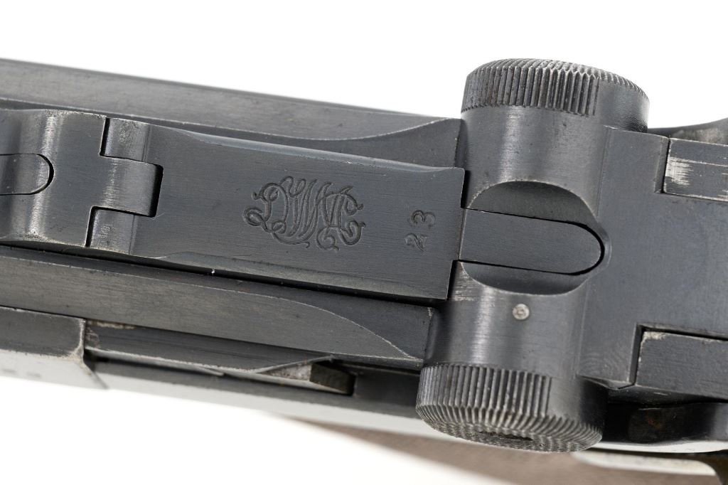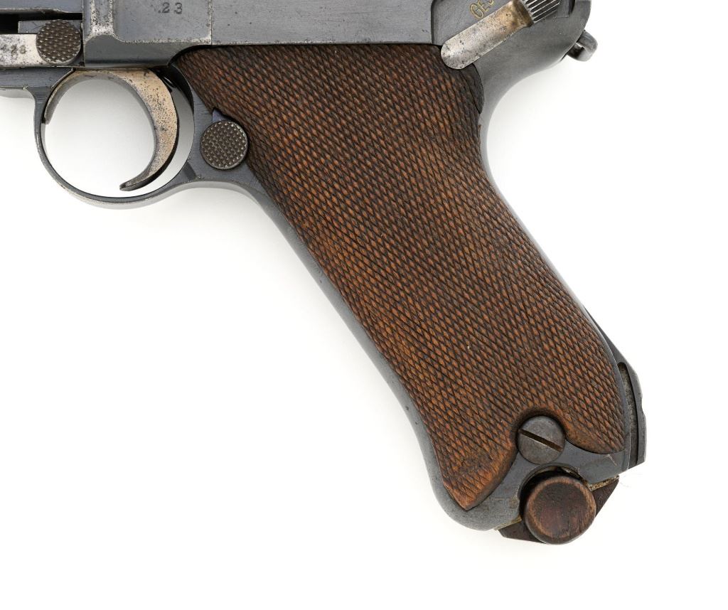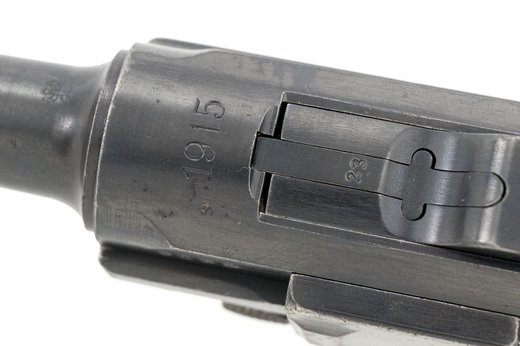 WWI German 1915 Dated DWM Luger Semi-Automatic Pistol, #8623, 9mm cal., 4" barrel, blue finish, straw colored small parts, checkered walnut grips, inverted-"V" front sight, fixed rear sight with small "V"-notched groove, with stock lug. Includes one mis-matched tin plated magazine with wood base, numbered "1273g+" on the base, no other markings. Pistol is marked "DWM" on toggle with "1915" date on top of chamber. Right side of receiver with three "(crown)/script letter" military proofs and test fire proof mark. All visible numbers matching (excluding the magazine), including both grips. Condition is fine, retaining approx. 93%-94% original blue, with edge and muzzle wear accounting for most of the finish loss. Front and backstrap are strong, showing light wear to the stock lug. There is light pitting visible at the muzzle, sideplate, and takedown lever, with mild salt and pepper blemishes on the straw colored parts. Factory lettering and proof marks are clear. Small parts retain approx. 60%-65% thinning and toning straw colors. Grips show moderate age and wear, with a larger flat spot on the upper section of the right panel. There is also a small piece missing from behind the safety lever on the left panel. Action and hold open function properly. Bore is bright, no frosting or erosion, rifling is good. Est.: $1,200-$1,800. (C&R/PPT)