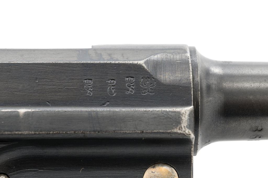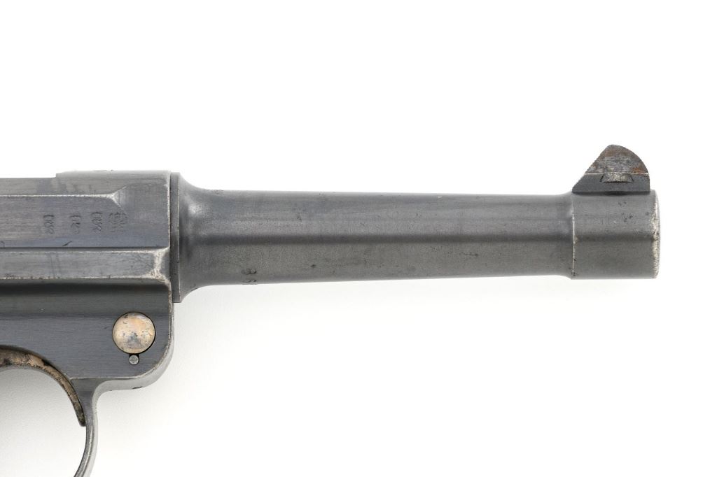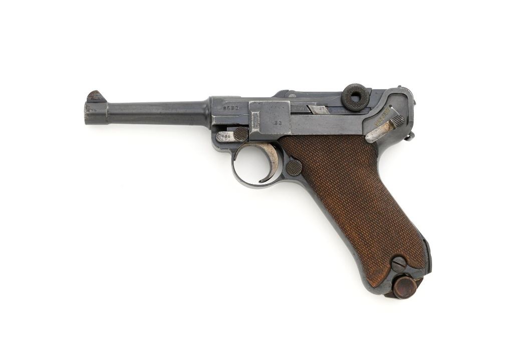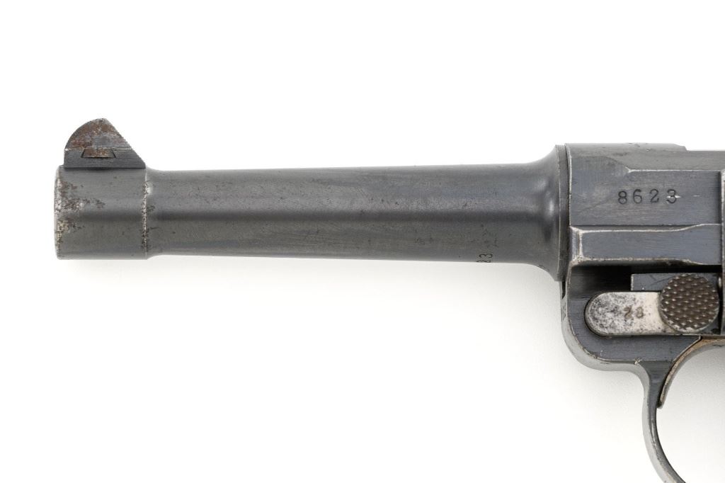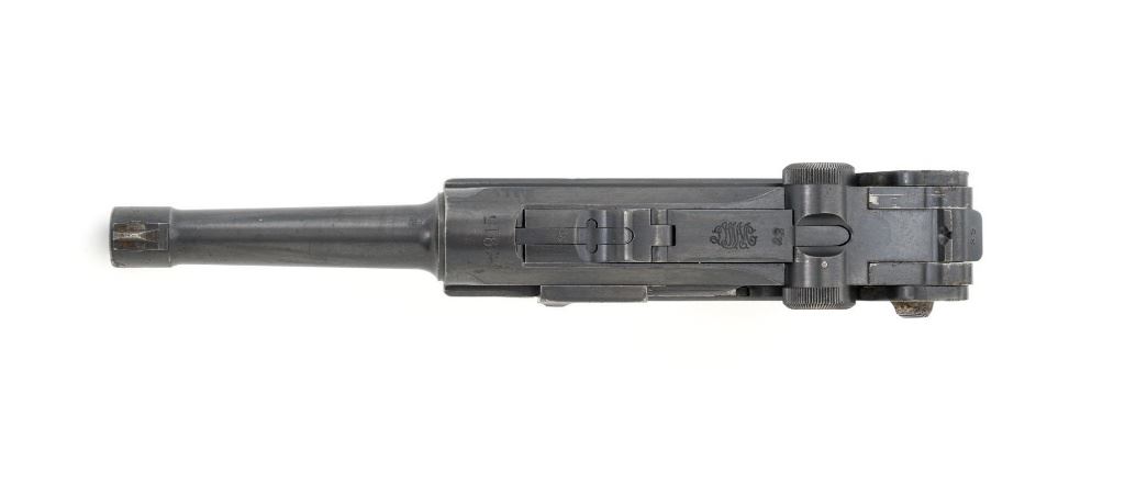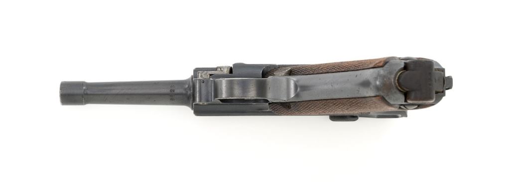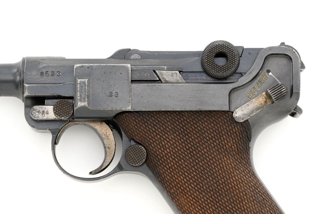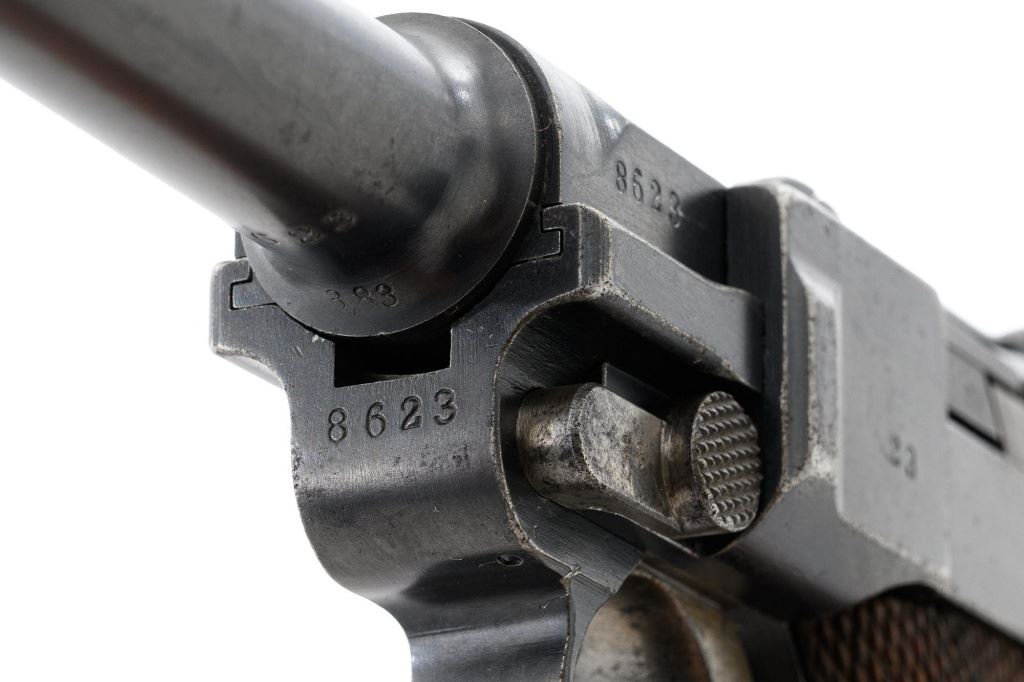 WWI German 1915 Dated DWM Luger Semi-Automatic Pistol, #8623, 9mm cal., 4" barrel, blue finish, straw colored small parts, checkered walnut grips, inverted-"V" front sight, fixed rear sight with small "V"-notched groove, with stock lug. Includes one mis-matched tin plated magazine with wood base, numbered "1273g+" on the base, no other markings. Pistol is marked "DWM" on toggle with "1915" date on top of chamber. Right side of receiver with three "(crown)/script letter" military proofs and test fire proof mark. All visible numbers matching (excluding the magazine), including both grips. Condition is fine, retaining approx. 93%-94% original blue, with edge and muzzle wear accounting for most of the finish loss. Front and backstrap are strong, showing light wear to the stock lug. There is light pitting visible at the muzzle, sideplate, and takedown lever, with mild salt and pepper blemishes on the straw colored parts. Factory lettering and proof marks are clear. Small parts retain approx. 60%-65% thinning and toning straw colors. Grips show moderate age and wear, with a larger flat spot on the upper section of the right panel. There is also a small piece missing from behind the safety lever on the left panel. Action and hold open function properly. Bore is bright, no frosting or erosion, rifling is good. Est.: $1,200-$1,800. (C&R/PPT)