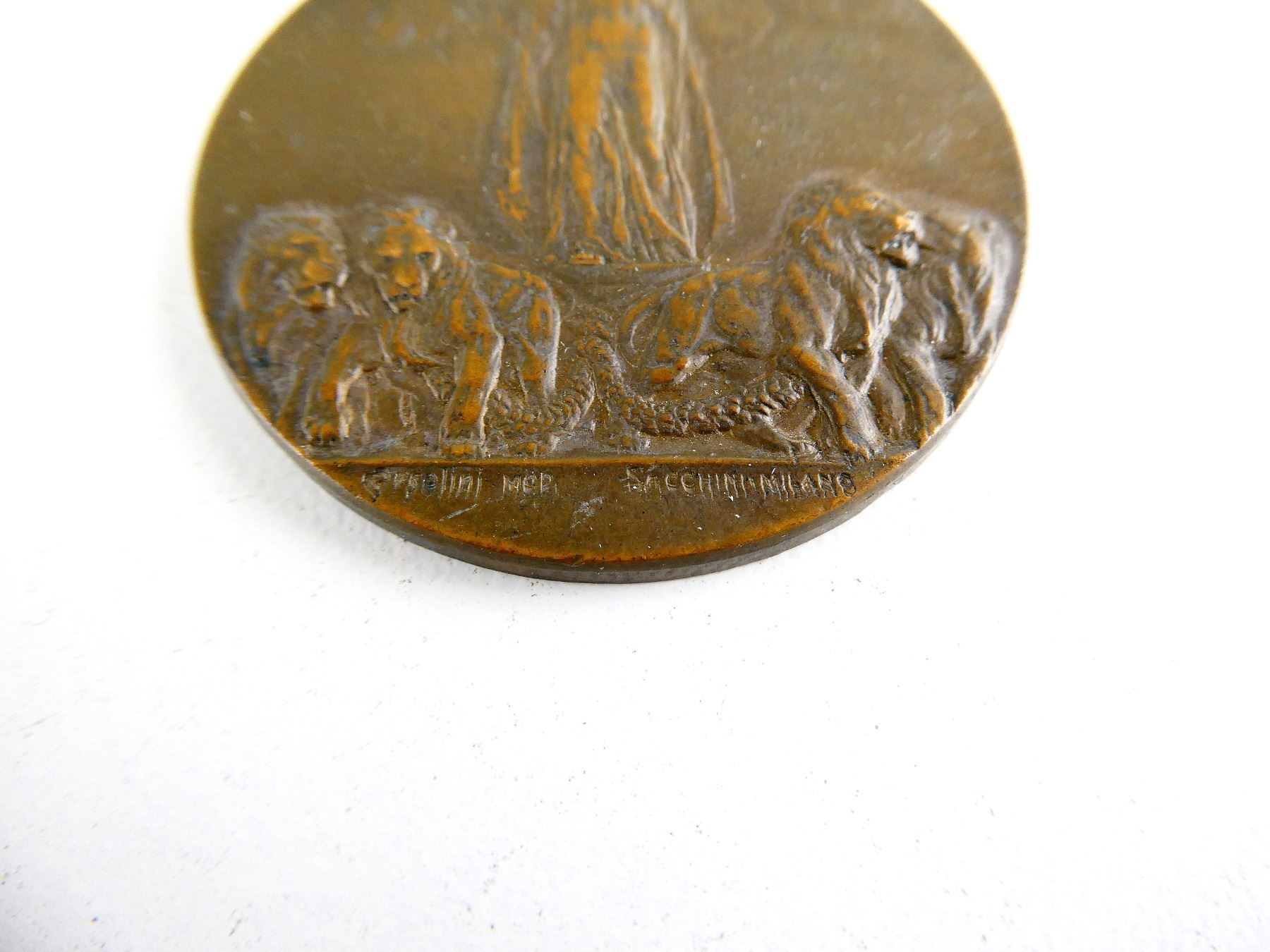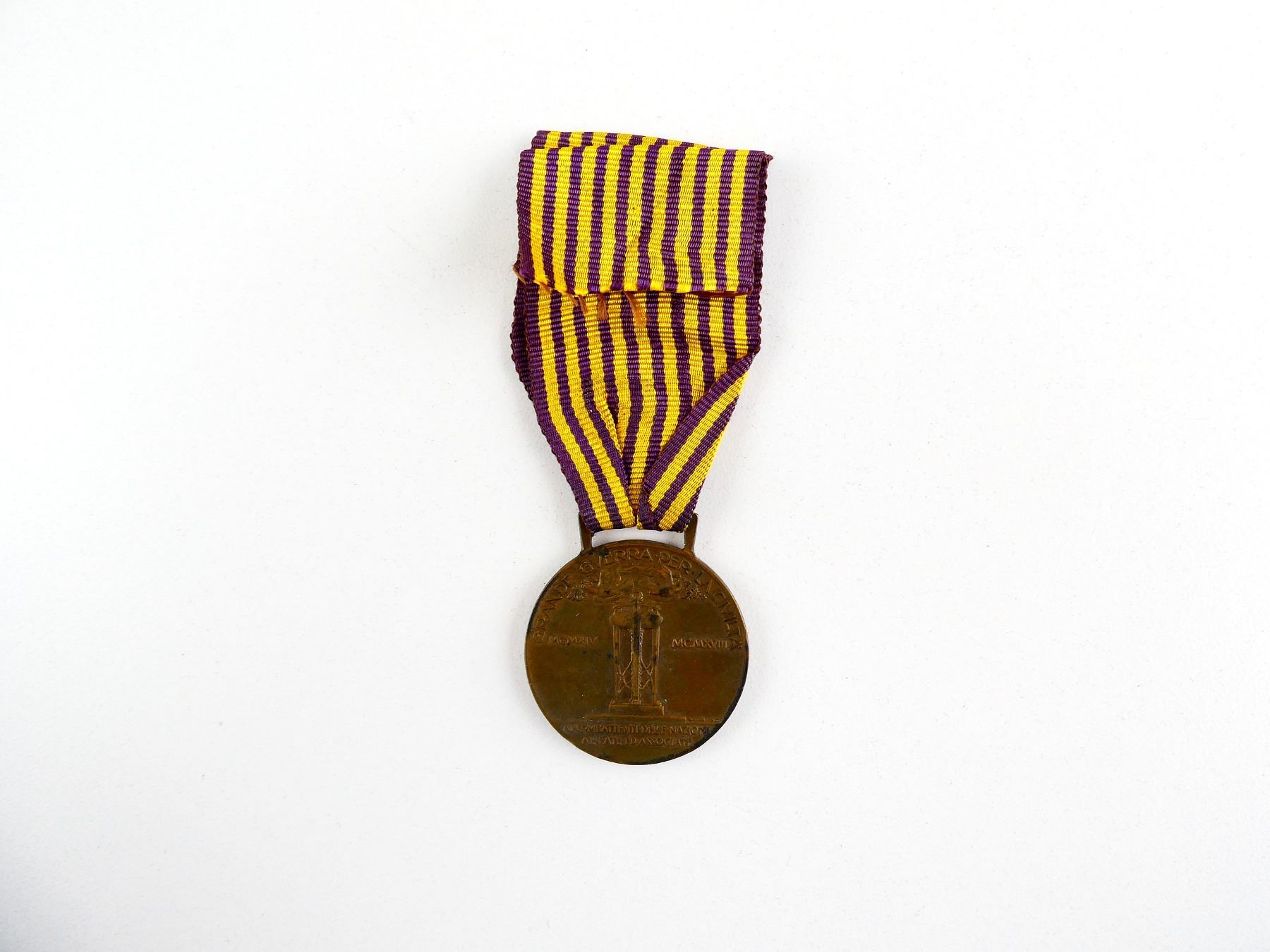 (1) UN-NAMED FULL SIZE BRONZE VICTORY MEDAL WITH WRONG UNKNOWN MEDAL RIBBON, MEDAL MARKED: "GRANDE GVERRA PER LA CIVILTA", "MCMXIV", "MCMXVIII", "AI COMBATTENTI DELLE NAZIONI, ALLEATE ED ASSOCIATE", "G.VILLA-INC.", OTHER-SIDE MARKED: "?RSOLINI MOD., SACCHINI-MILANO". SEE PHOTOS.