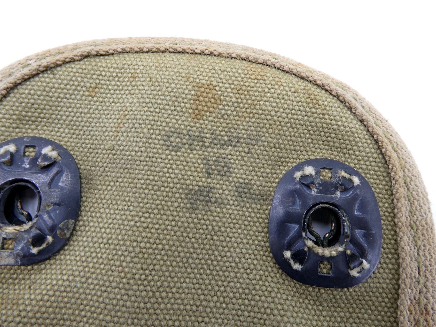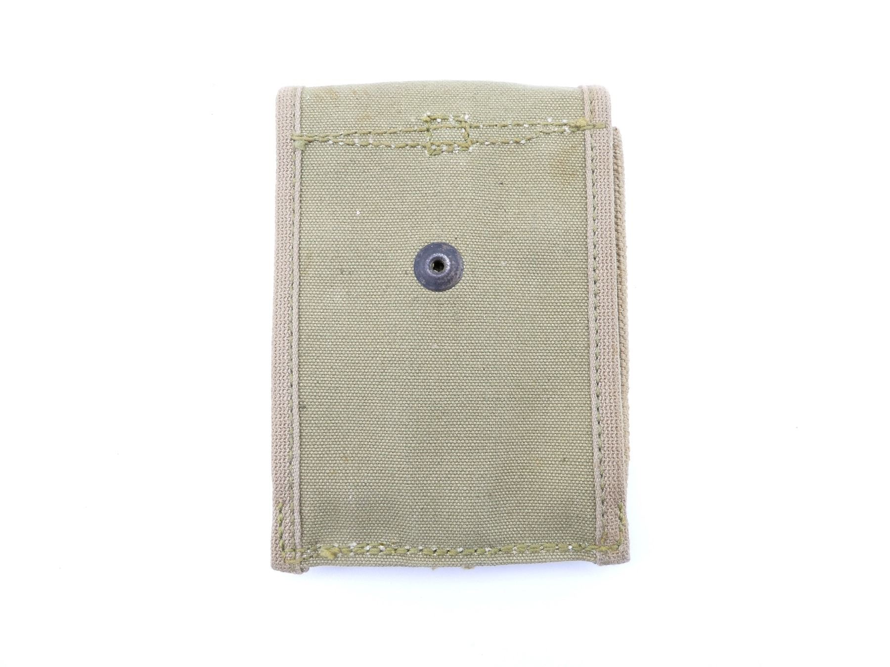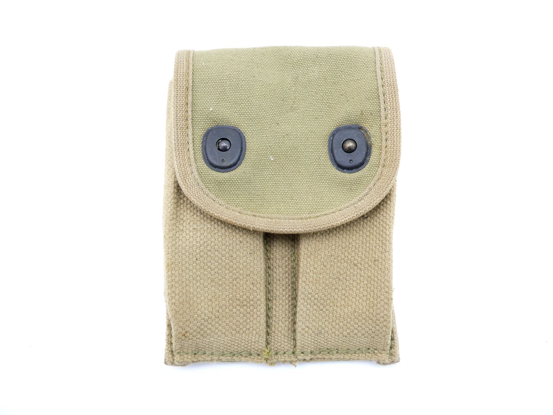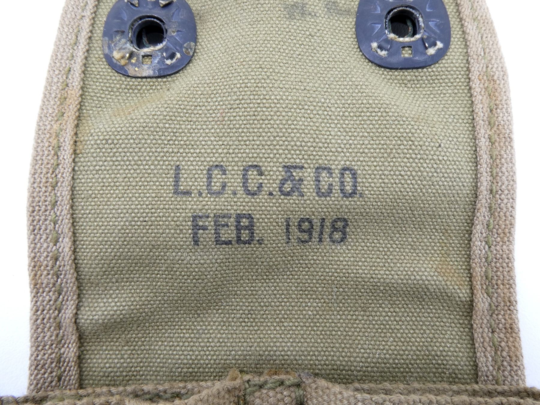 (1) TAN P37 WEB CANVAS DOUBLE-POCKET MAG POUCH, MARKED: "L.C.C.&CO., FEB. 1918", VARIOUS OTHER FAINT / UN-CLEAR MARKINGS, SNAP CLOSURES, SNAP FOR BELT. SEE PHOTOS.