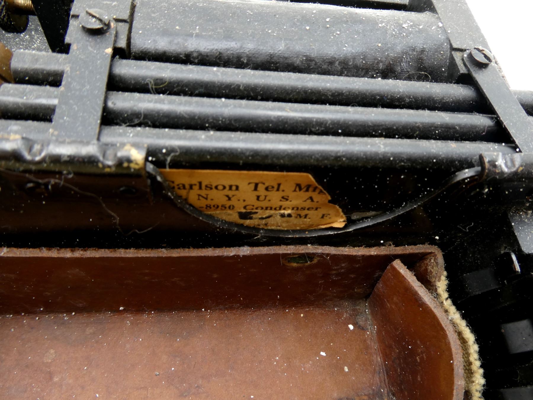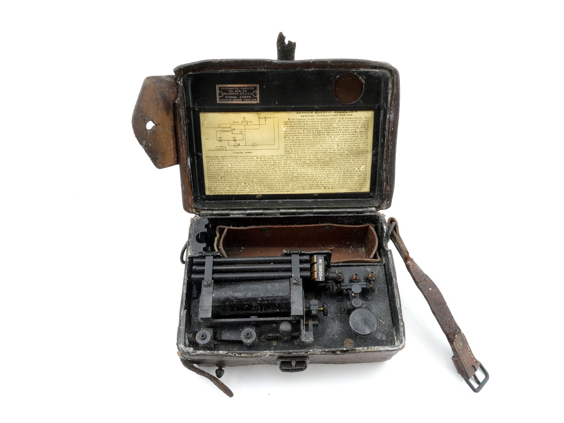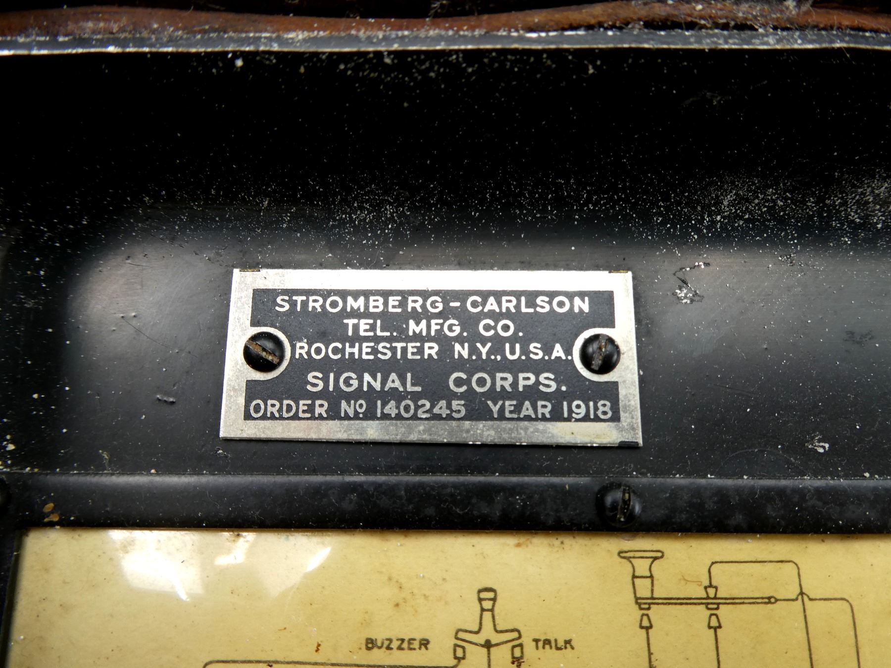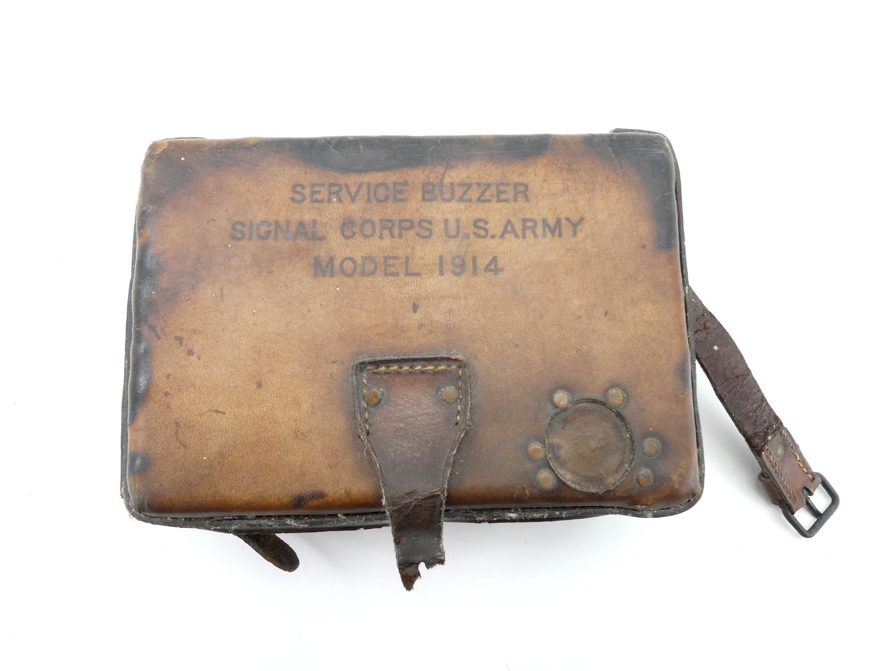 (1) SERVICE BUZZER MODEL 1914, CAN OPERATE AS A VOICE FIELD TELEPHONE OR AS A MORSE CODE UNIT, LEATHER WRAPPED, LID MARKED: "SERVICE BUZZER, SIGNAL CORPS U.S. ARMY, MODEL 1914", DATA PLATE INSIDE MARKED: "STROMBERG-CARLSON, TEL. MFG. CO., ROCHESTER N.Y., U.S.A., SIGNAL CORPS., ORDER NO. 140245 YEAR 1918", INSTRUCTIONAL SHEET ON LID INSIDE, MAY NOT BE COMPLETE / SOME PIECES MISSING, SHOWS AGE / WEAR / TEAR. SEE PHOTOS.