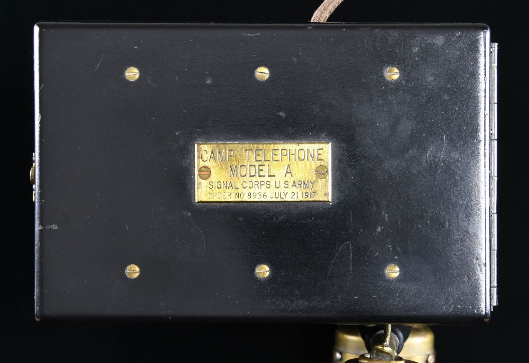 This WWI US Army camp telephone measures approximately 9 3/4" by 5" by 7 1/2". The internal components are housed in a dovetailed oak box with an iron top and bottom. The interior of the top lid has paper connection instructions within a metal frame. The exterior of the lid has a brass plaque that reads "CAMP TELEPHONE MODEL A SIGNAL CORPS U S ARMY ORDER NO 8936 JULY 21 1917". A brass, painted aluminum and composite handset hangs off the front of the case. A braided cord connects the handset to the interior. CONDITION: the telephone appears to show light wear throughout. The hand crank on the side functions well and the entire apparatus seems to work but has not been tested with another machine. (02-24288/BF.) $200-400.