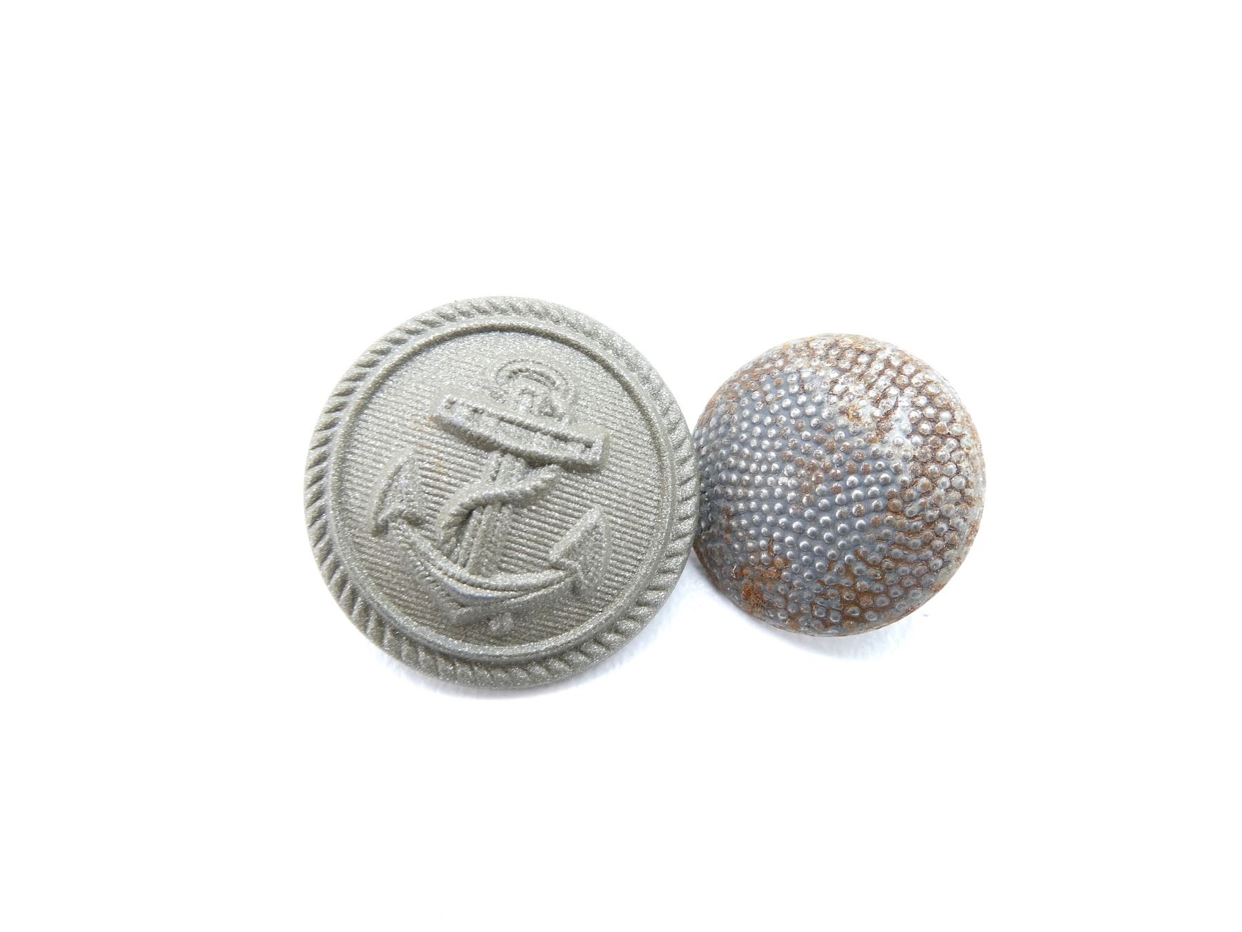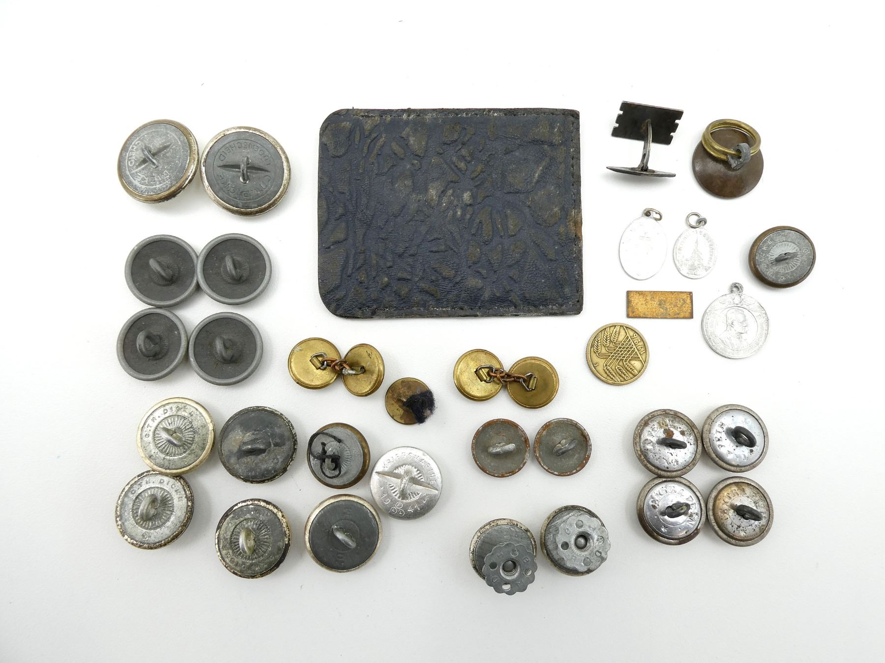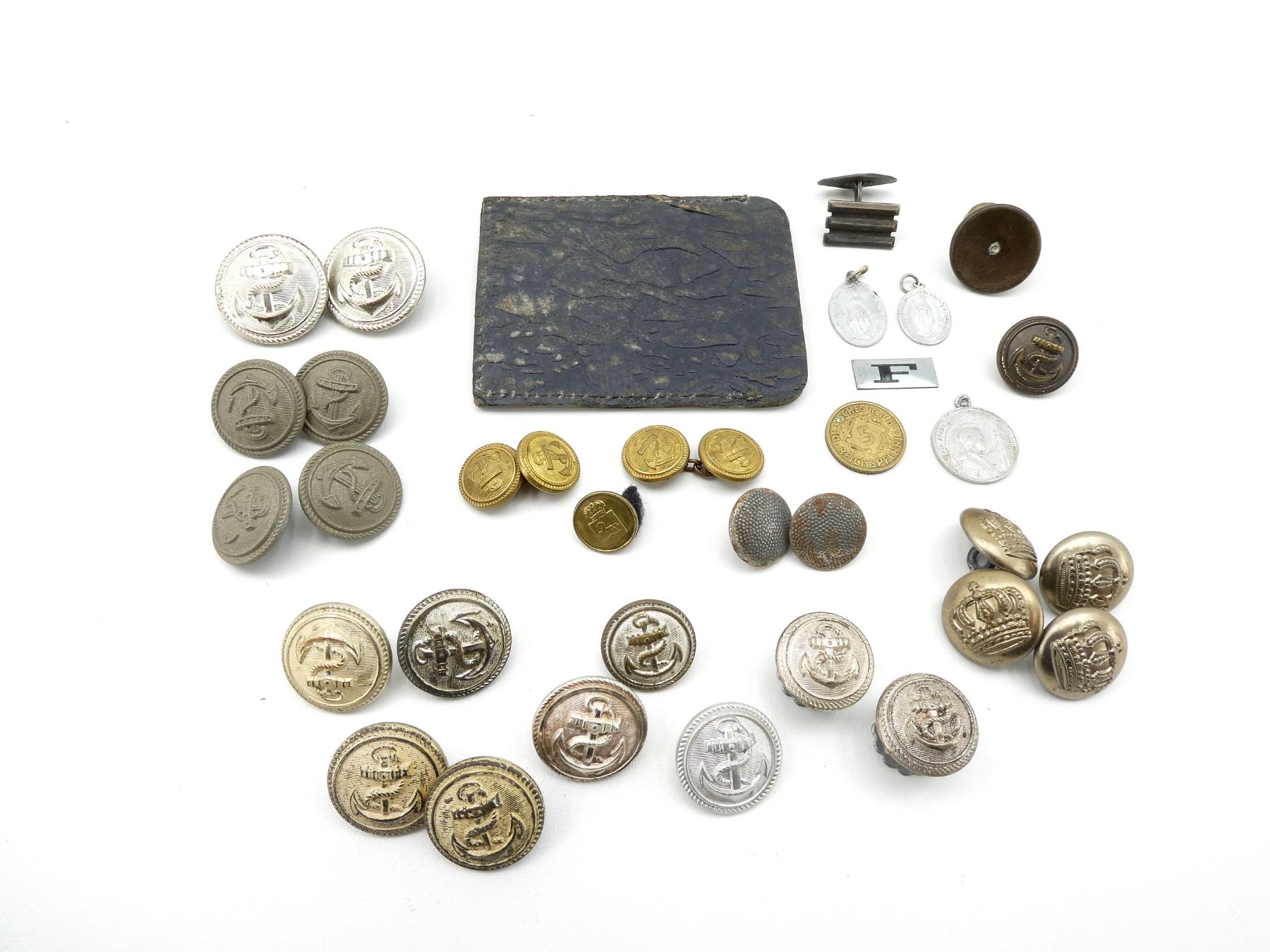APPROX. (35) PIECES, VARIOUS MATERIALS, MAY INCLUDE OTHER COUNTRIES, INCLUDES; WWI IMPERIAL GERMAN ARMY CROWN BUTTONS, WWII GERMAN NAVAL BUTTONS, SILVER PEBBLED BUTTONS, 1926 DEUTSCHES REICH 5 REICHSPFENNIG COIN, DANISH GEODETIC INSTITUTE MAP MEASURING TOOL, ETC. SEE PHOTOS.