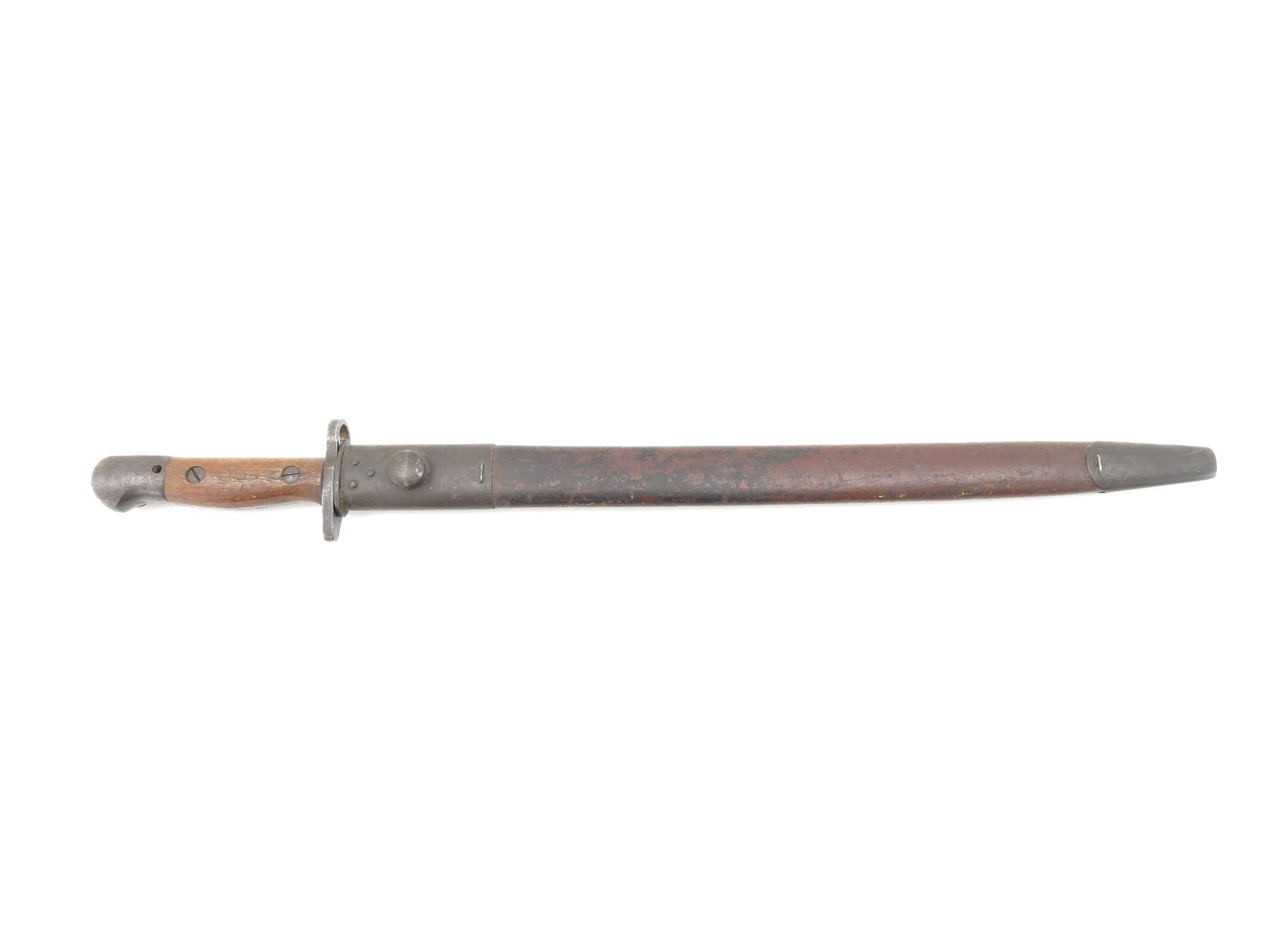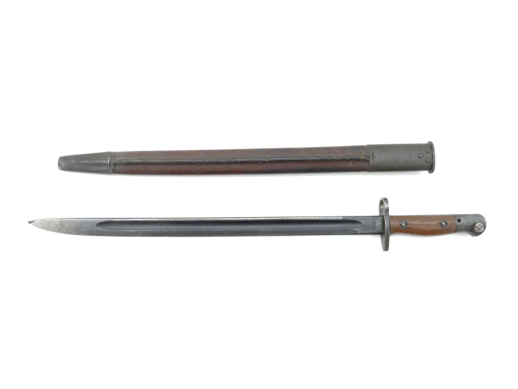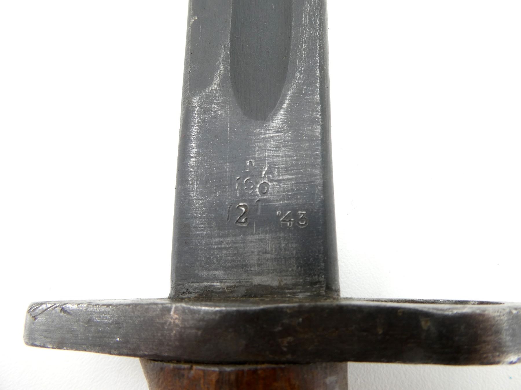 (1) FITS LEE ENFIELD NO.1 MKIII RIFLES, RICASSO MARKED: "MA" OVER "190?" OVER "12, 1 '43", OTHER-SIDE MARKED: "X" (BEND TEST), "OA", BROAD ARROW, 2-PIECE WOODEN GRIP MARKED: "SLAZ 42", OTHER-SIDE FAINTLY MARKED: "SLAZ 4?", METAL POMMEL, NO VISIBLE MARKINGS, LEATHER & STEEL SCABBARD, LEATHER MARKED: "MANGROVITE '42", THROAT END MARKED: "OA", BLADE APPROX. 17" & OVERALL LENGTH APPROX. 21.75". SEE PHOTOS.