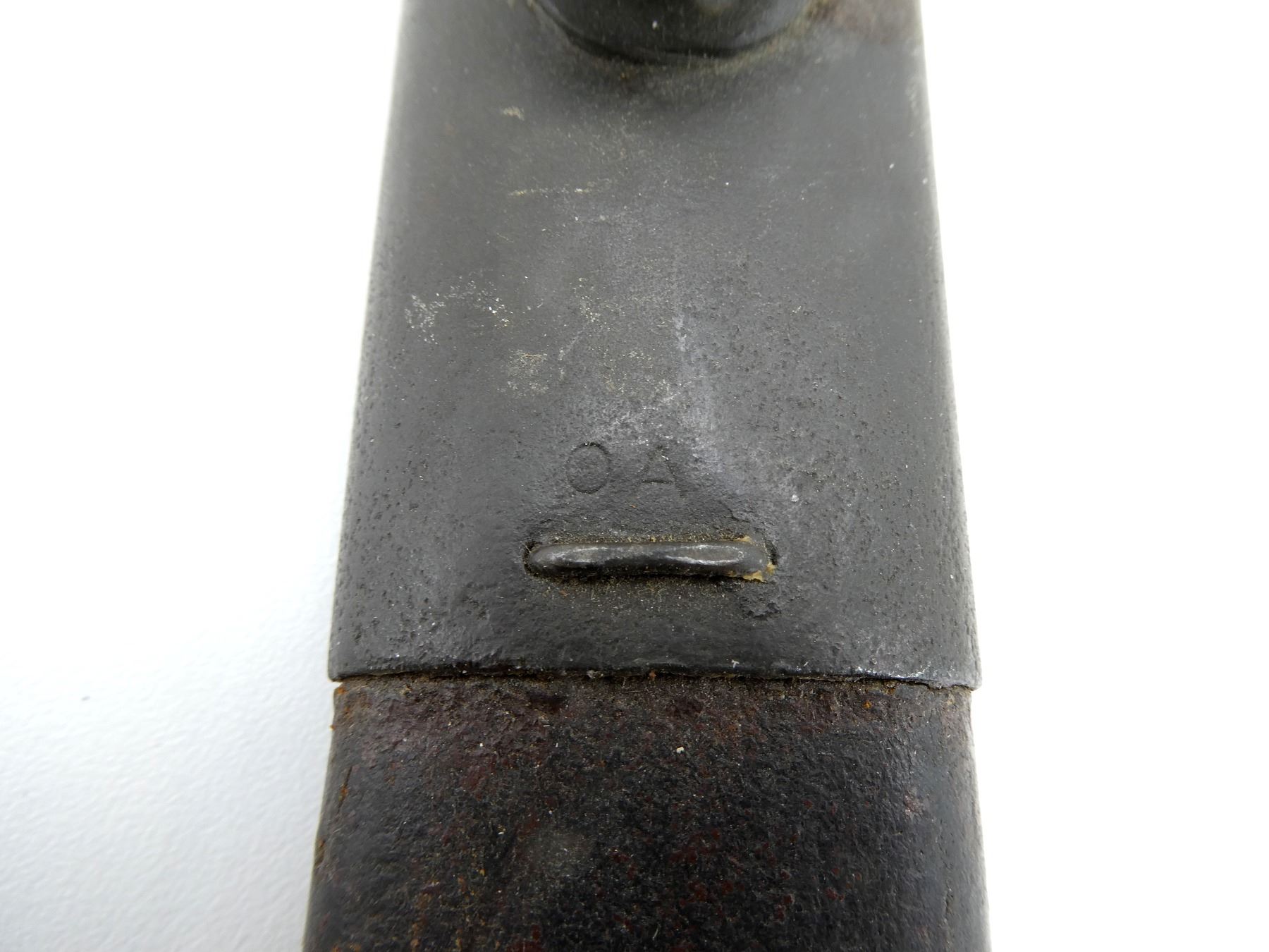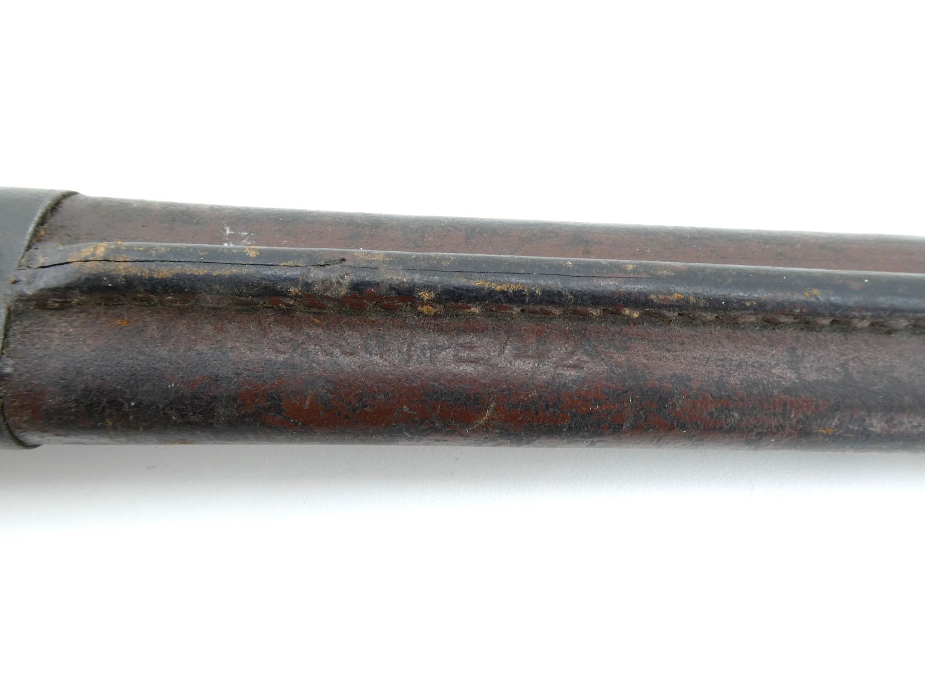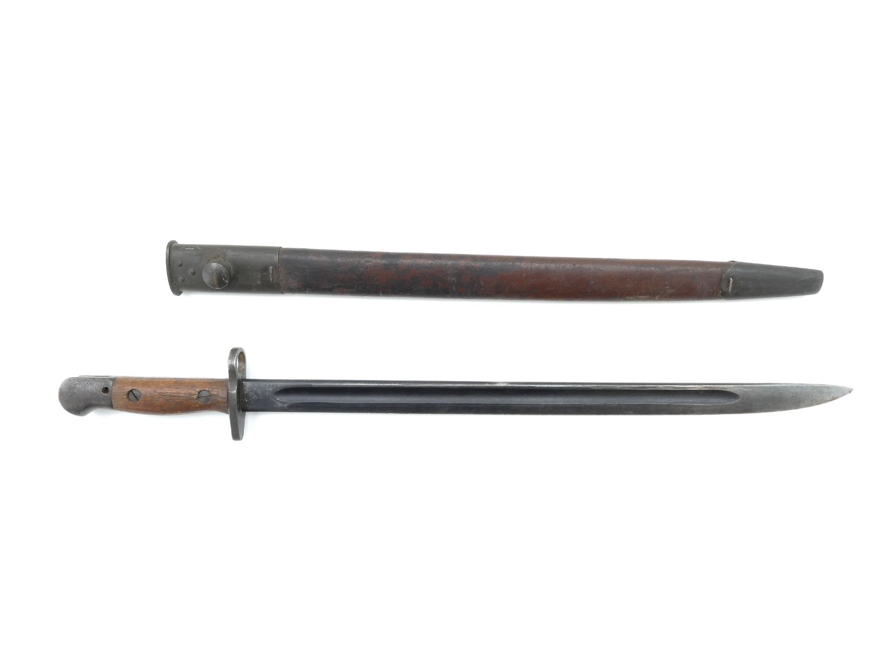 (1) FITS LEE ENFIELD NO.1 MKIII RIFLES, RICASSO MARKED: "MA" OVER "190?" OVER "12, 1 '43", OTHER-SIDE MARKED: "X" (BEND TEST), "OA", BROAD ARROW, 2-PIECE WOODEN GRIP MARKED: "SLAZ 42", OTHER-SIDE FAINTLY MARKED: "SLAZ 4?", METAL POMMEL, NO VISIBLE MARKINGS, LEATHER & STEEL SCABBARD, LEATHER MARKED: "MANGROVITE '42", THROAT END MARKED: "OA", BLADE APPROX. 17" & OVERALL LENGTH APPROX. 21.75". SEE PHOTOS.