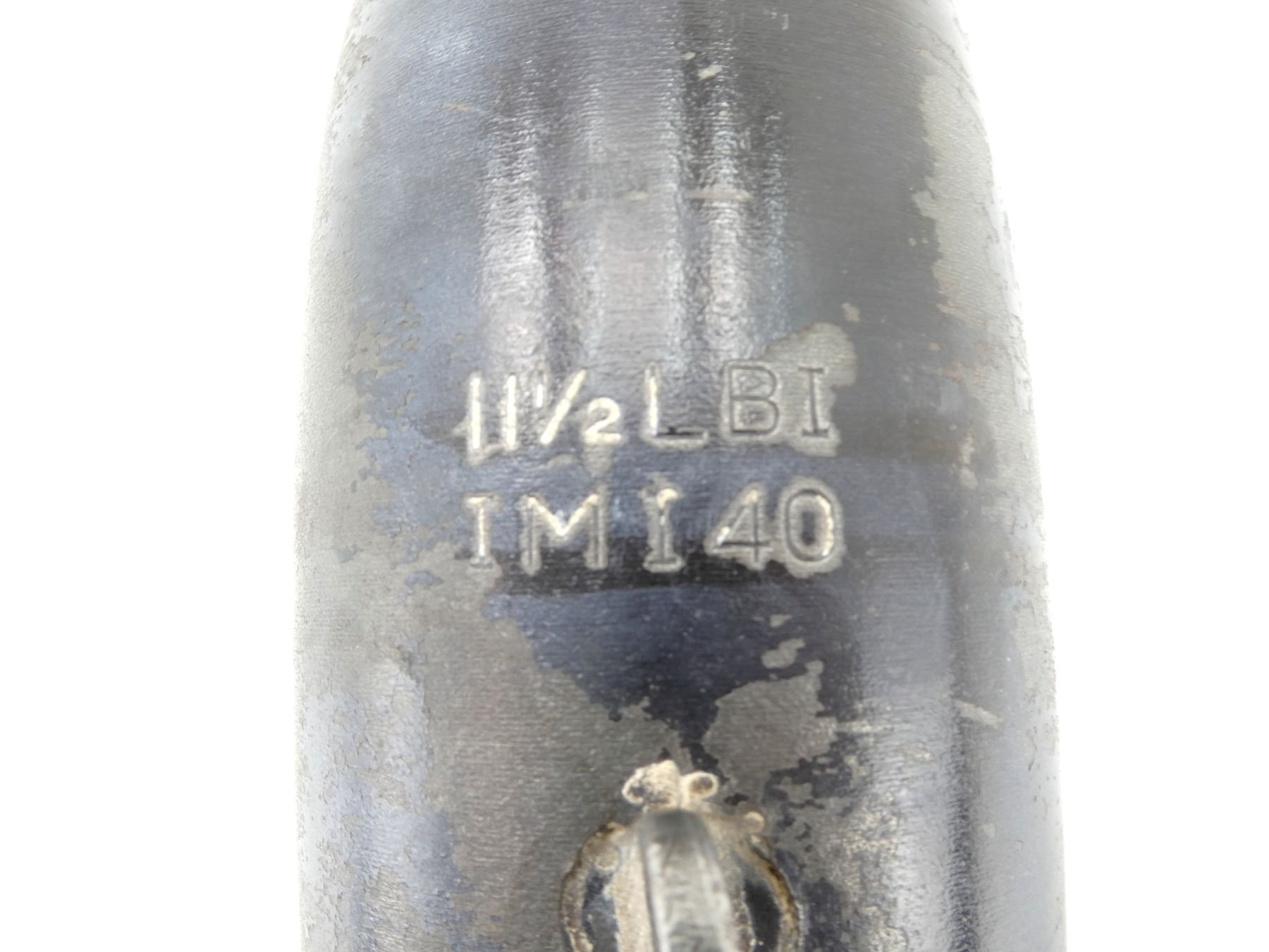 (1) STEEL WITH FINS / PIN, MARKED: "11 1/2 LBI, IMI 40", SOME ORIGINAL WHITE PAINT REMAINS, FEW HOLES IN BODY / NEAR FINS, MISSING NOSE / CAP, APPROX. 3" DIA. & OVERALL LENGTH APPROX. 17.5". SEE PHOTOS.