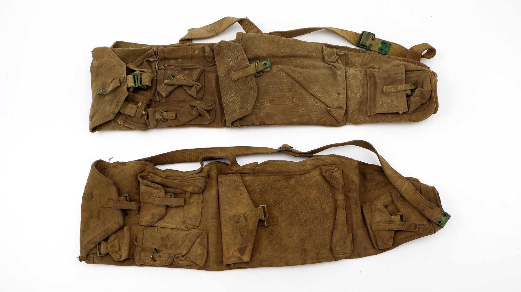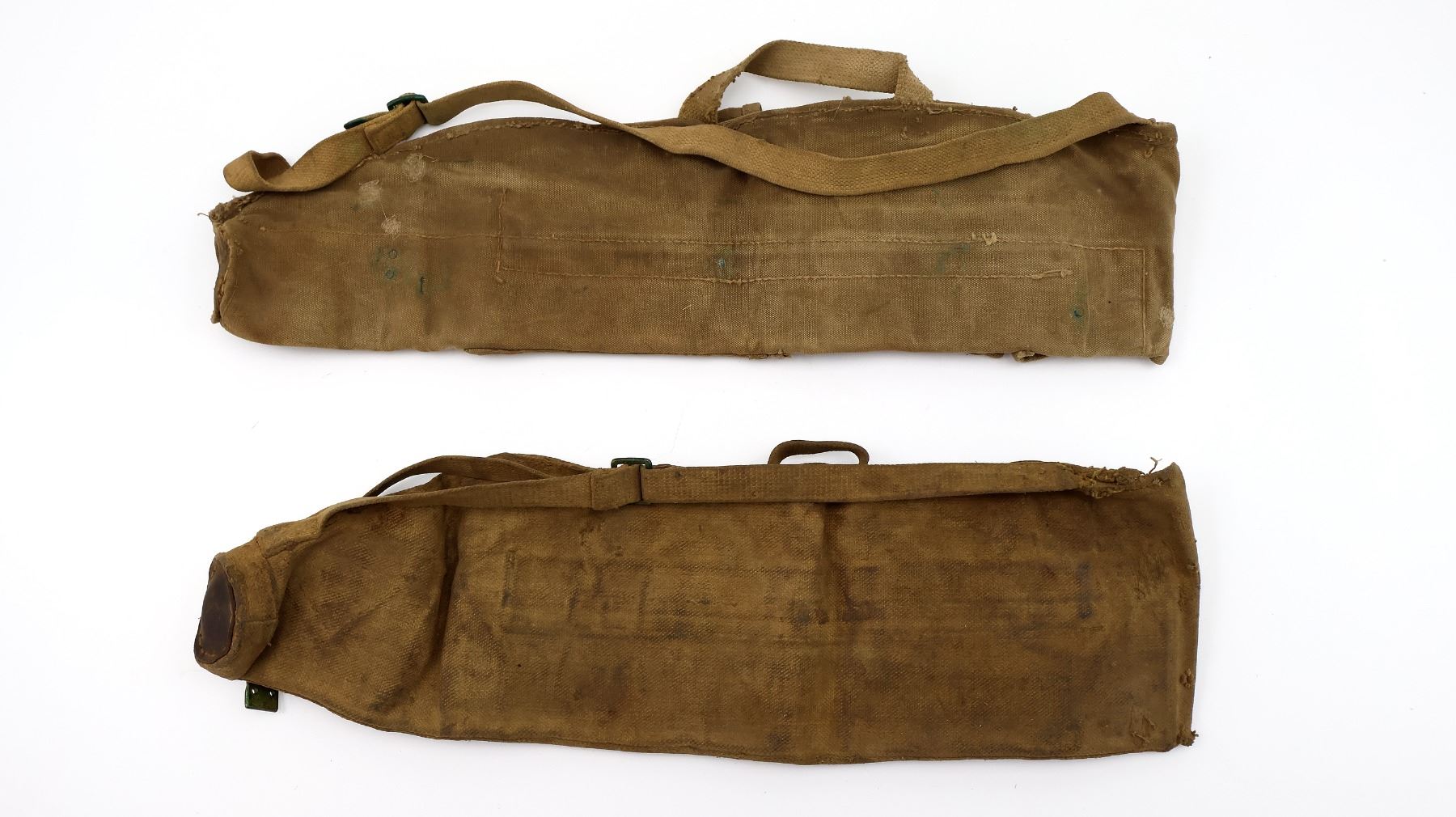 LOT INCLUDES; (2) FITS .303 BR LMG BARRELS, GUNNER'S KIT, OILER, ETC., TAN P37 WEB CANVAS WITH BRASS FITTINGS & SHOULDER STRAPS, ONE MARKED: "?E. LTD. ??43", OTHER HAS NO VISIBLE MARKINGS, CANVAS CARRY HANDLES, SHOWS AGE / WEAR / TEAR, OALS APPROX. 25". SEE PHOTOS.