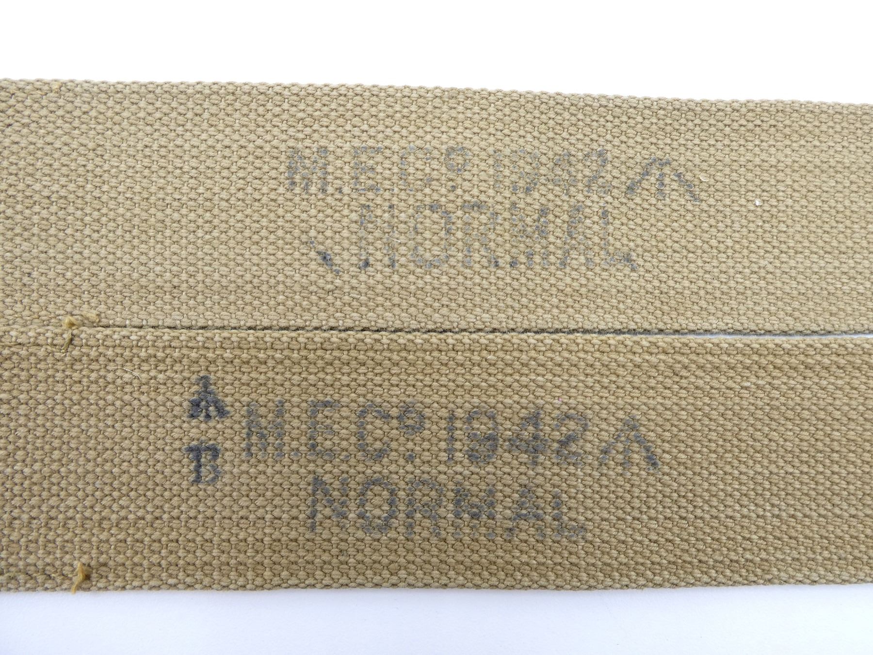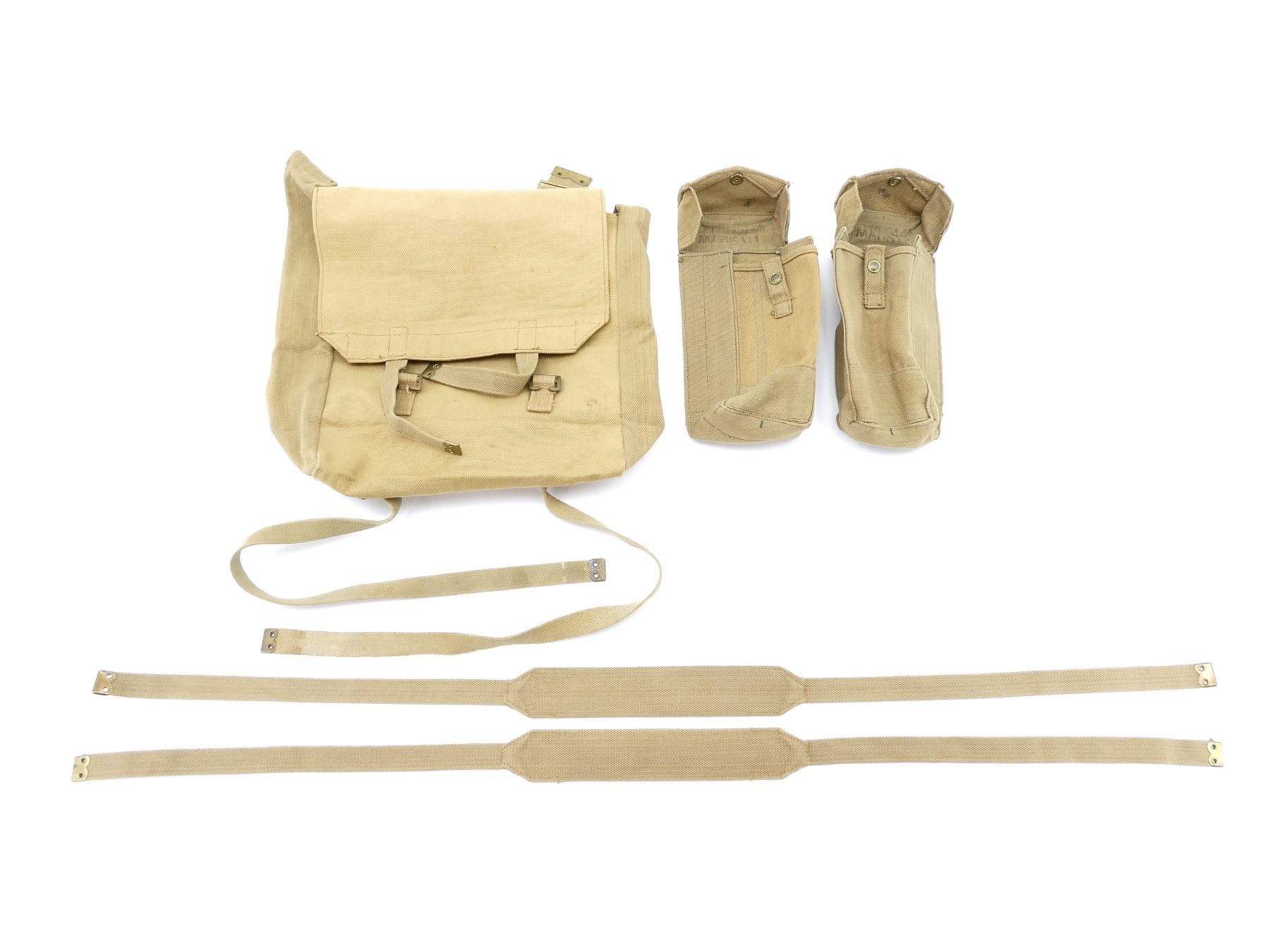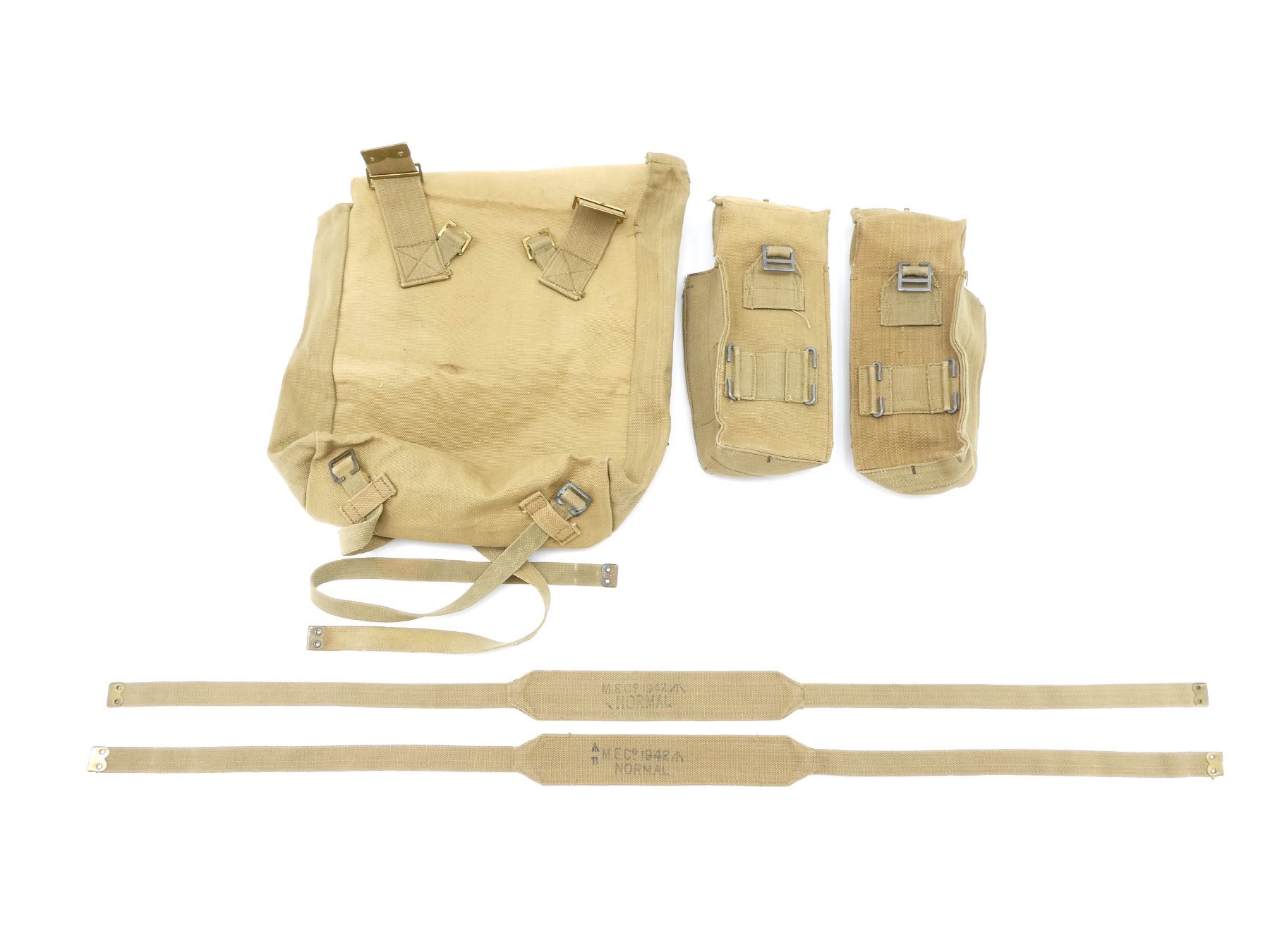 LOT INCLUDES; (2) TAN P37 WEB AMMO POUCHES, BOTH MARKED: "R.P.LTD. 1944" BROAD ARROW, "MARK III", BROAD ARROW OVER "35", BRASS / STEEL FITTINGS, (2) TAN P37 WEB SHOULDER STRAPS, BOTH MARKED: "M.E.CO. 1942" BROAD ARROW, "NORMAL", ONE WITH BROAD ARROW OVER "B", BRASS FITTINGS, OALS APPROX. 45.5" / 46" & (1) TAN P37 WEB LARGE FIELD PACK, MARKED: "A.C. 1941" WITH BROAD ARROW, VARIOUS OTHER FAINT / UN-CLEAR MARKINGS, BRASS FITTINGS. SEE PHOTOS.