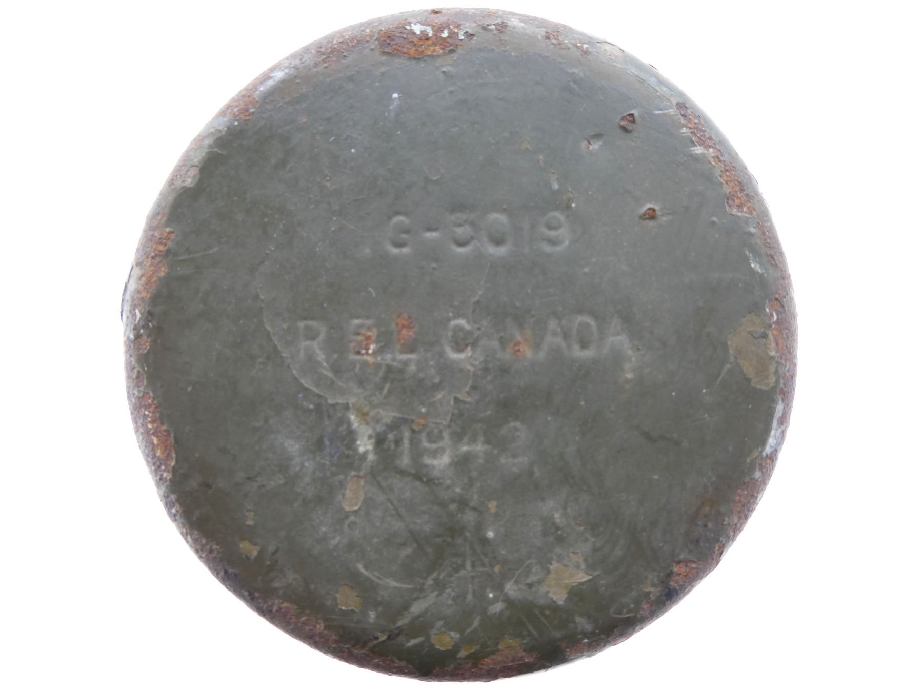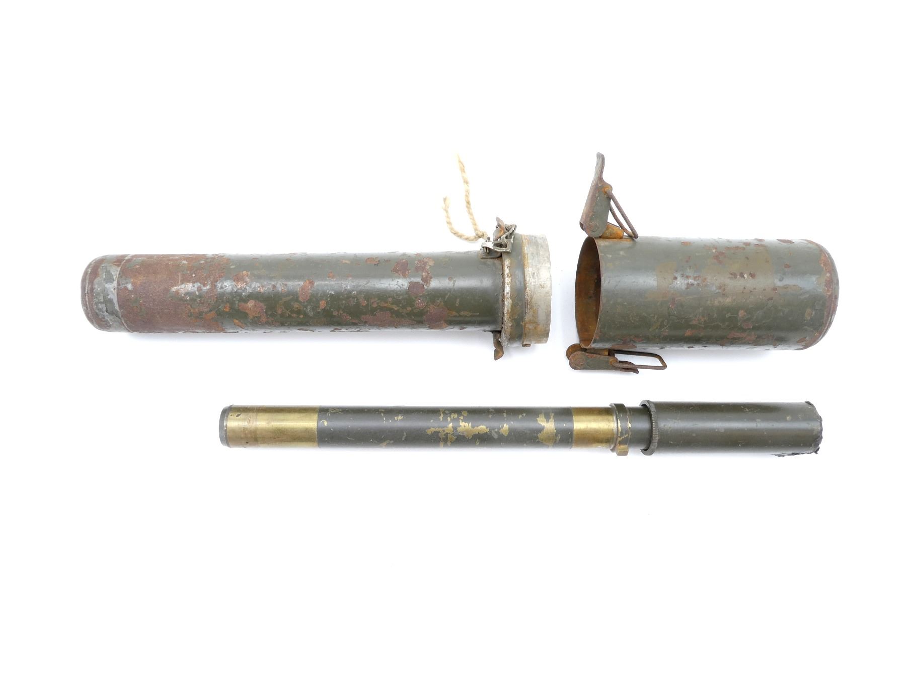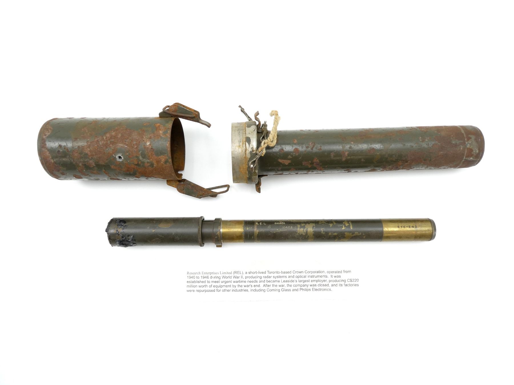 LOT INCLUDES; (1) GREEN PAINTED BRASS SCOPE, FITS VARIOUS ANTI-TANK GUNS, CLEAR OPTICS, WINDAGE RETICLE, MARKED: "TELESCOPE, SIGHTING, NO.22C MK. II, R.E.L. CANADA, 1942, 10603-C" WITH BROAD ARROW, SHOWS AGE / WEAR / TEAR, OVERALL LENGTH APPROX. 13 5/8" & (1) GREEN PAINTED STEEL CARRY CAN, MARKED: "IG-3019, R.E.L. CANADA, 1942" & BROAD ARROW, SHOWS AGE / WEAR / TEAR, APPROX. 2.5" DIA. & OVERALL LENGTH APPROX. 15.5". SEE PHOTOS.