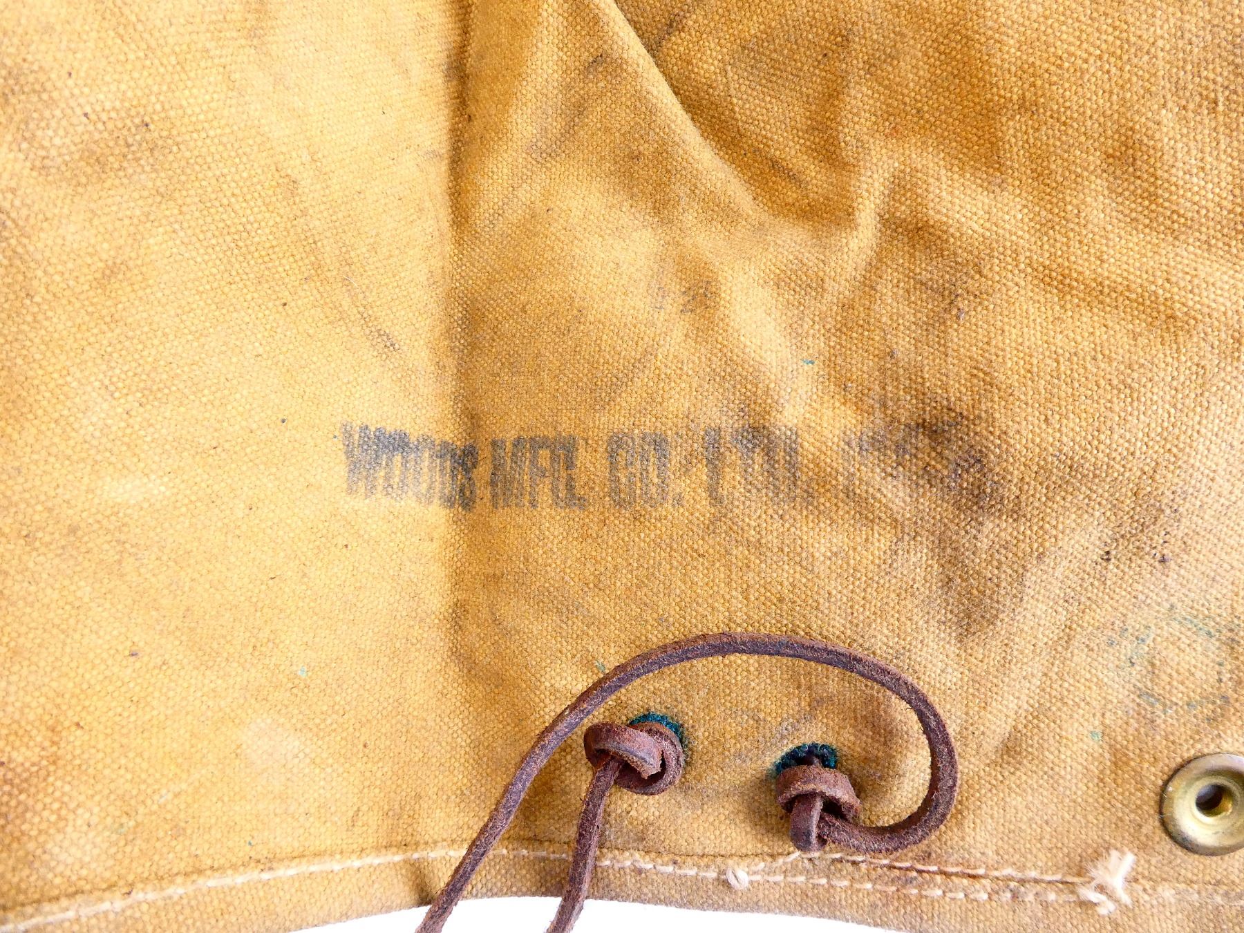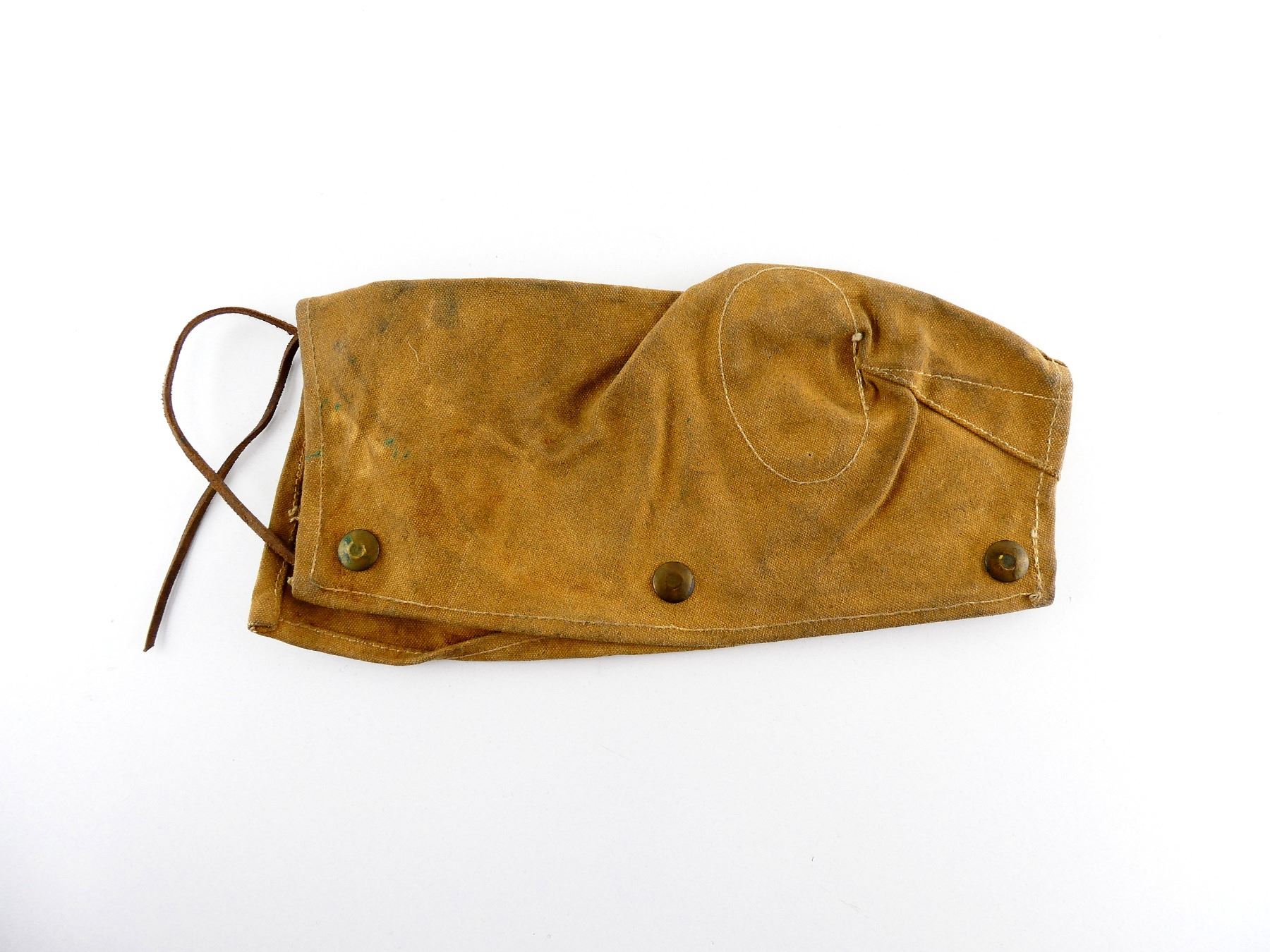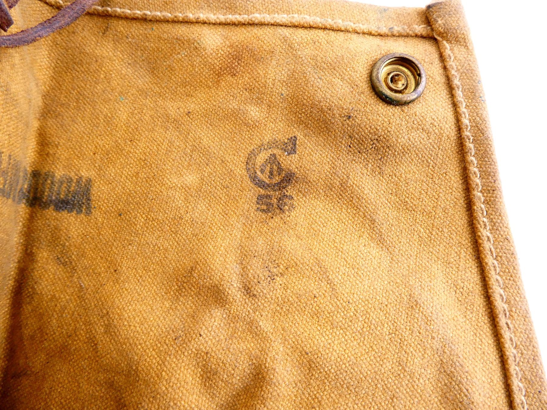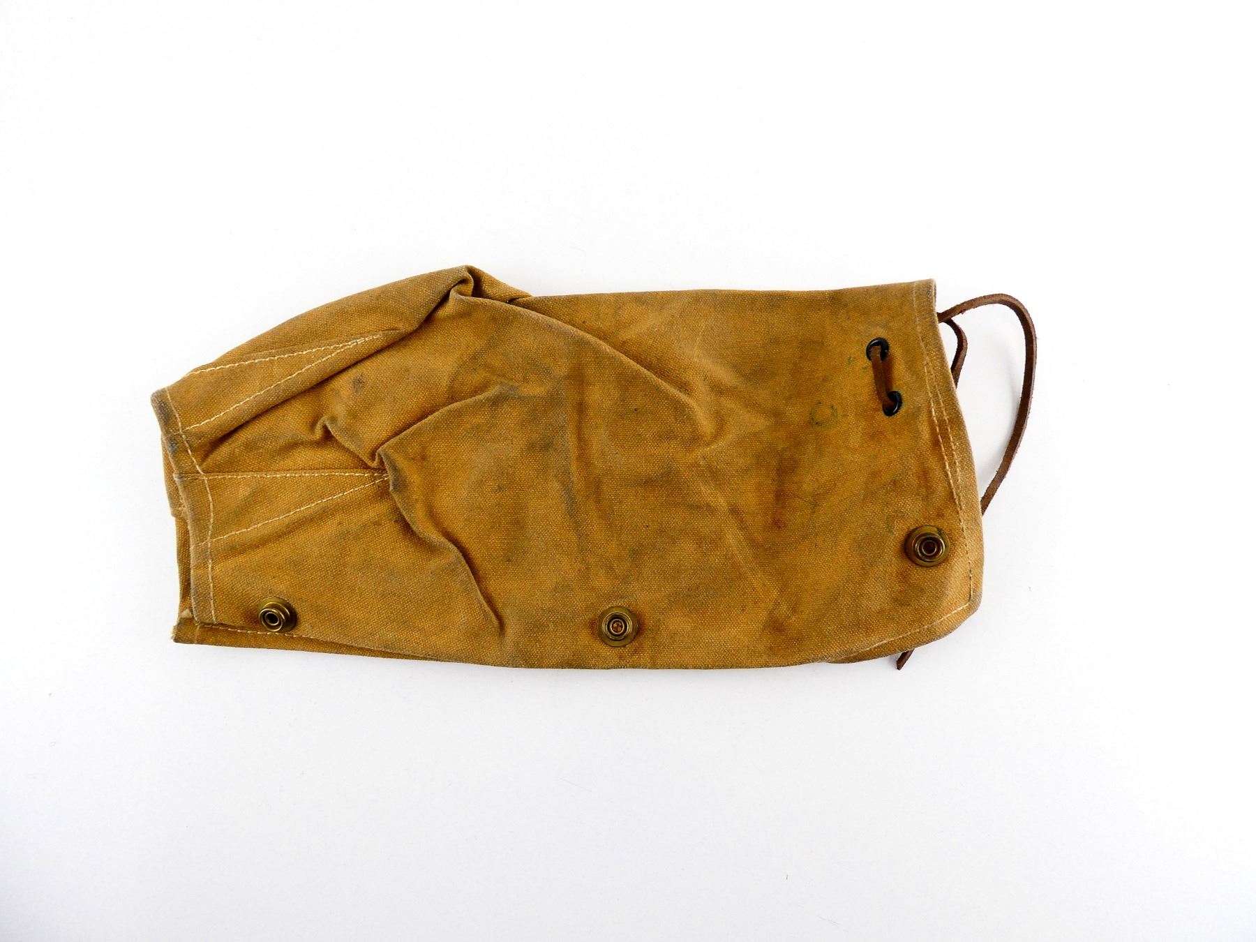 (1) LEE ENFIELD TAN CANVAS ACTION COVER WITH BRASS FITTINGS & LEATHER THONG, MARKED: "WOODS MFG. CO. LTD. 194?" WITH C-BROAD ARROW OVER "56", SHOWS AGE / WEAR. SEE PHOTOS.