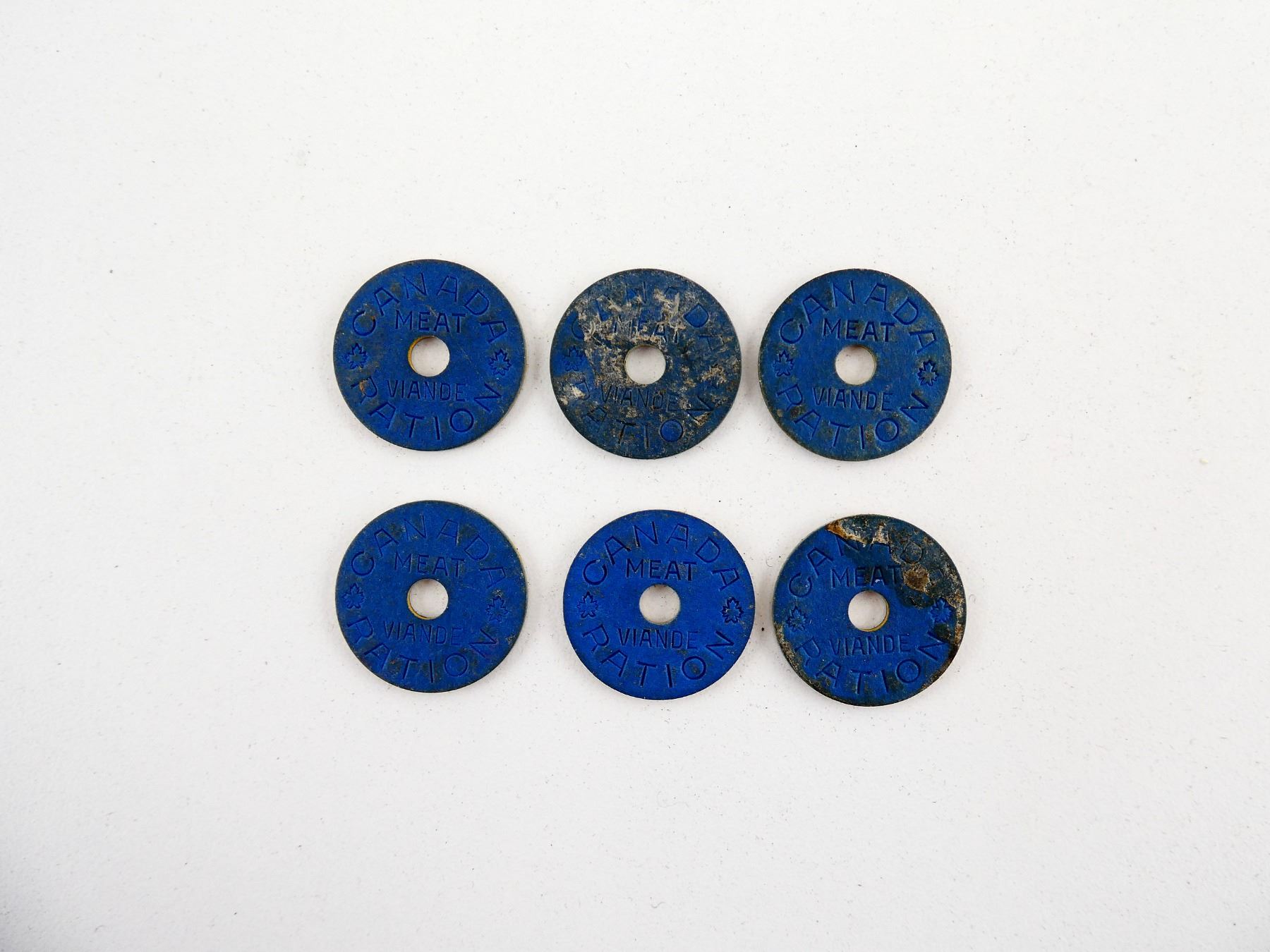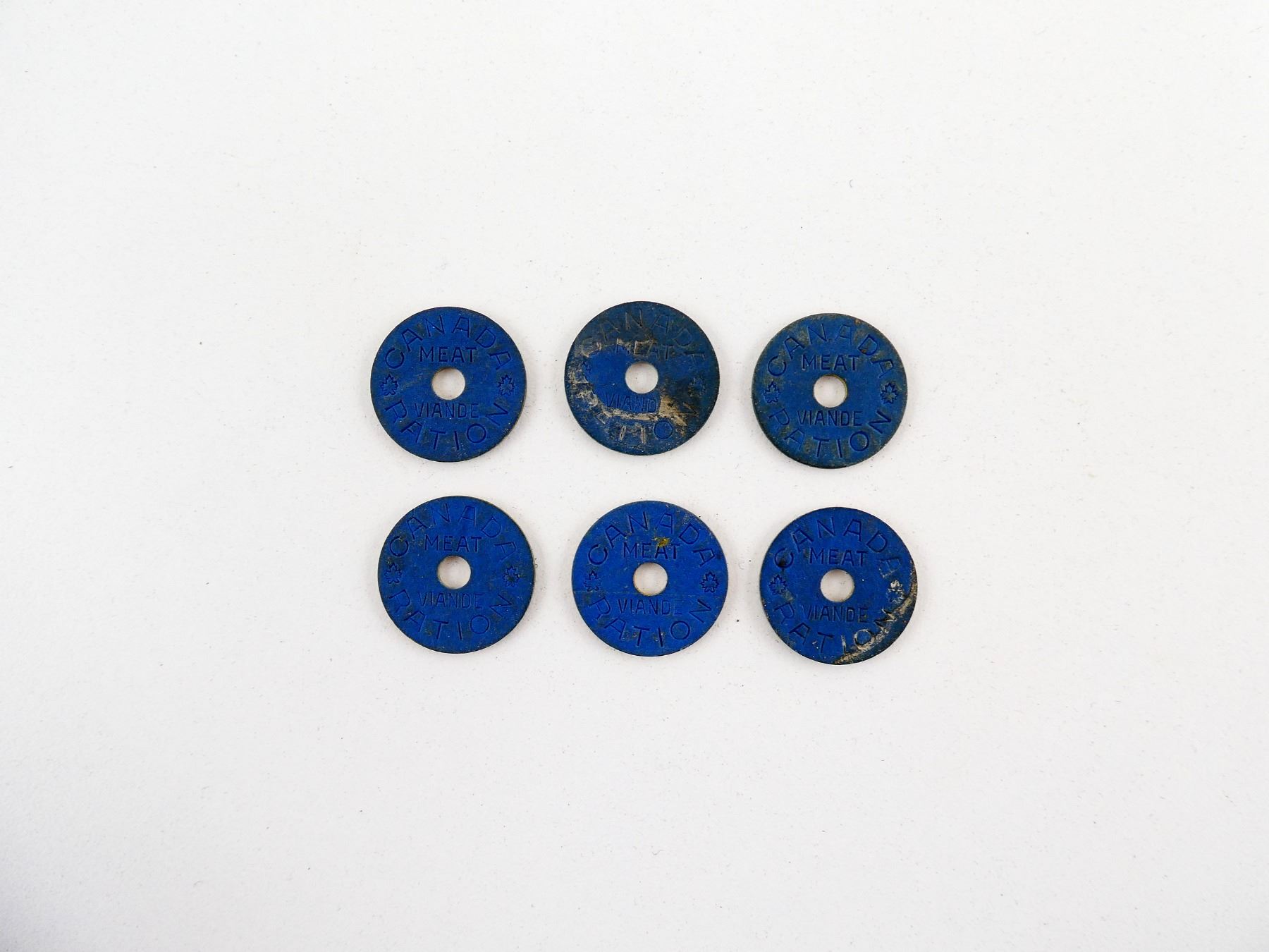 LOT INCLUDES; (6) MEAT RATION TOKENS, BLUE COLOURED, WOOD CONSTRUCTION, MARKED: "CANADA, RATION, MEAT, VIANDE", SHOWS SOME WEAR, APPROX. 7/8" DIA. SEE PHOTOS.