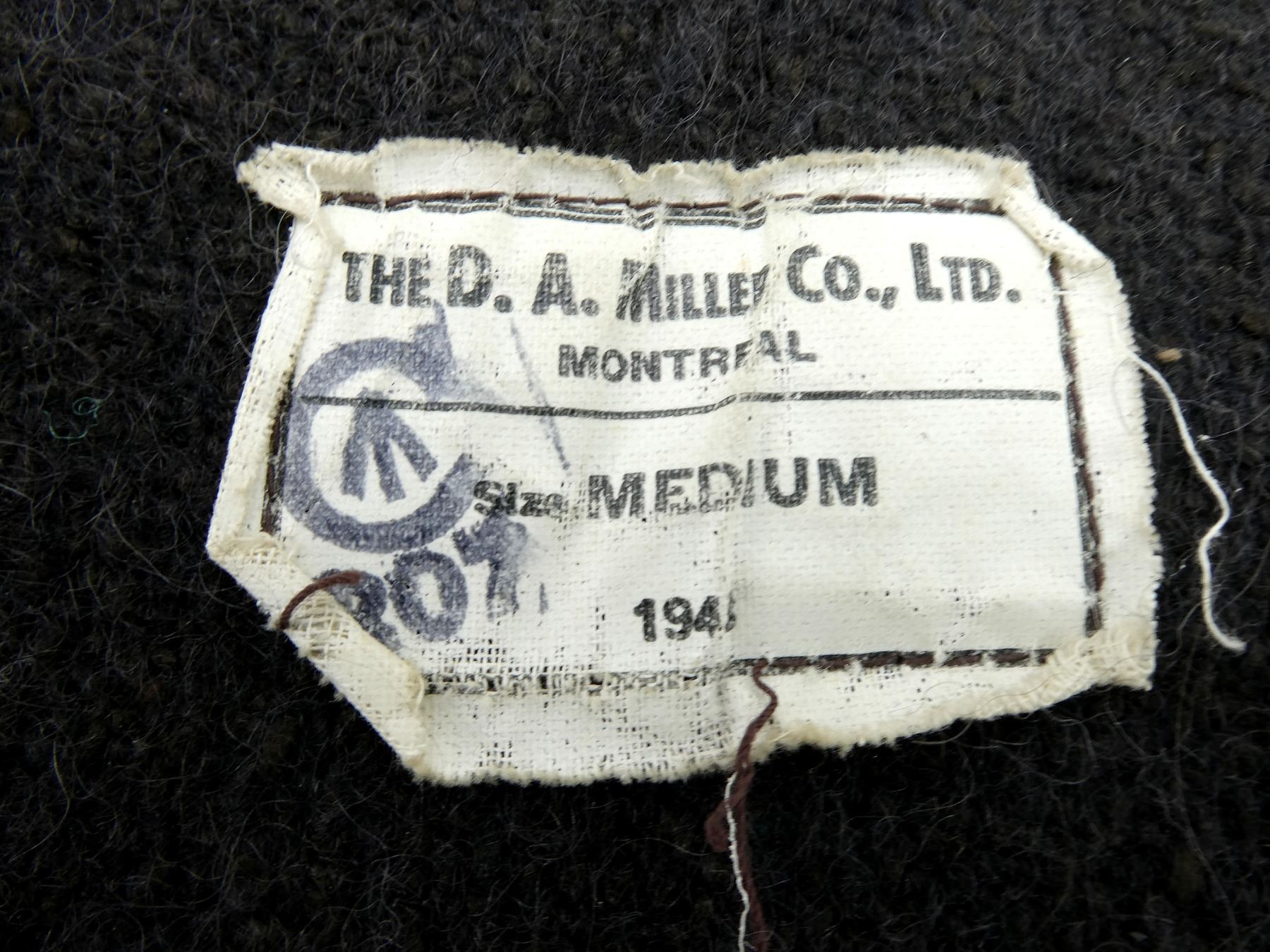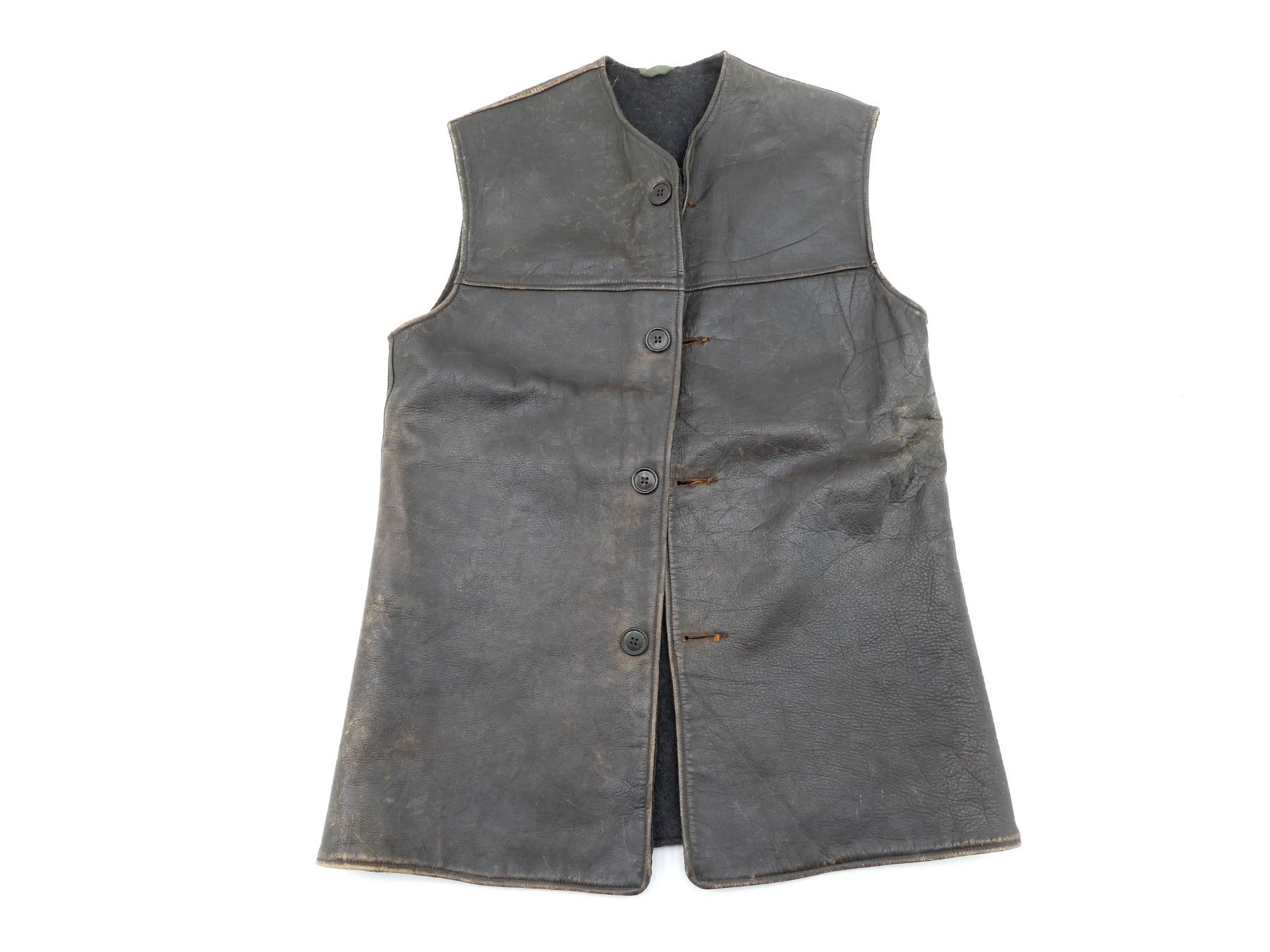 (1) BROWN LEATHER JERKIN WITH NAVY BLUE / BLACK WOOL LINING, LABEL MARKED: "THE D.A. MILLER CO., LTD., MONTREAL, SIZE MEDIUM, 1943" WITH INK STAMPED C-BROAD ARROW OVER "207", BUTTON FRONT, SHOWS AGE / WEAR & SHOULDER WIDTH APPROX. 18". SEE PHOTOS.