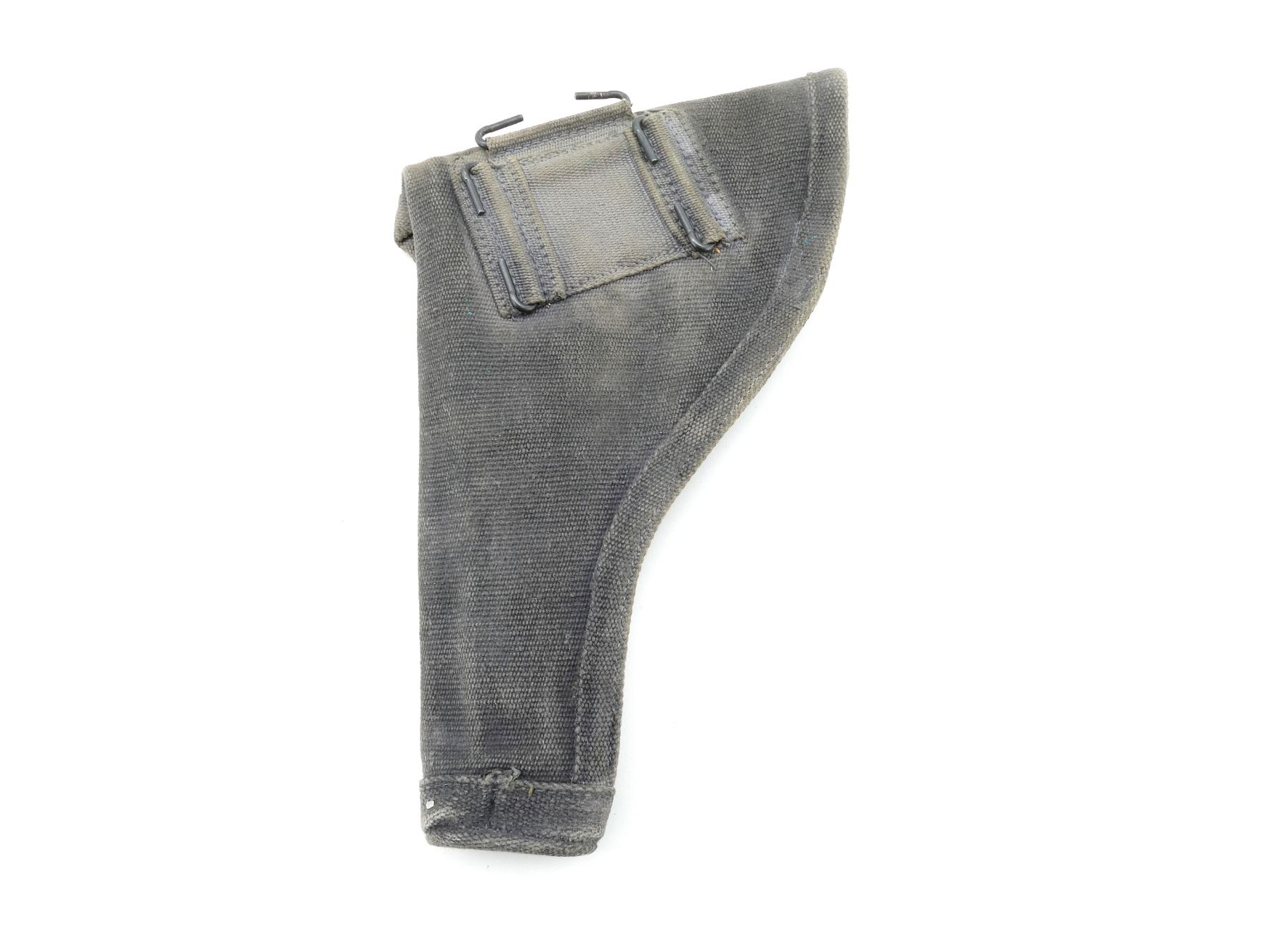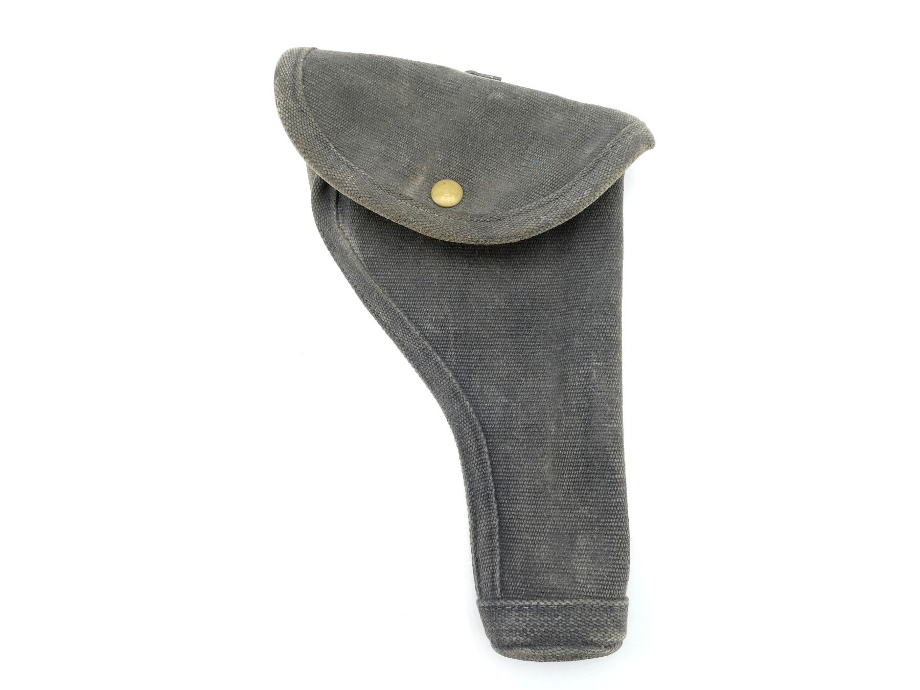 (1) BLACKENED P37 WEB CANVAS REVOLVER HOLSTER, FITS LARGE FRAME WEBLEY & S&W REVOLVERS, MARKED: "Z.L.&T. LTD., 1943" WITH C-BROAD ARROW, METAL BELT HOOKS & OVERALL LENGTH APPROX. 10". SEE PHOTOS.
