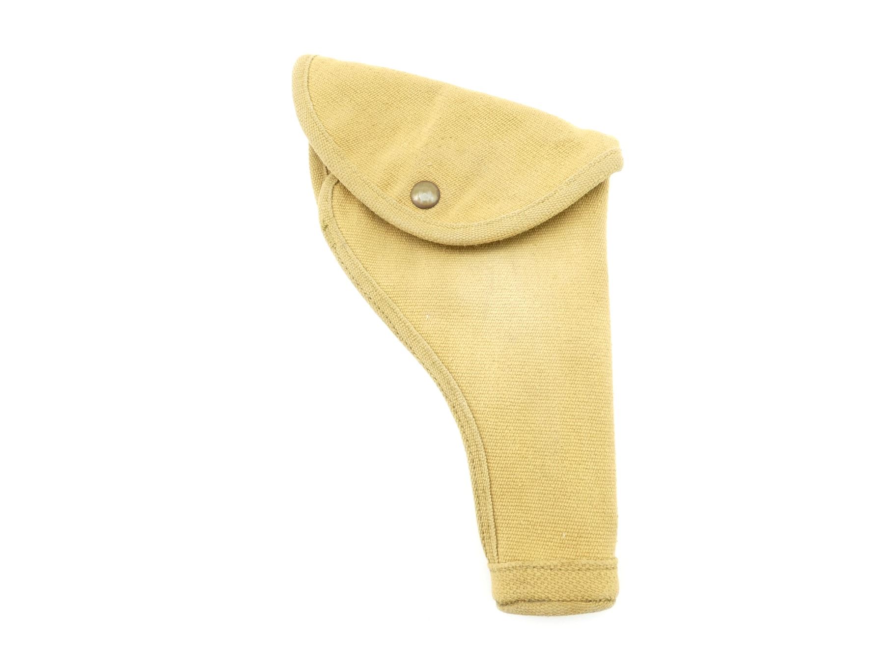 (1) TAN P37 WEB CANVAS REVOLVER HOLSTER, FITS LARGE FRAME WEBLEY & S&W REVOLVERS, MARKED: "Z.L.&T. LTD., 1943" WITH C-BROAD ARROW, METAL BELT HOOKS & OVERALL LENGTH APPROX. 9.25". SEE PHOTOS.