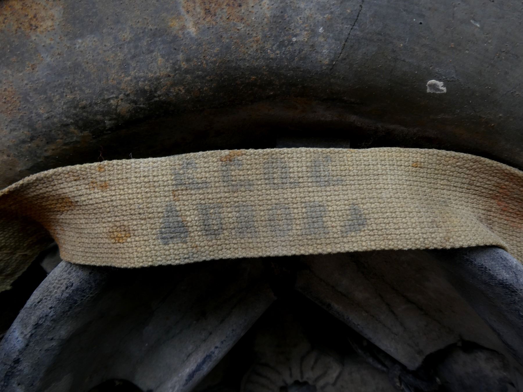 (1) GREEN PAINTED STEEL WITH BLACK LEATHER HEAD LINER, LINER IS STIFF, TAN CANVAS & METAL CHIN STRAP MARKED: "R.C.O.C., AURORA", FAINTLY MARKED: "C.L./C. (CANADIAN LAMP CO.) 1942, 84" ON REAR SKIRT, HEAD LINER MARKED WITH VARIOUS FAINT / UN-CLEAR MARKINGS. SEE PHOTOS.