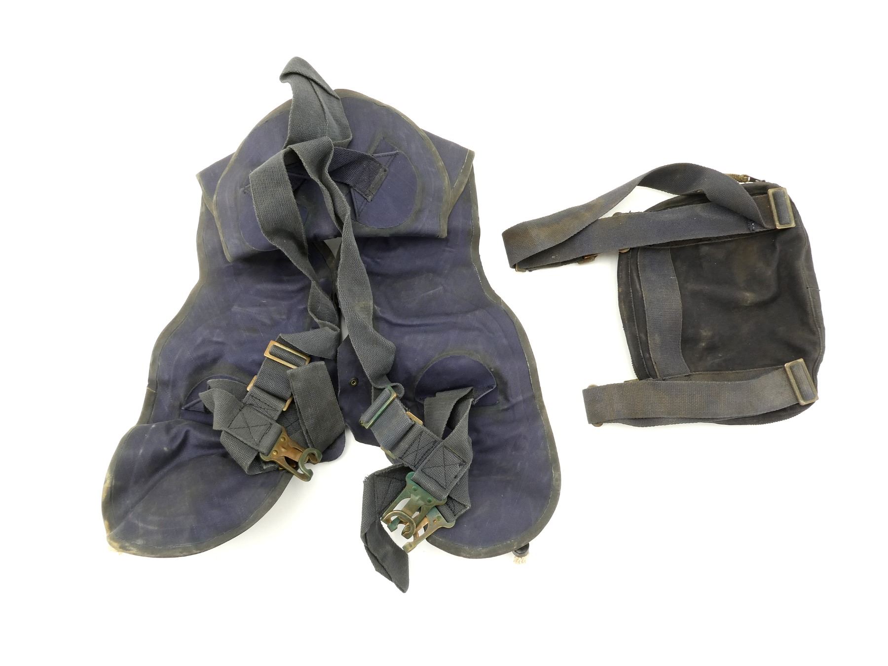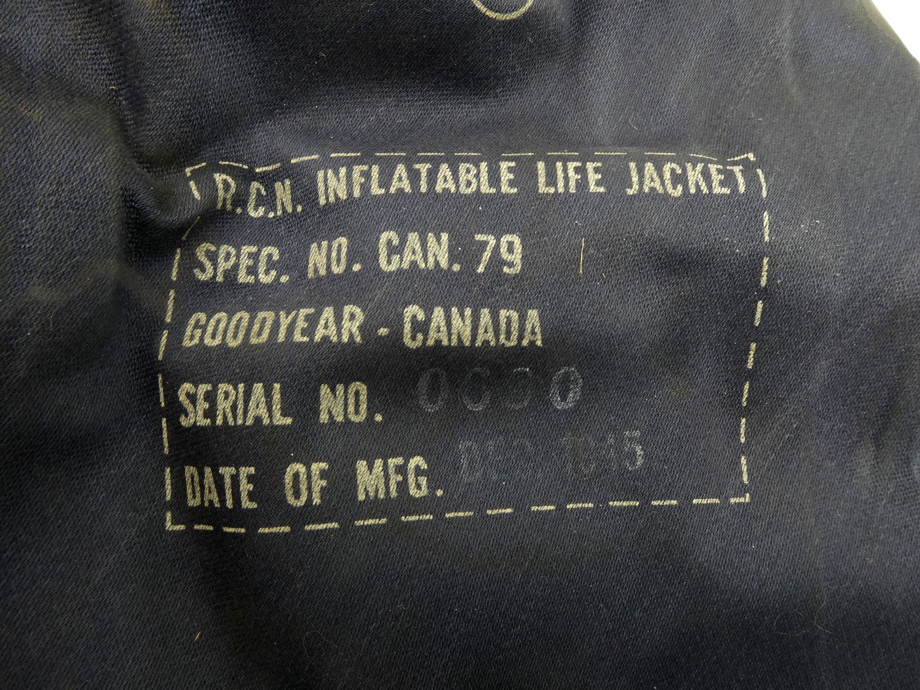 LOT INCLUDES; (1) RCN BLUE RUBBERIZED CANVAS LIFE JACKET, MARKED: "R.C.N. INFLATABLE LIFE JACKET, SPEC. NO. CAN. 79, GOODYEAR-CANADA, SERIAL NO. 0690, DATE OF MFG. DEC. 1945", CANVAS HARNESS ATTACHED, SHOWS AGE / WEAR & (1) BLUE CANVAS CARRIER BAG, MARKED: "RCN LIFE JACKET 0690", WITH BLUE CANVAS SHOULDER STRAPS, ZIPPERED (WORKS), SHOWS AGE / WEAR. SEE PHOTOS.