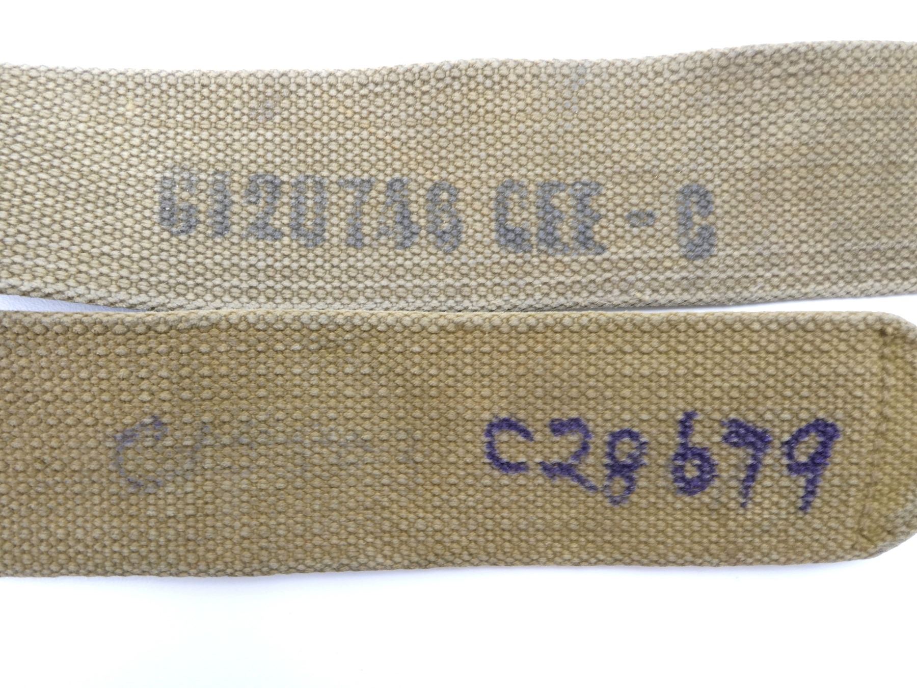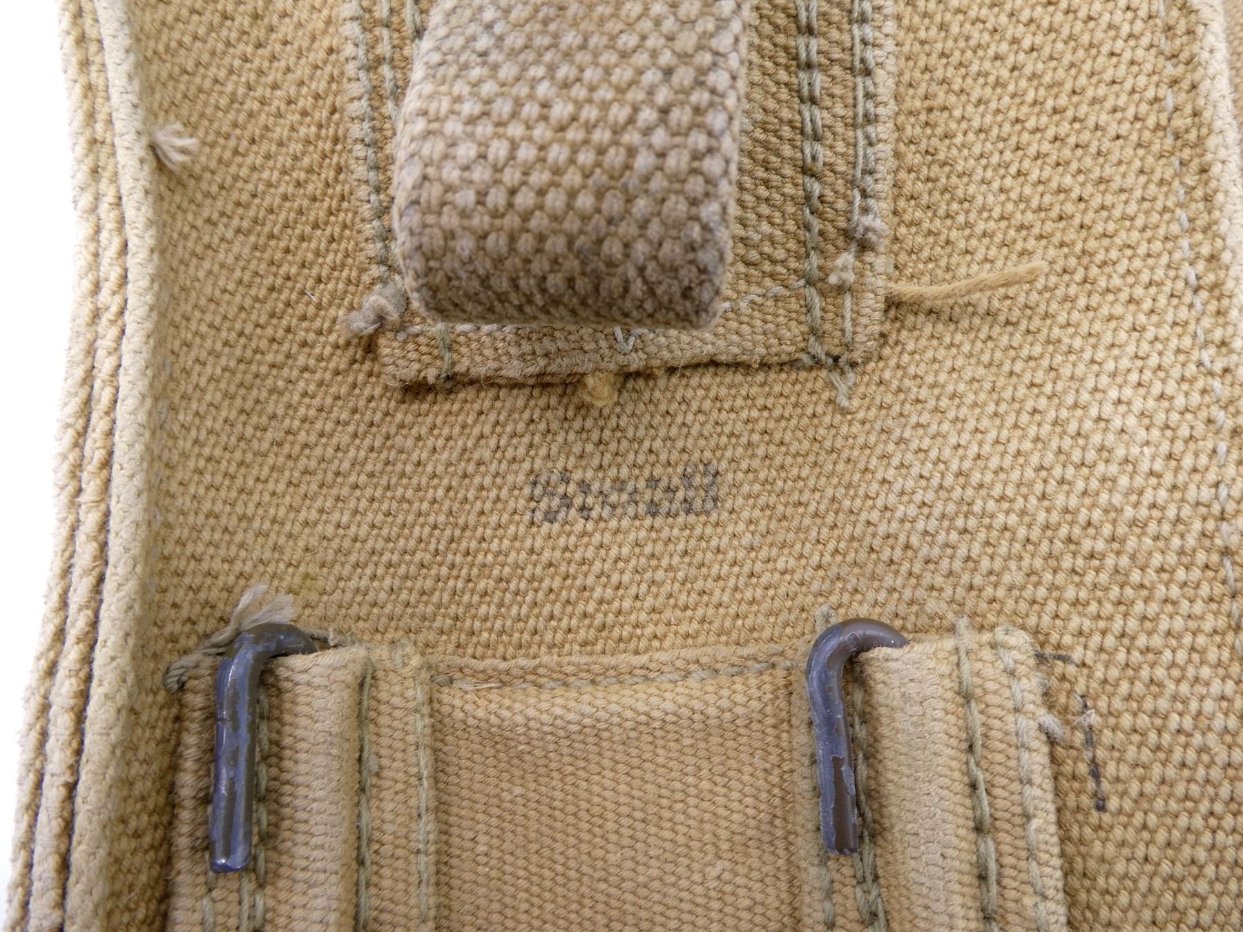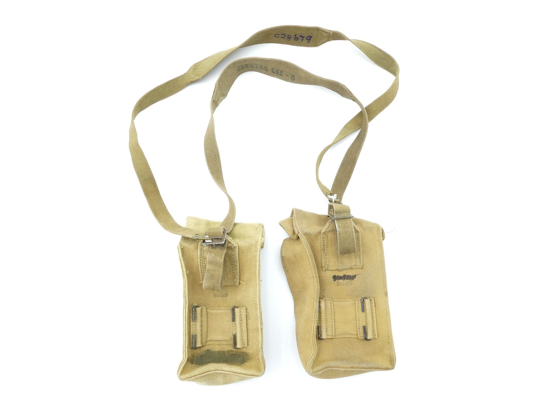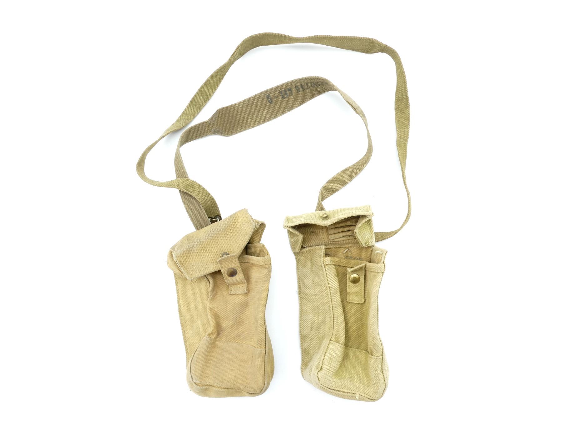LOT INCLUDES; (2) TAN P37 WEB AMMO POUCHES, ONE FAINTLY MARKED: "Z.L.&???? ?943", "20??", "SMALL", OTHER MARKED: "Z.L.&???? 1943", "4029", "SMALL", BRASS FITTINGS & (2) TAN P37 WEB SHOULDER STRAPS, ONE MARKED: "G1207?6 CEE-G", OTHER HAND-WRITTEN MARKED: "C28679", ALL SHOWS AGE / WEAR. SEE PHOTOS.