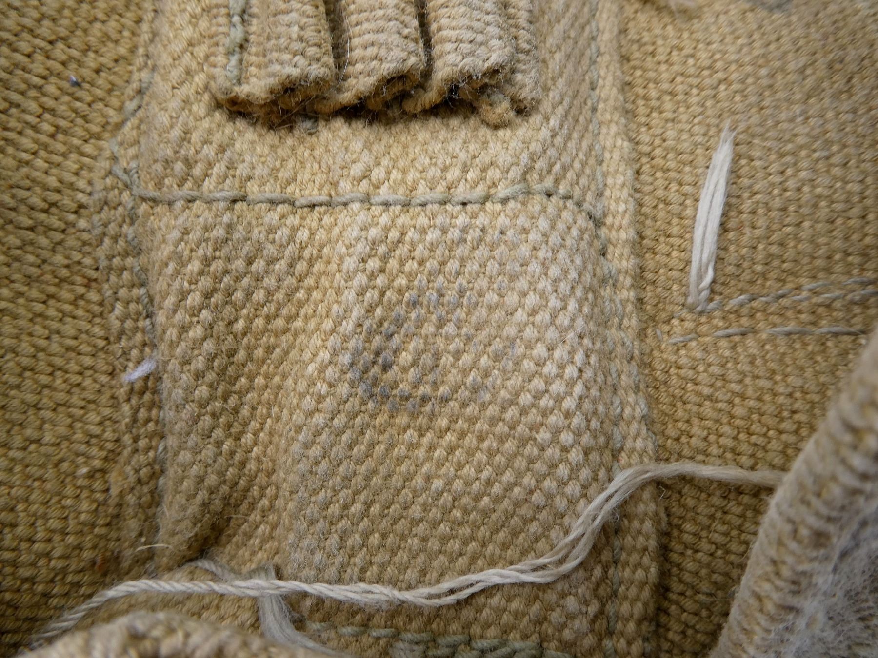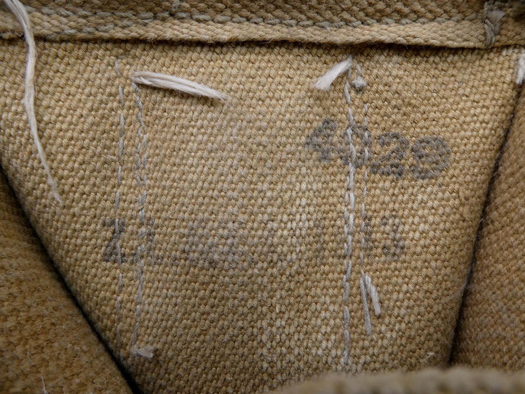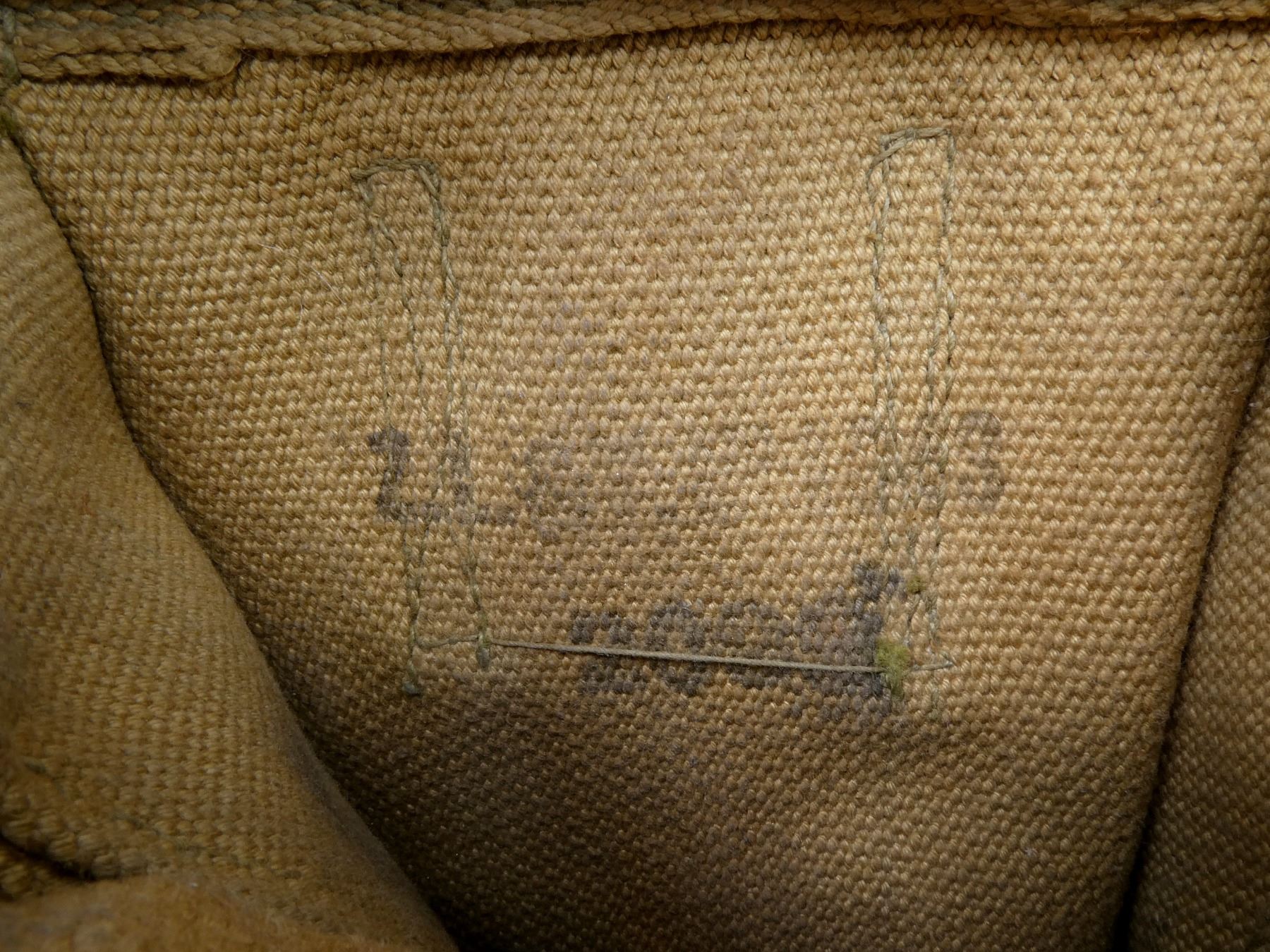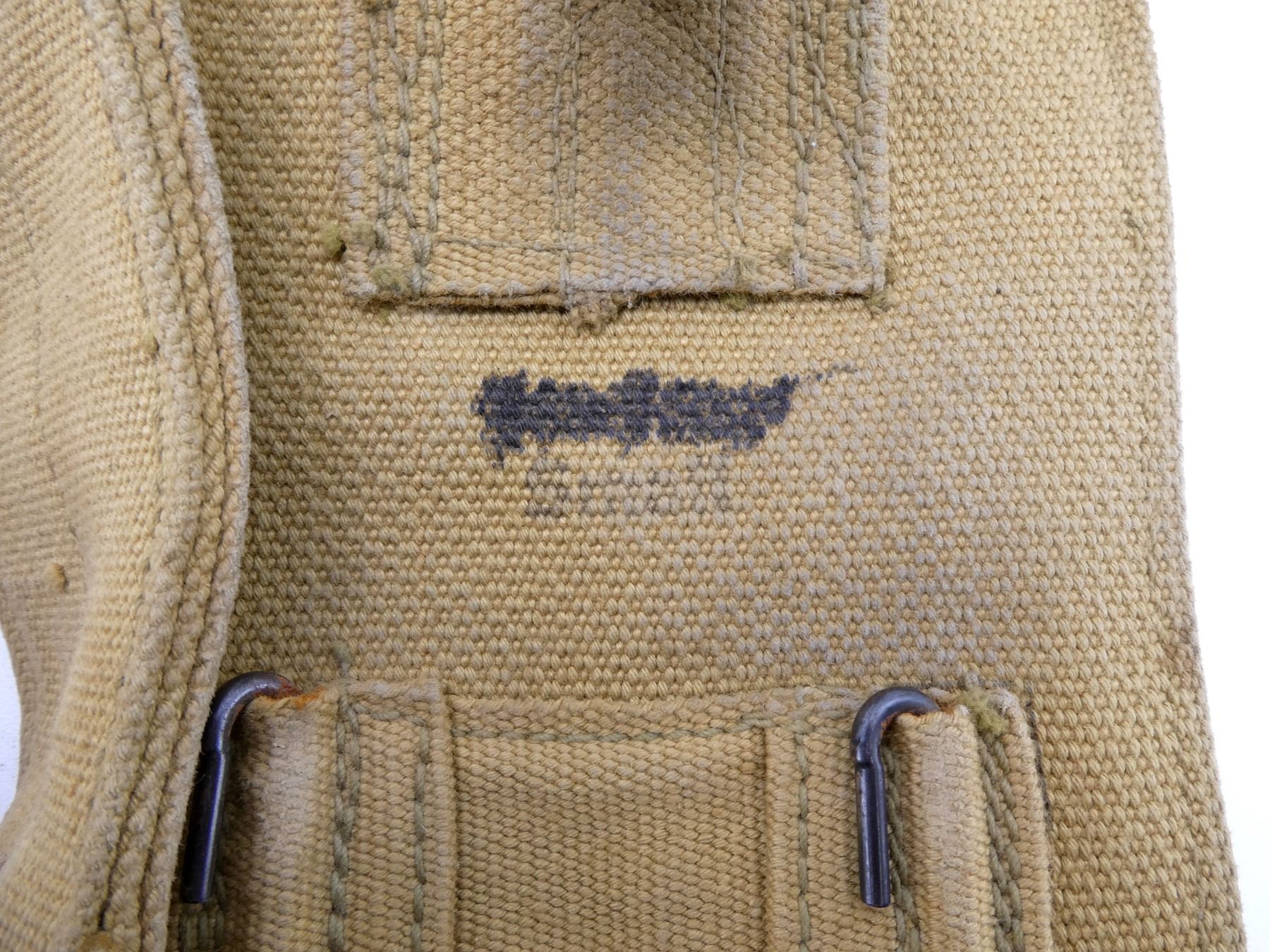 LOT INCLUDES; (2) TAN P37 WEB AMMO POUCHES, ONE FAINTLY MARKED: "Z.L.&???? ?943", "20??", "SMALL", OTHER MARKED: "Z.L.&???? 1943", "4029", "SMALL", BRASS FITTINGS & (2) TAN P37 WEB SHOULDER STRAPS, ONE MARKED: "G1207?6 CEE-G", OTHER HAND-WRITTEN MARKED: "C28679", ALL SHOWS AGE / WEAR. SEE PHOTOS.