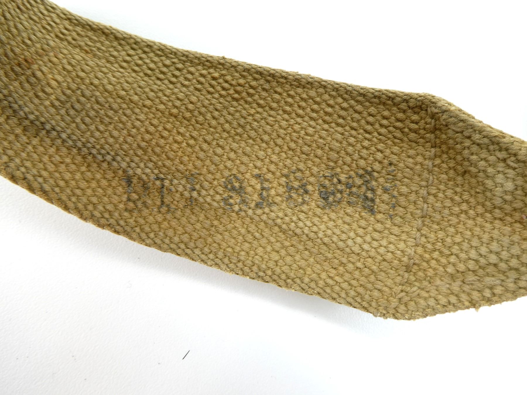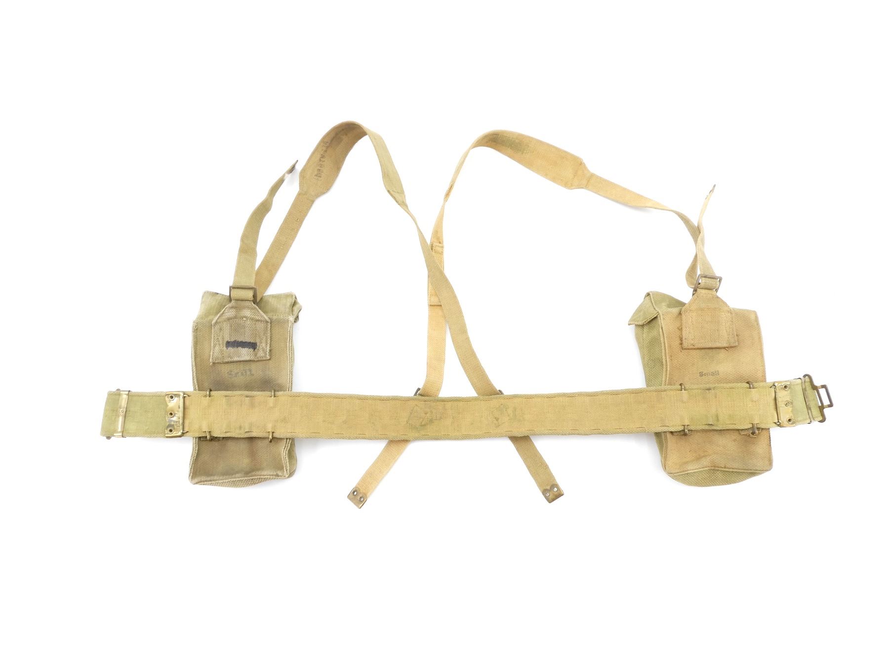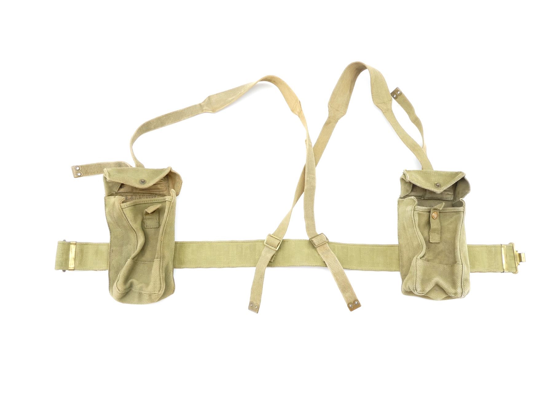 LOT INCLUDES; (1) TAN P37 WEB BELT, NO VISIBLE MARKINGS, BRASS FITTINGS, OVERALL LENGTH APPROX. 38.5", ADJUSTABLE, (2) WWII TAN P37 WEB AMMO POUCHES, ONE FAINTLY MARKED: "????? LTD 1940" WITH C-BROAD ARROW, "SMALL", OTHER MARKED: "Z.L.&T.LTD 1942" WITH C-BROAD ARROW, "SMALL", BRASS FITTINGS & (2) TAN P37 WEB SHOULDER STRAPS, ONE HAS NO VISIBLE MARKINGS, OTHER HAS FAINT / UN-CLEAR MARKINGS, BRASS FITTINGS, ALL SHOWS AGE / WEAR. SEE PHOTOS.
