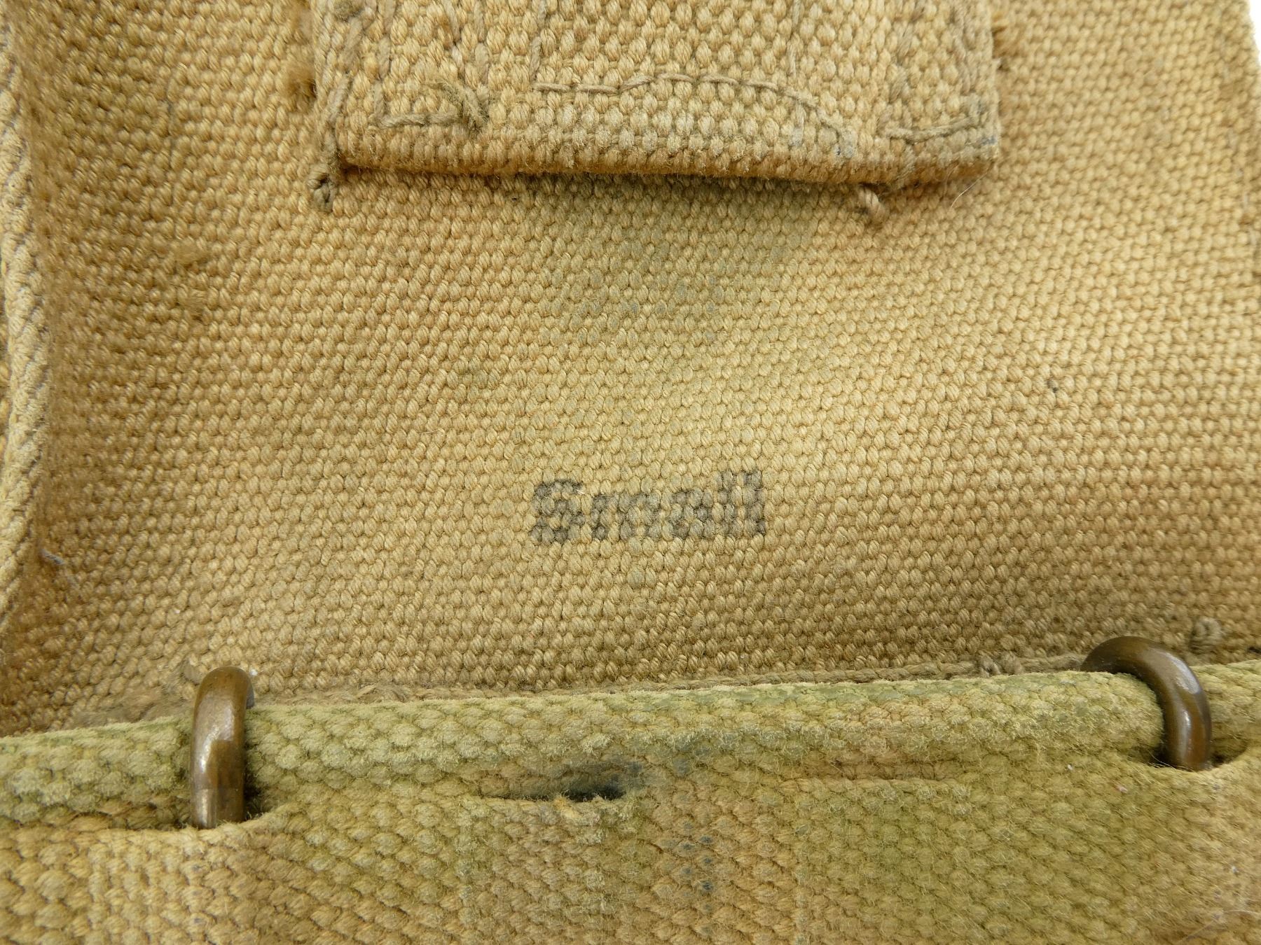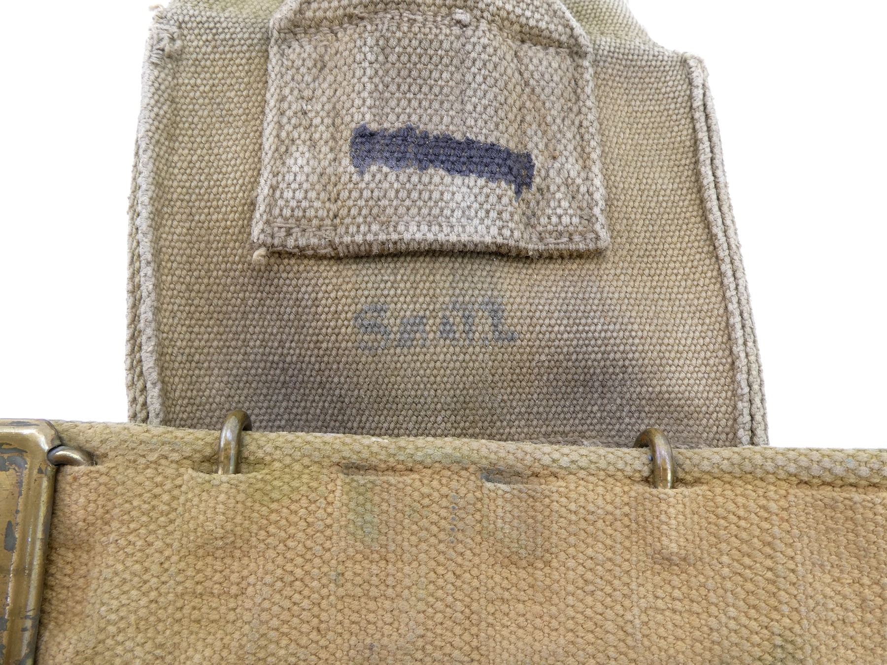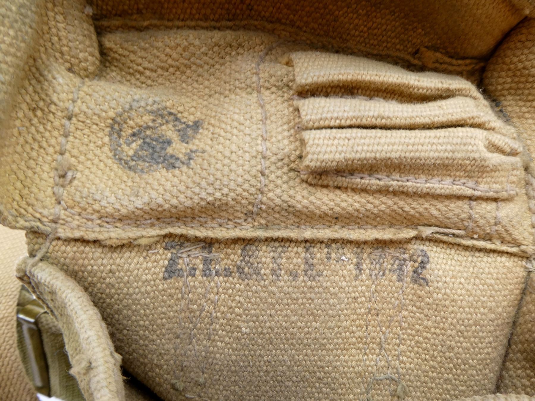 LOT INCLUDES; (1) TAN P37 WEB BELT, NO VISIBLE MARKINGS, BRASS FITTINGS, OVERALL LENGTH APPROX. 38.5", ADJUSTABLE, (2) WWII TAN P37 WEB AMMO POUCHES, ONE FAINTLY MARKED: "????? LTD 1940" WITH C-BROAD ARROW, "SMALL", OTHER MARKED: "Z.L.&T.LTD 1942" WITH C-BROAD ARROW, "SMALL", BRASS FITTINGS & (2) TAN P37 WEB SHOULDER STRAPS, ONE HAS NO VISIBLE MARKINGS, OTHER HAS FAINT / UN-CLEAR MARKINGS, BRASS FITTINGS, ALL SHOWS AGE / WEAR. SEE PHOTOS.
